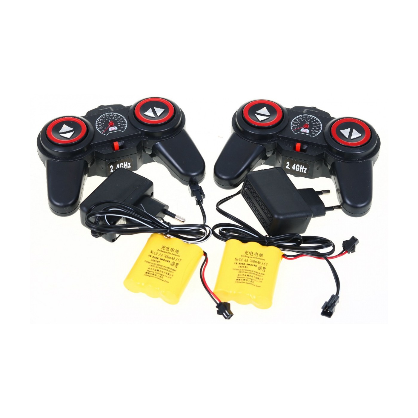 | - 2 samochody, - 2 piloty (2.4GHz) zasilane 2 bateriami typu AA (2 x 1,5V - brak w zestawie), - 2 akumulatory, - 2 ładowarki.