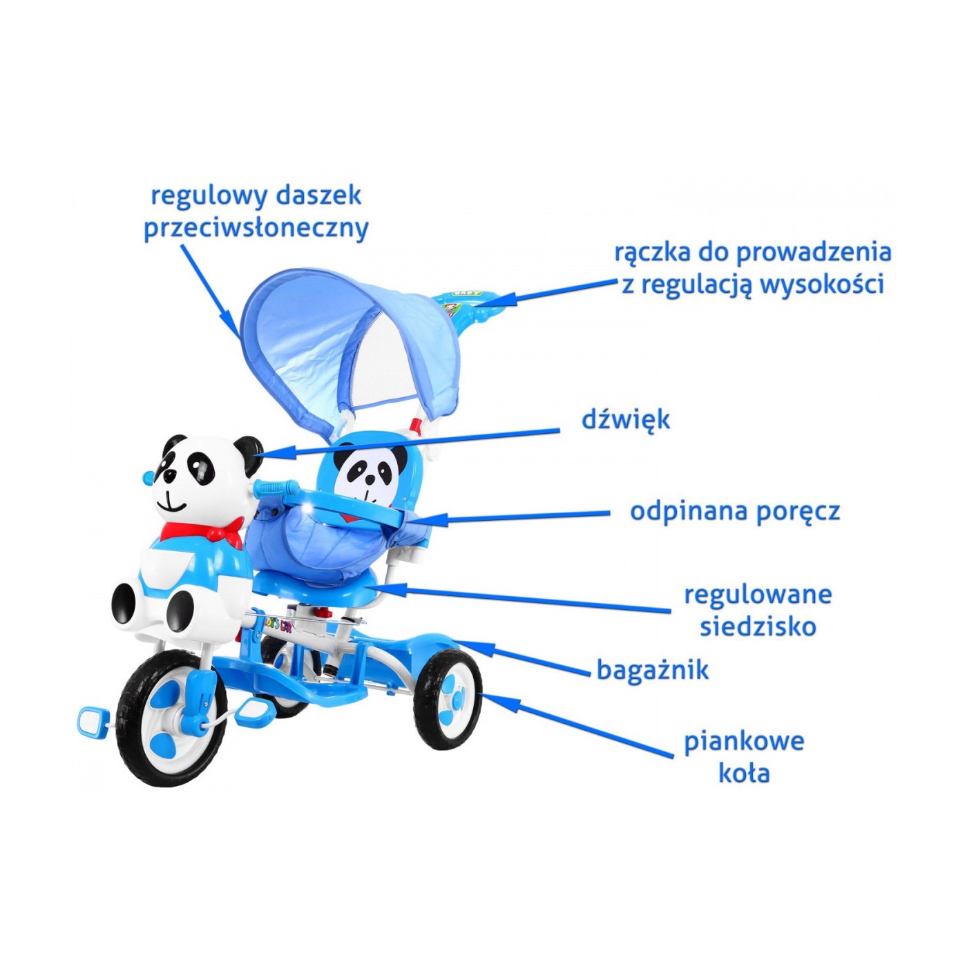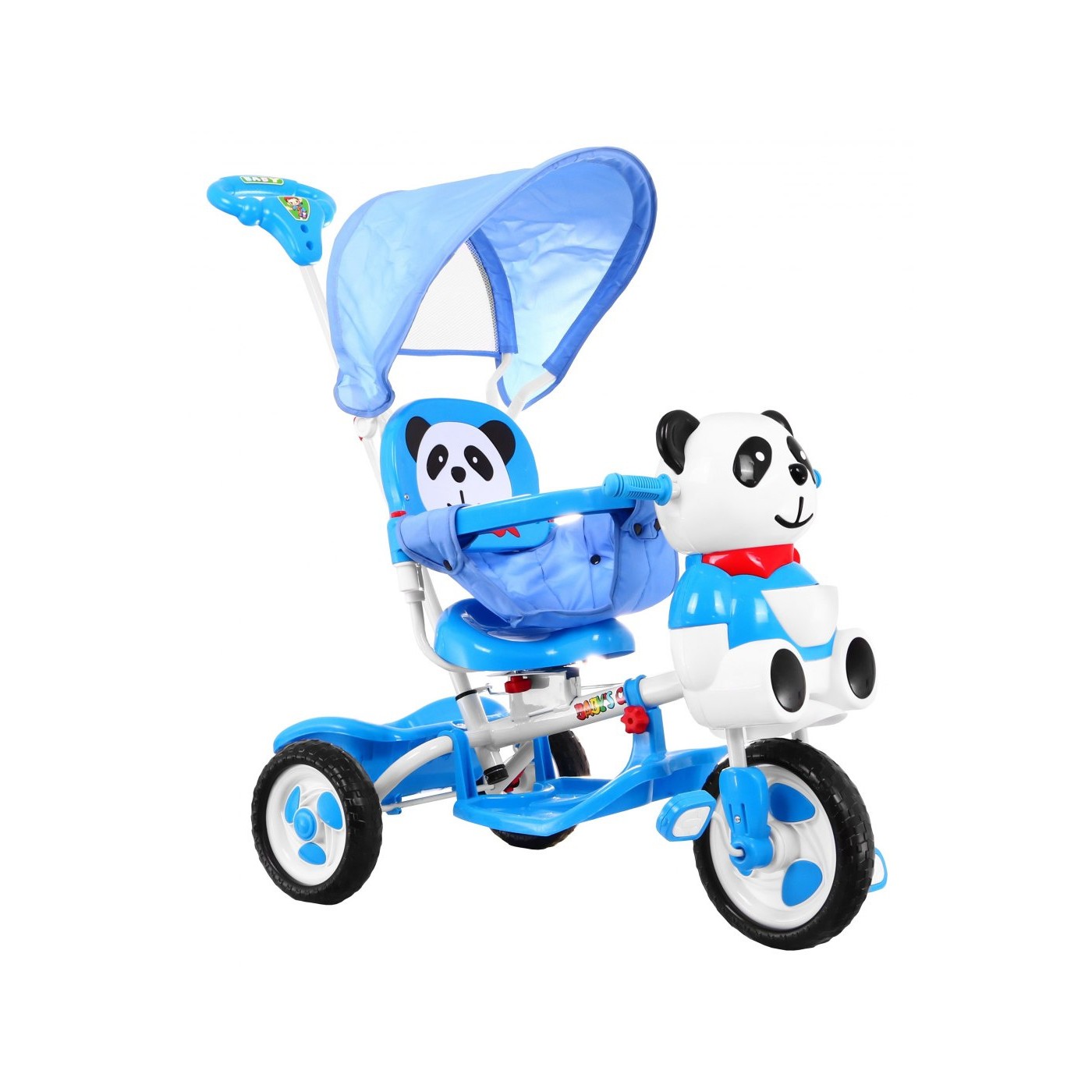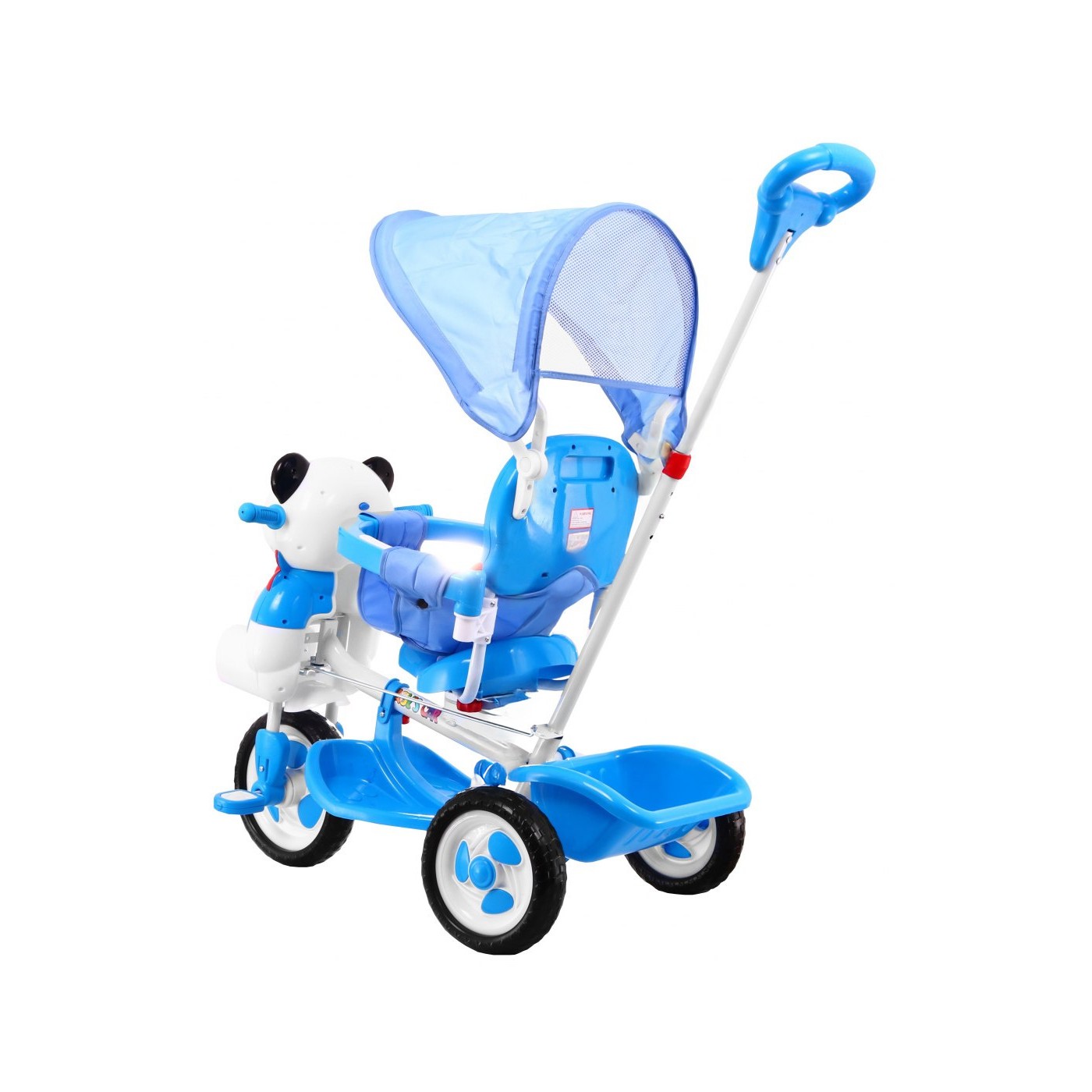 3-kolesový detský bicykel Panda Blue + zvuky + strieška + zábrana + opierka na nohy + rukoväť + úložný box