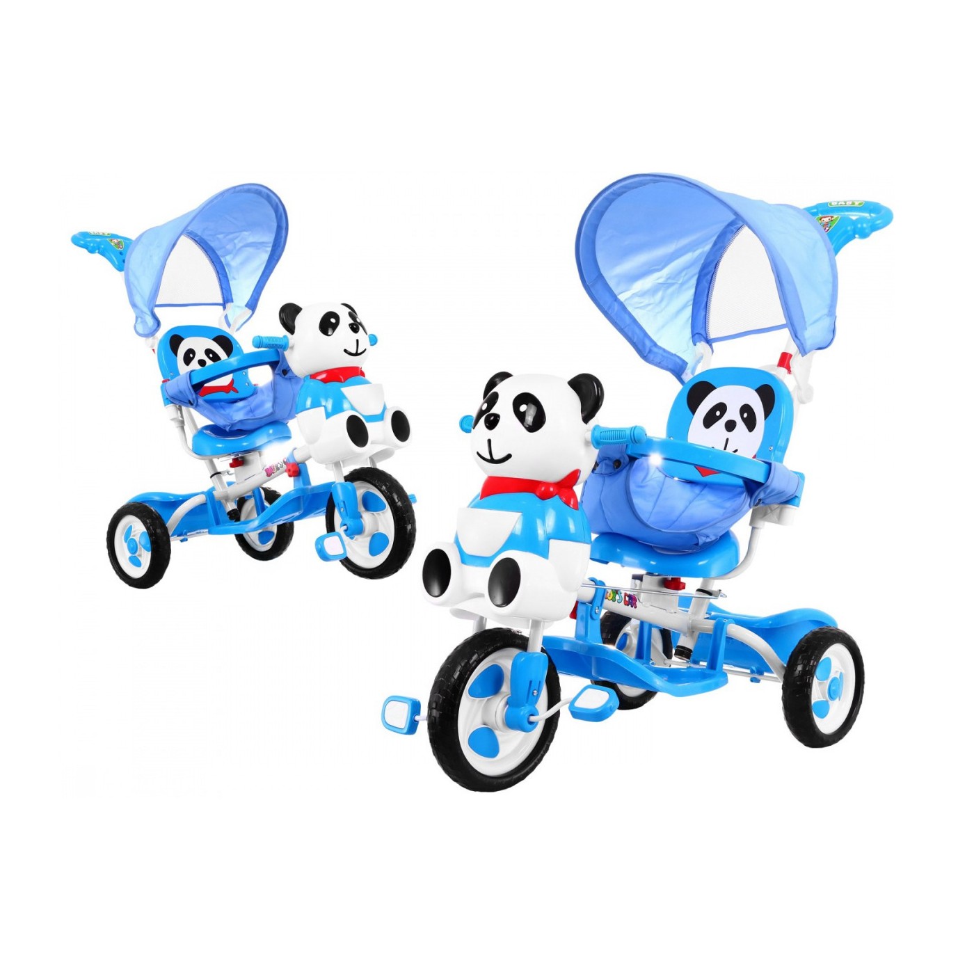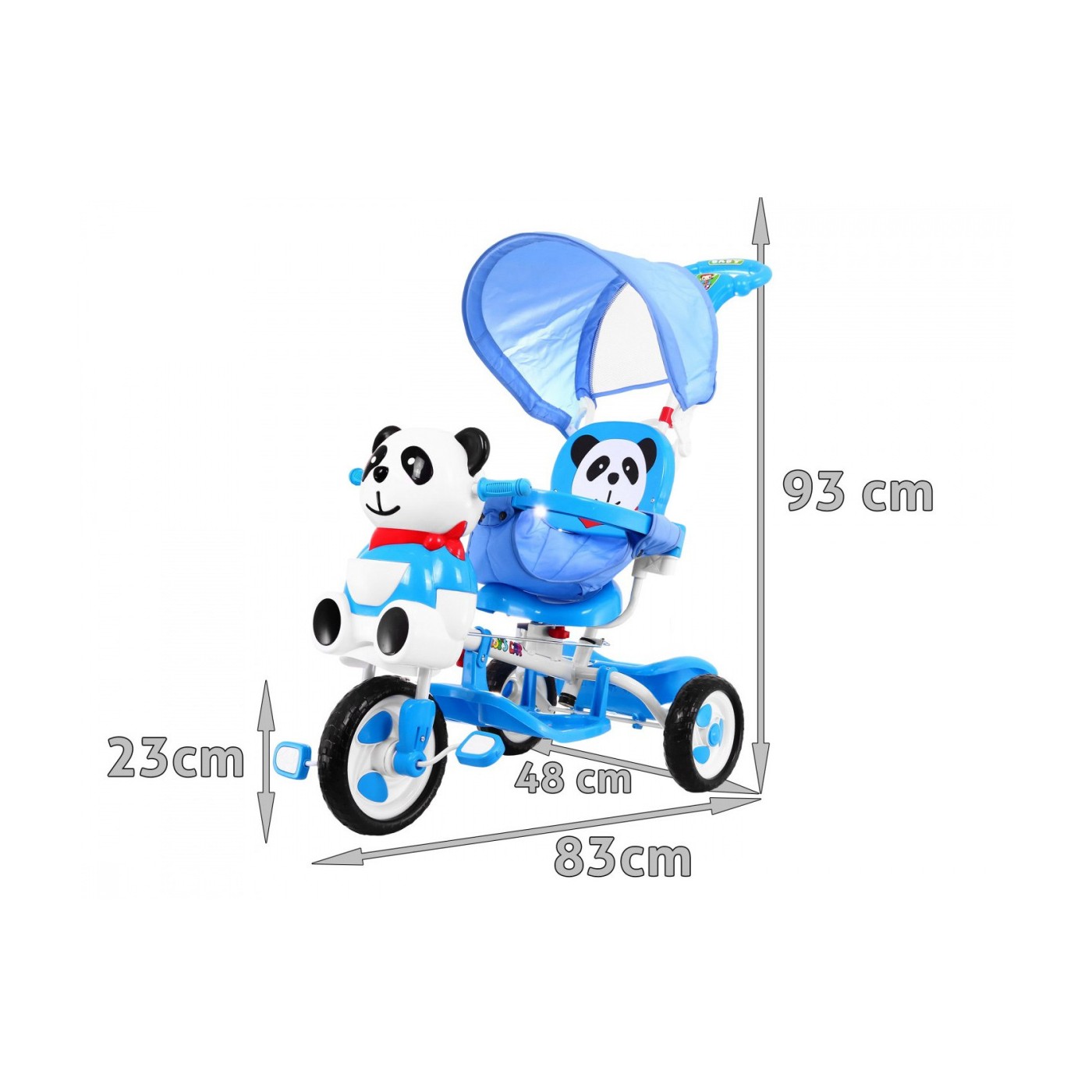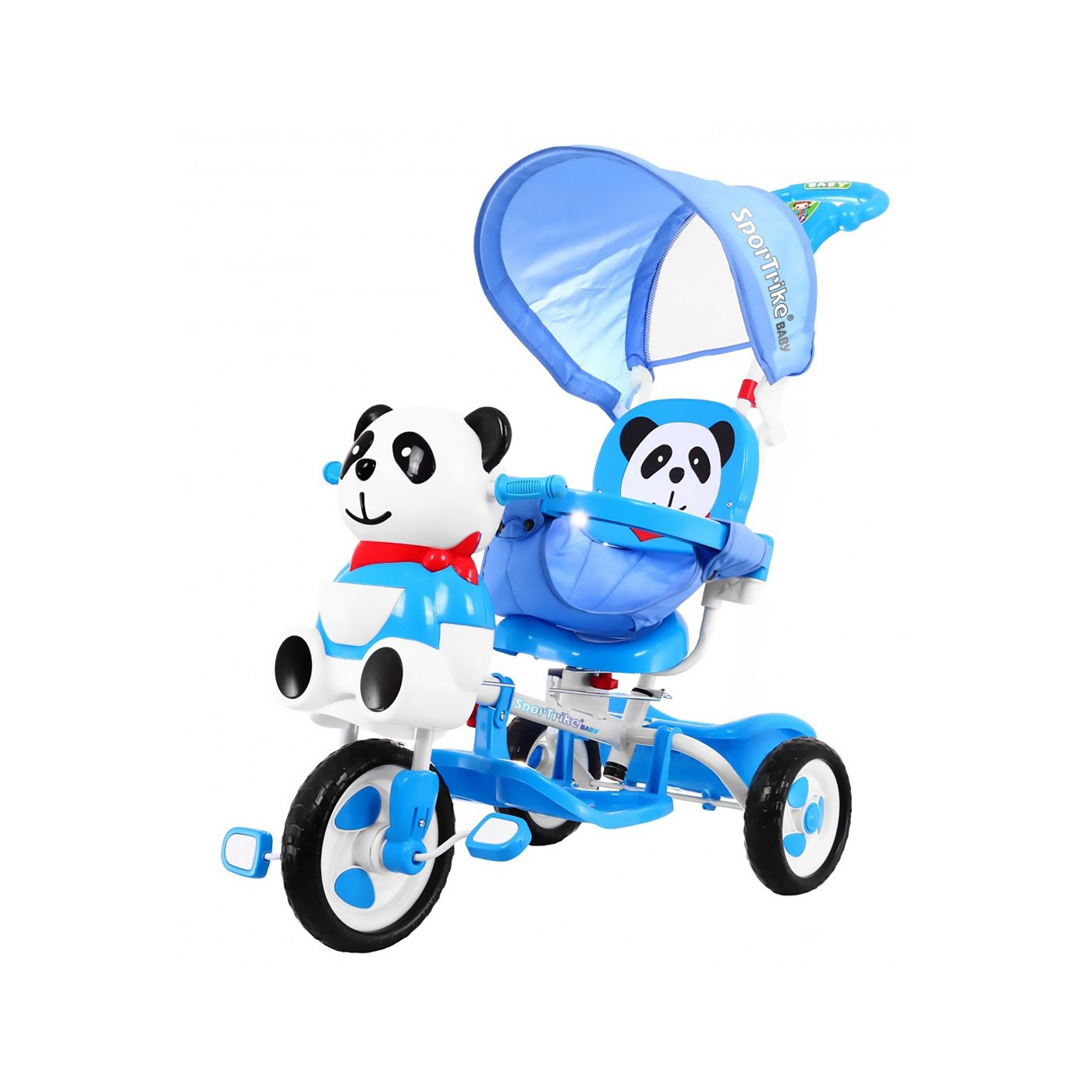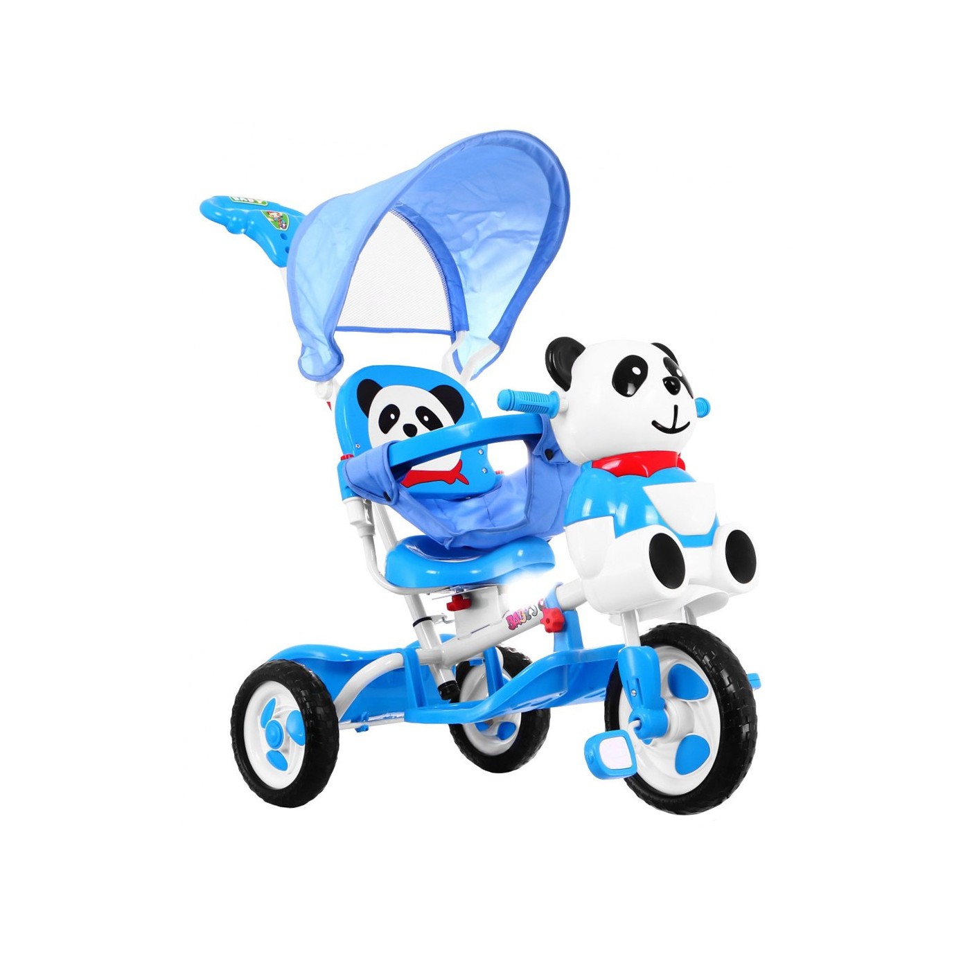 3-kolesový detský bicykel Panda Blue + zvuky + strieška + zábrana + opierka na nohy + rukoväť + úložný box