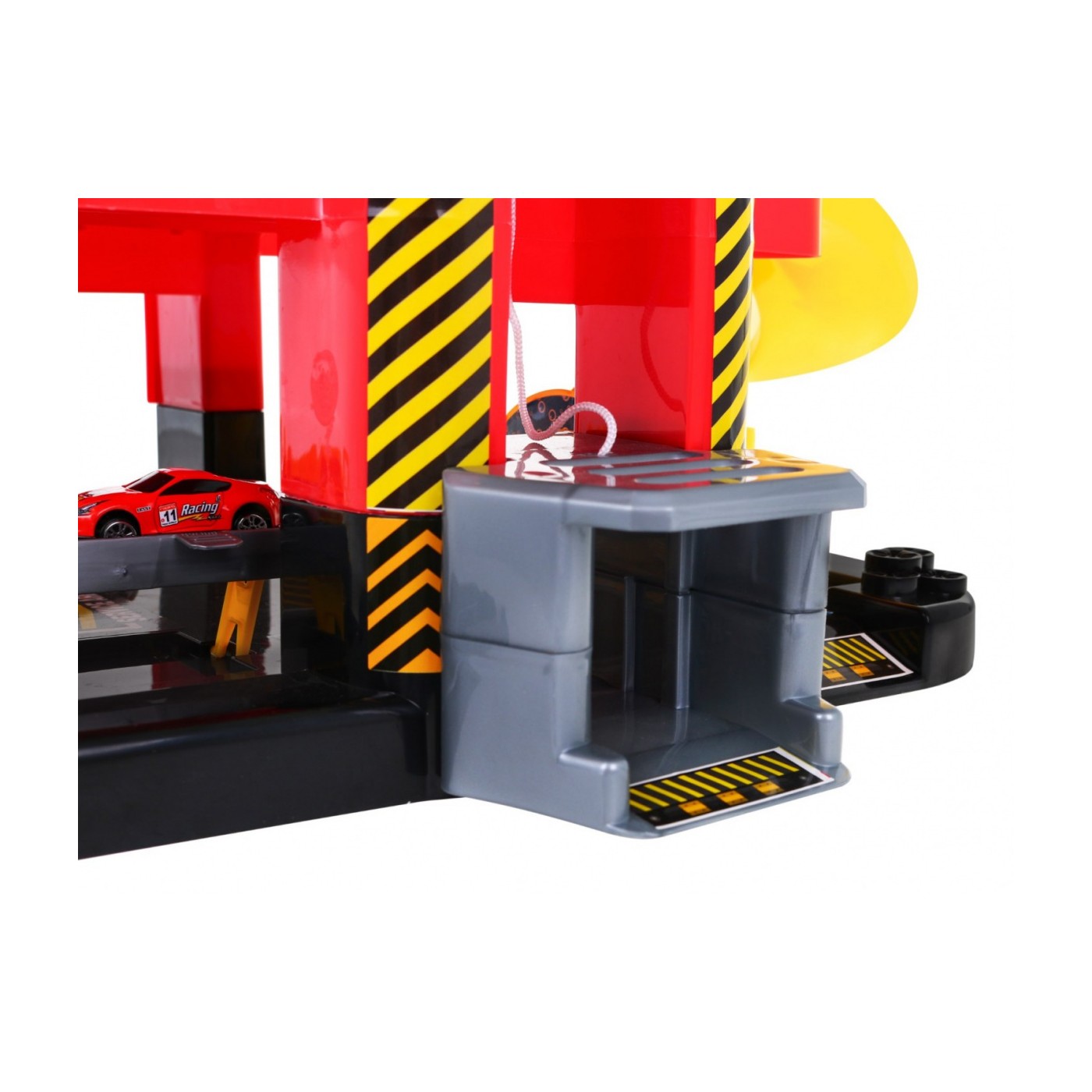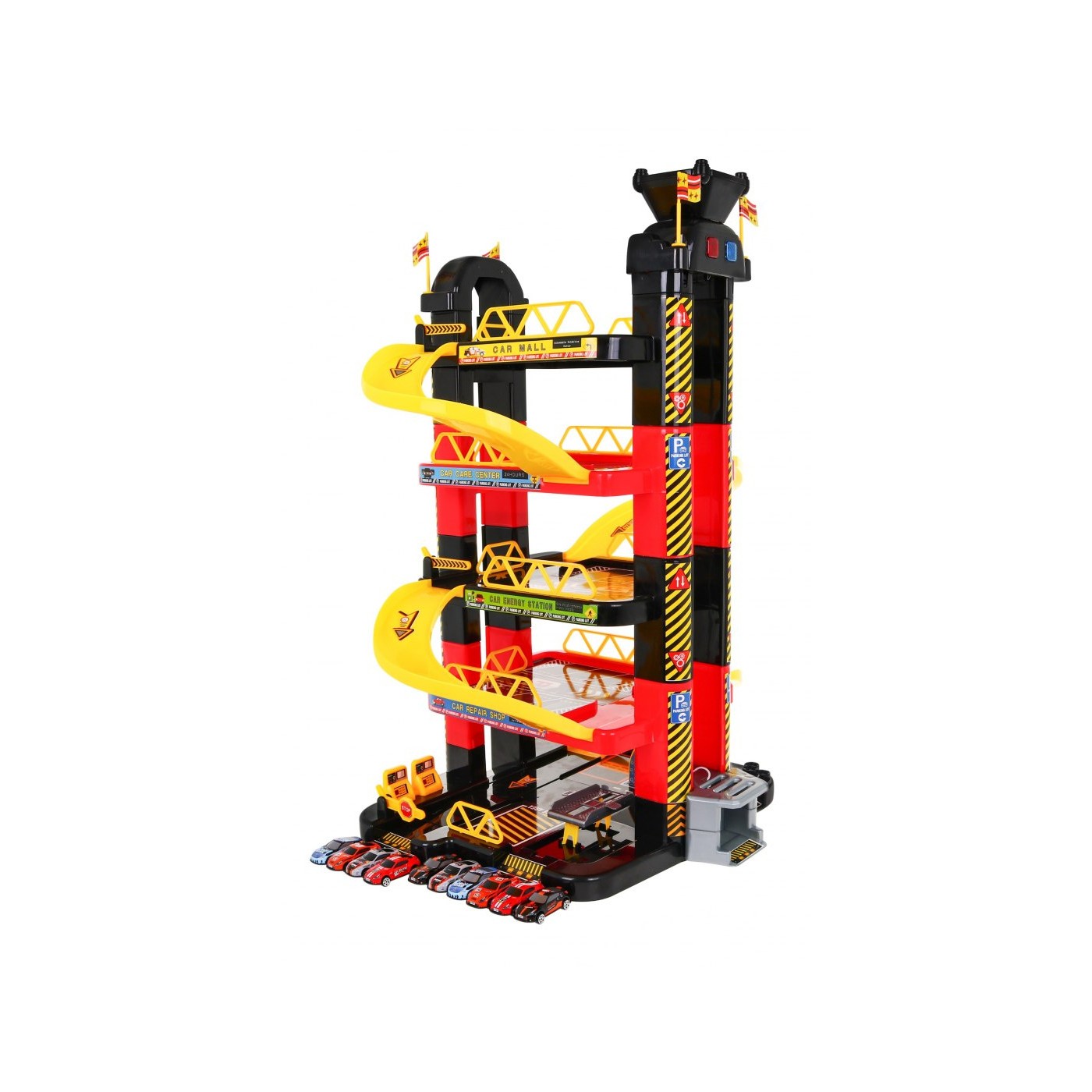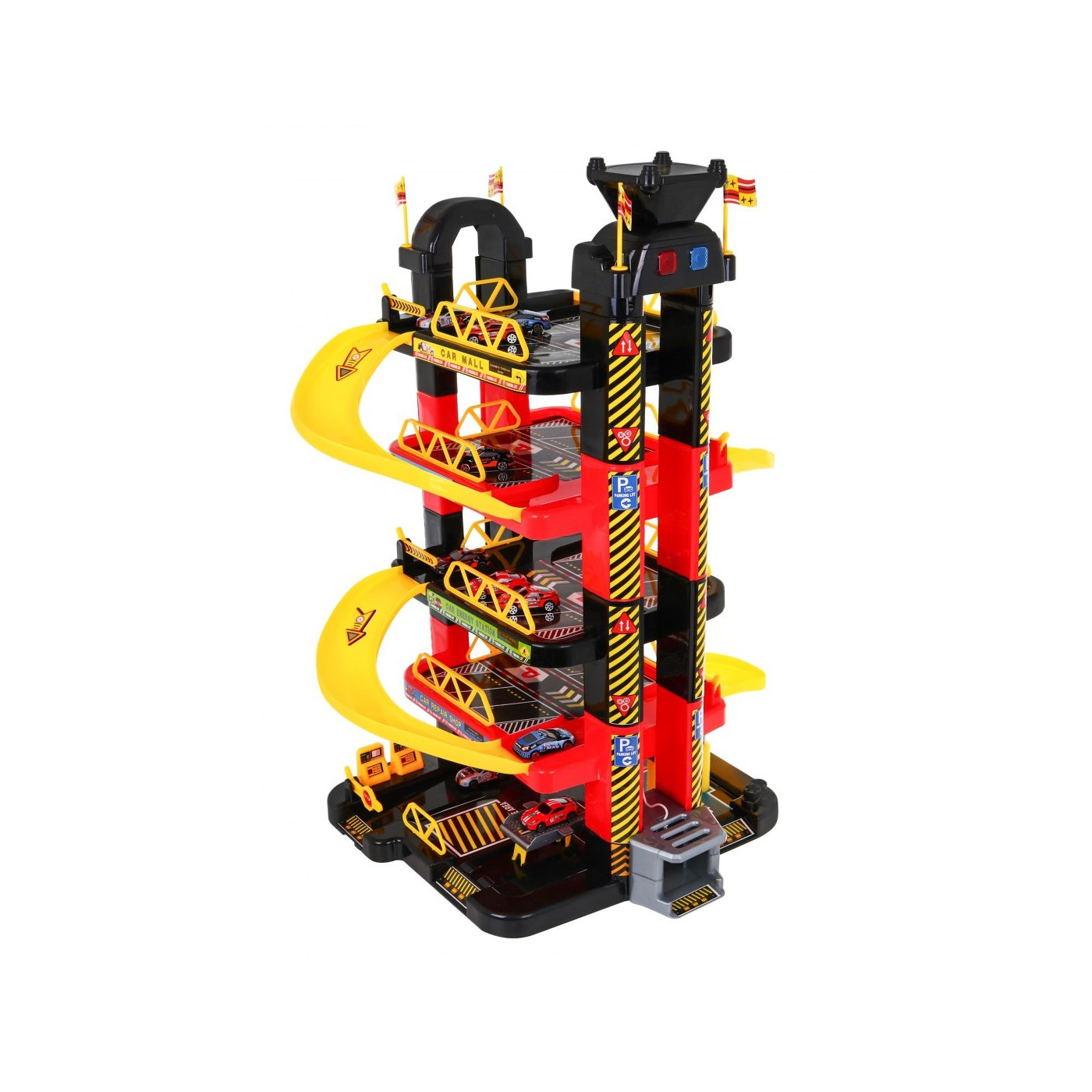 | | Wielopoziomowy duży parking, to zabawka dla dzieci od trzeciego roku życia. Parking składa się z 5 poziomów na które można dostać się za pomocą windy lub zjeżdżalni. Po drodze od poziomu do poziomu maluch napotka wiele atrakcji. Na poziomie dolnym znajduje się myjnia samochodowa, serwis samochodowy oraz stacja paliw. Poziom 2,3,4 i 5 to parkingi samochodowe. Na samej górze jest lądowisko dla helikoptera oraz winda z mrugającymi światełkami, jeżdżąca w górę i w dół, zasilana bateriami typu 3 x AA 1,5V których brak w zestawie. |