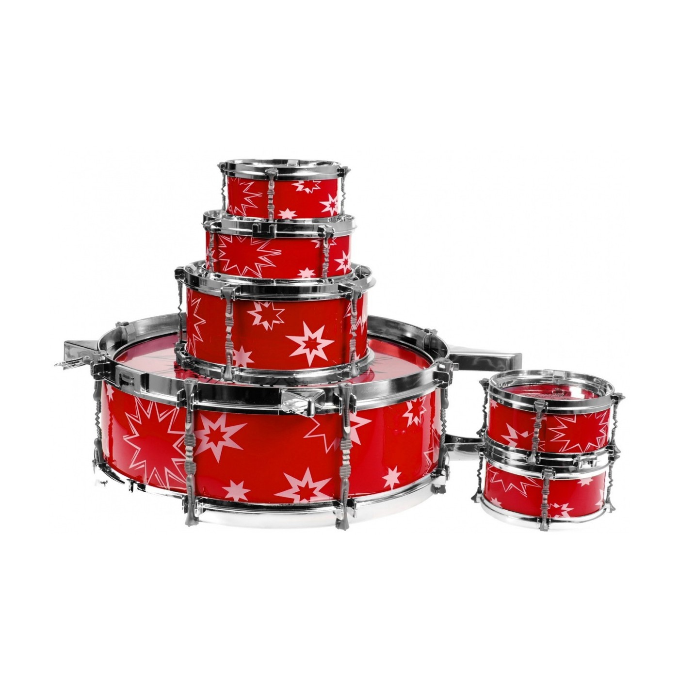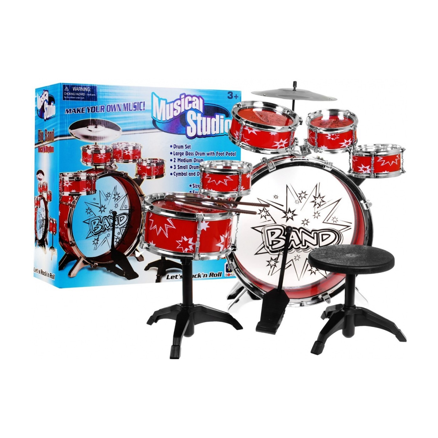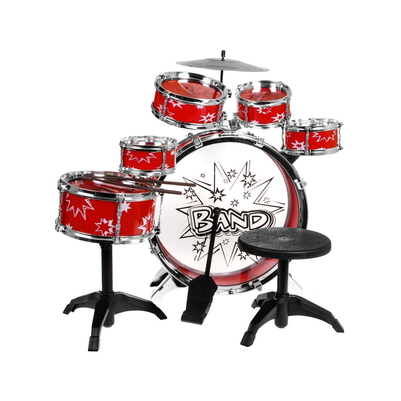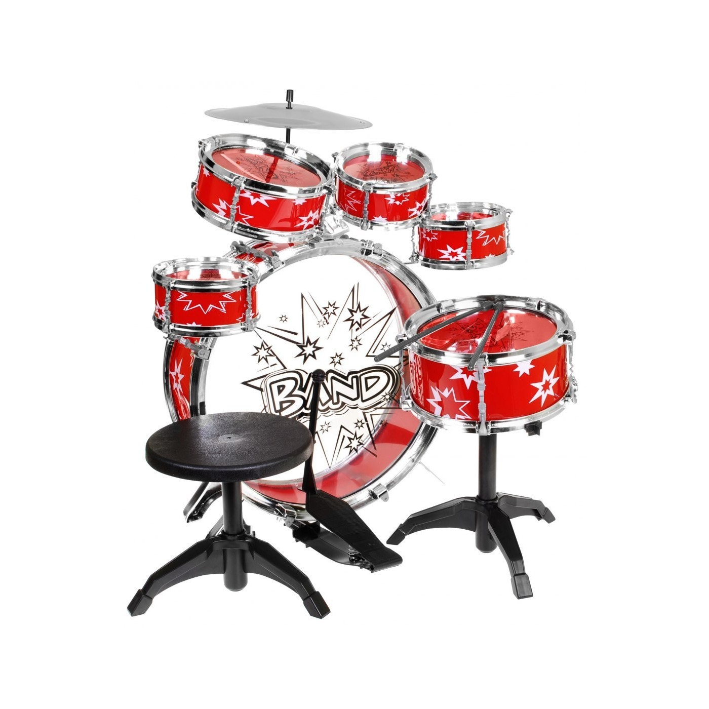 | - jeden bęben duży z pedałem do uderzania, - jeden bęben średni, - trzy bębny małe, - jeden bęben średni stojący, - dwie pałeczki, - talerz, - stołeczek. | |