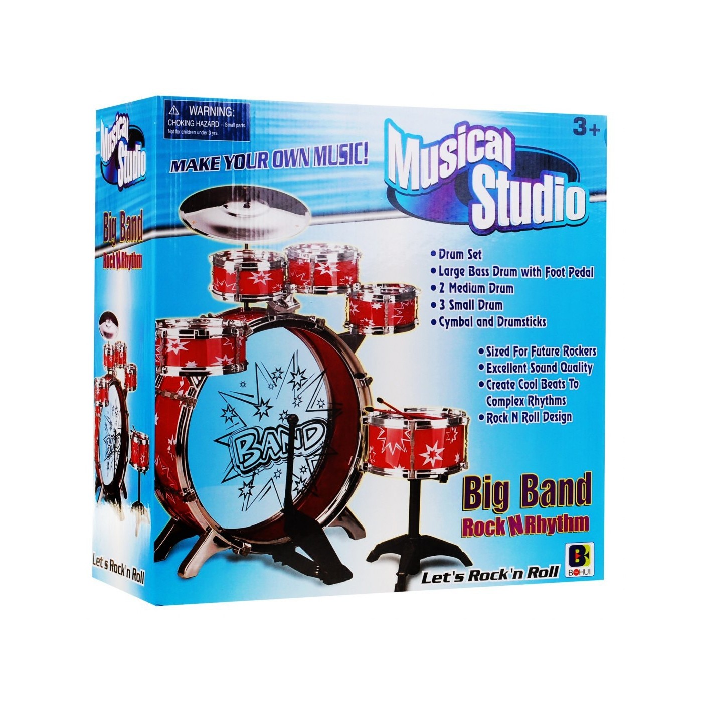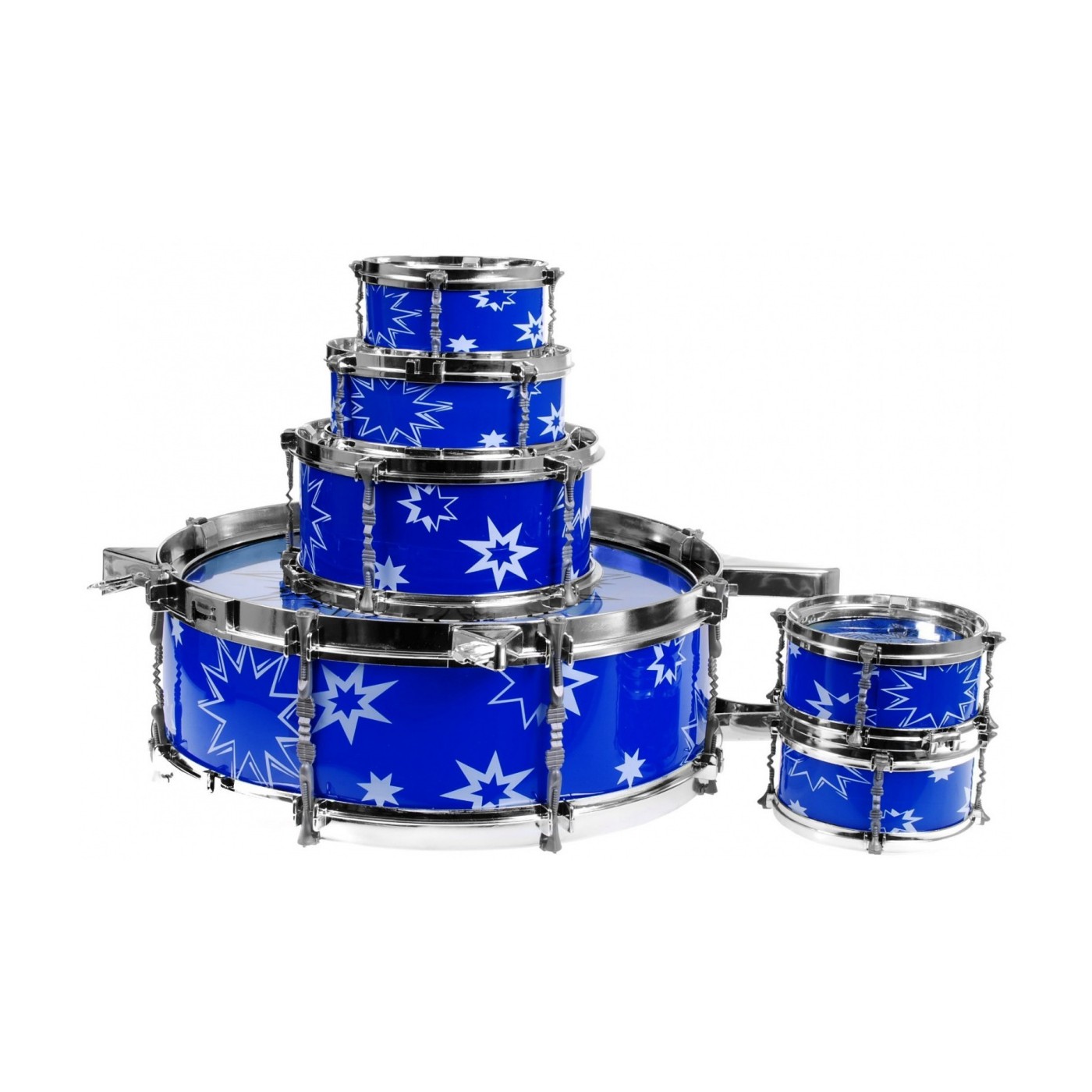| - jeden bęben duży z pedałem do uderzania, - jeden bęben średni, - trzy bębny małe, - jeden bęben średni stojący, - dwie pałeczki, - talerz, - stołeczek. | |