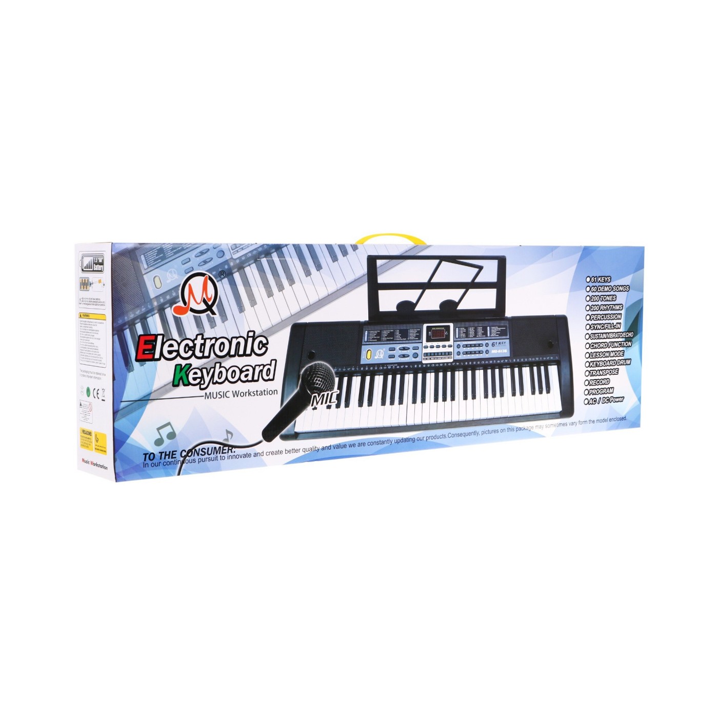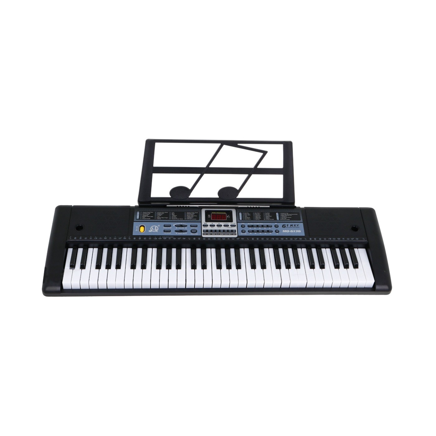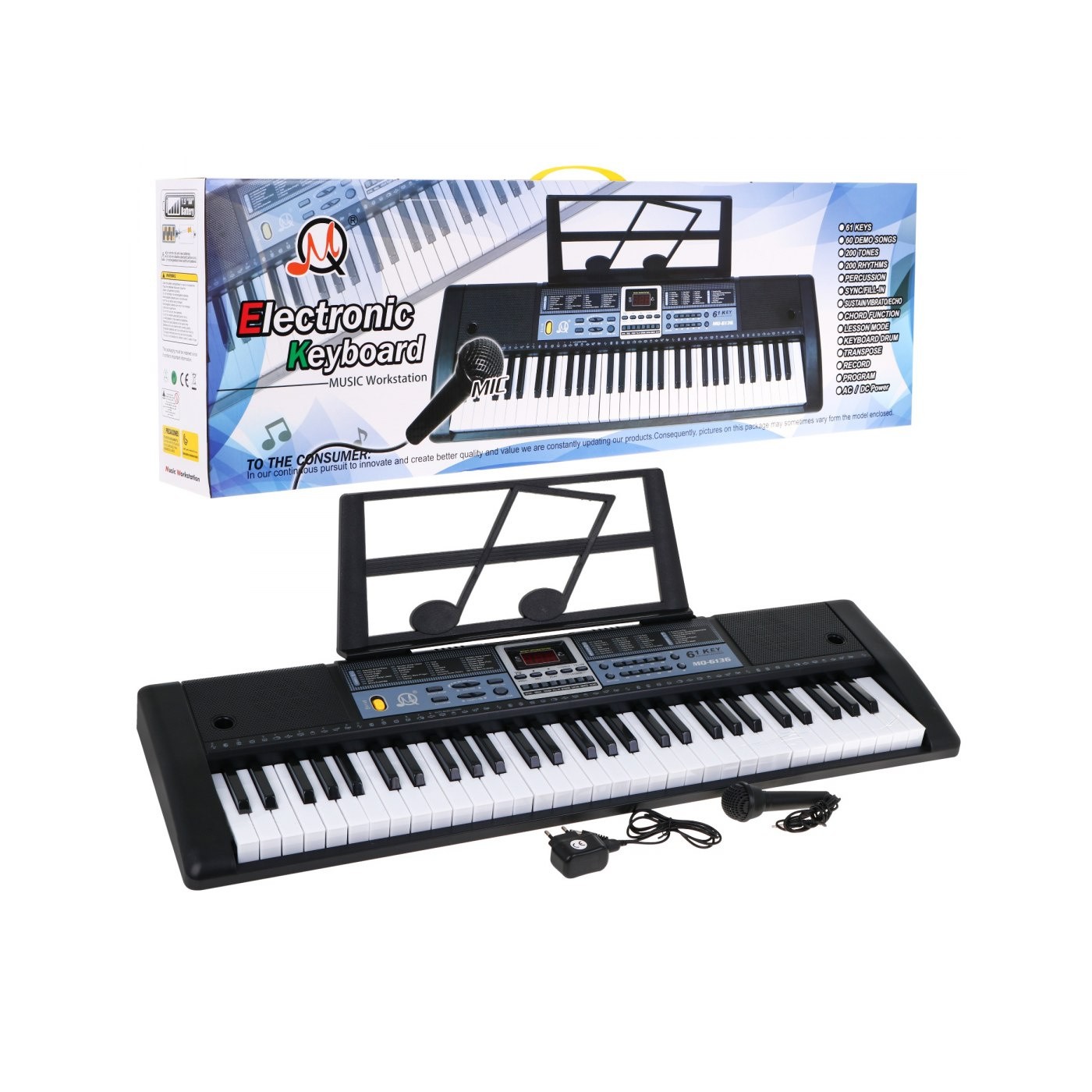 | - klawiatura muzyczna 61 klawiszy (36 białych, 25 czarnych), - przycisk zasilania ON/OFF, - cyfrowy wyświetlacz, - regulacja głośności, - 200 rytmów, - przycisk STOP, START - zmiana tempa, - 200 tonów, - nagrywanie – przycisk RECORD, - funkcja towarzyszący Akord, - 60 Demo podkładów, - nauka gry – przycisk LESSON, - efekty dźwiękowe VIBRATO, ECHO, - funkcja METRONOME, 4 rodzaje tempa, - 8 dźwięków perkusyjnych, - głośniki. | |