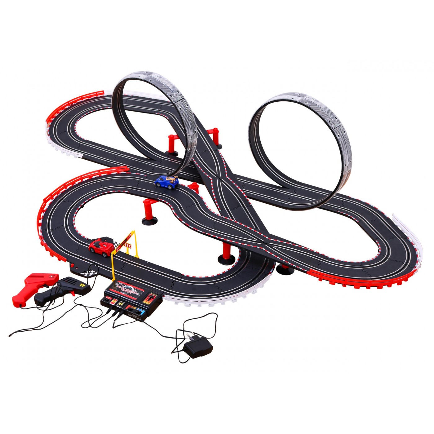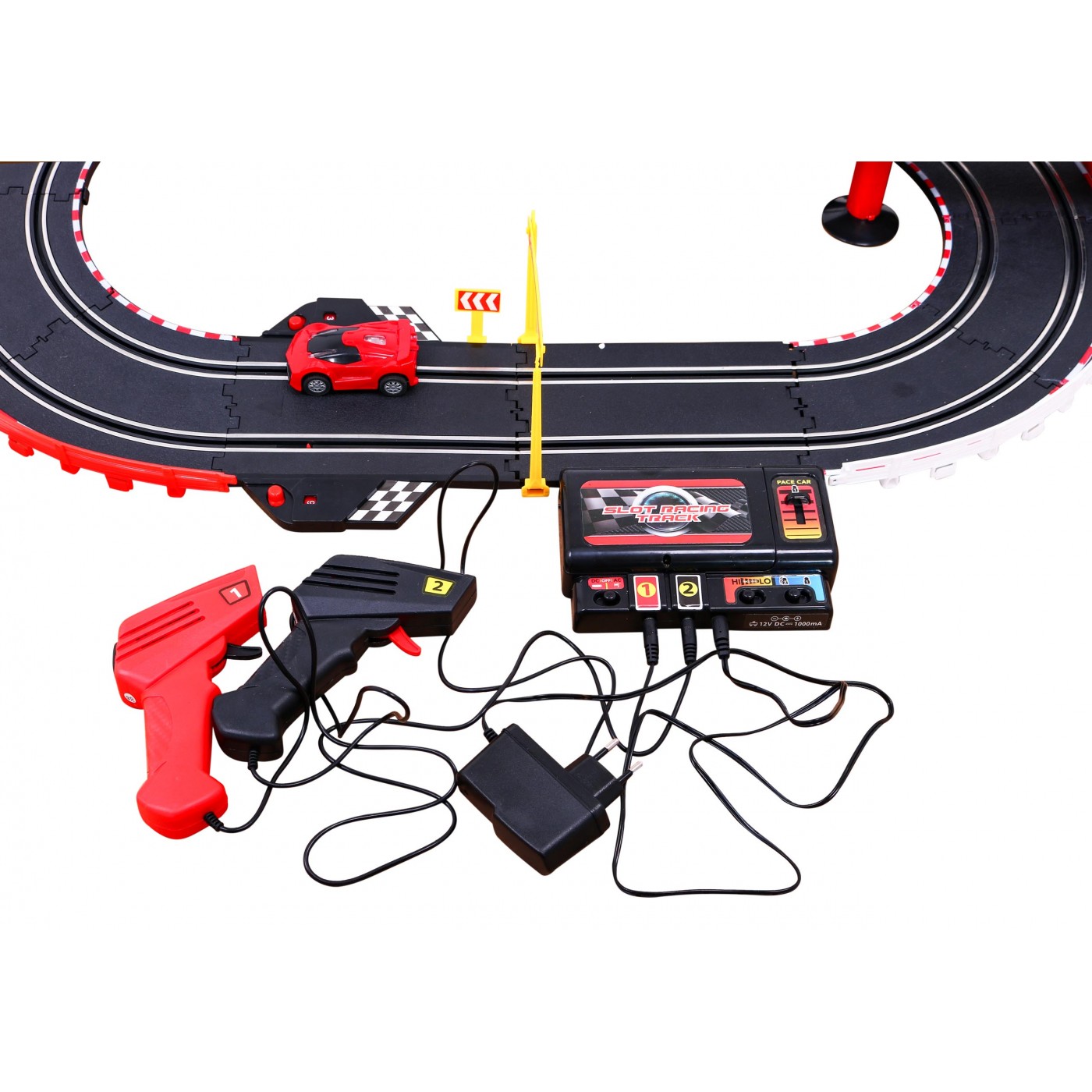 | - 2 auta wyścigowe, - 2 piloty, - tor w częściach, - bariery, - znaki drogowe, - zasilacz, | |