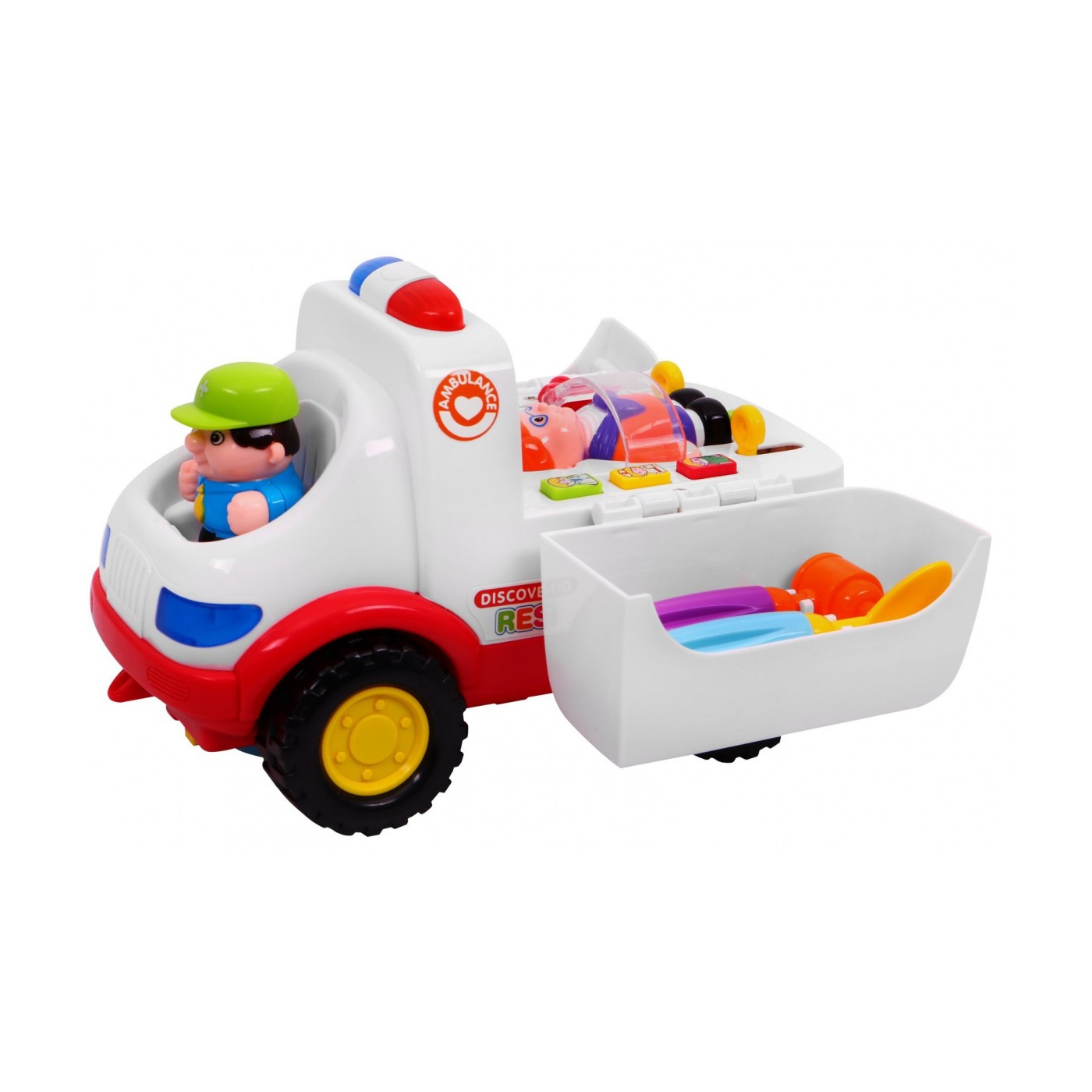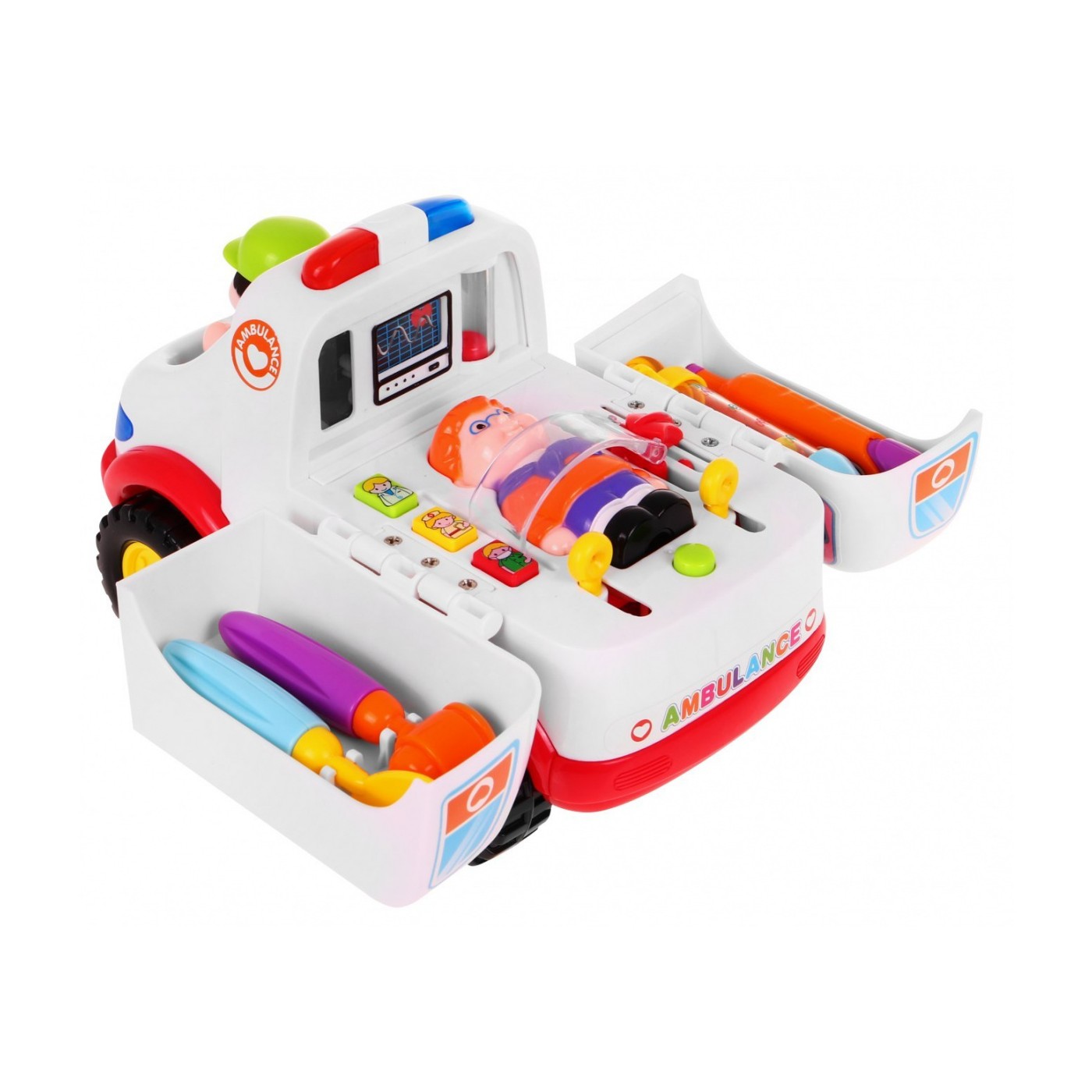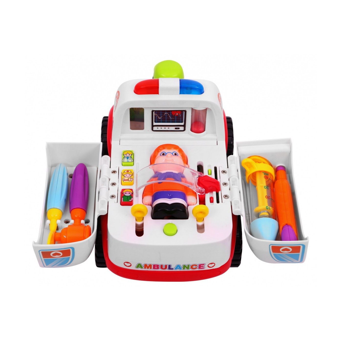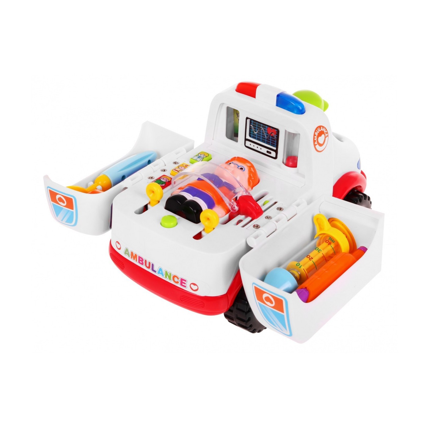 | | Karetka jeździ sama i zmienia kierunki jazdy po napotkaniu przeszkody. Wydaje przy tym dźwięki: syreny pogotowia ratunkowego, klaksonu oraz rozruch silnika. Po otwarciu tyłu ambulansu mamy dostęp do pacjenta oraz narzędzi diagnostycznych umieszczonych w karetce. Dostępne narzędzia lekarskie to: - skalpel, - otoskop, - termometr z przyciskiem zmiany temperatury, - strzykawka. AMBULANS posiada: - ruchomą klamrę przytrzymującą pacjenta, można ją przesuwać po jego ciele, otwierać aby wyjąć go a po naciśnięciu jej autobus wygrywa melodie, - rentgen ręki i głowy uruchamiany przyciskiem, - ciśnieniomierz mierzący ciśnieni krwi również uruchamiamy przyciskiem, - realistyczne EKG serca, - trzy przyciski lekarzy wydające odgłosy bicia serca, kaszlu oraz burczenia brzucha. |