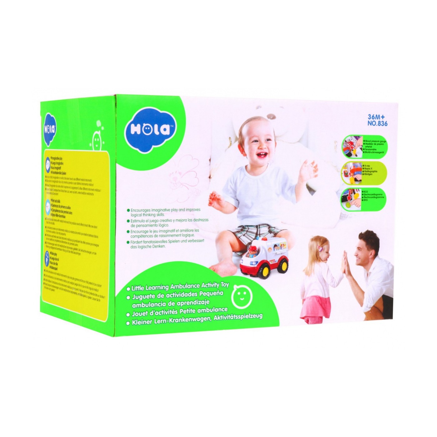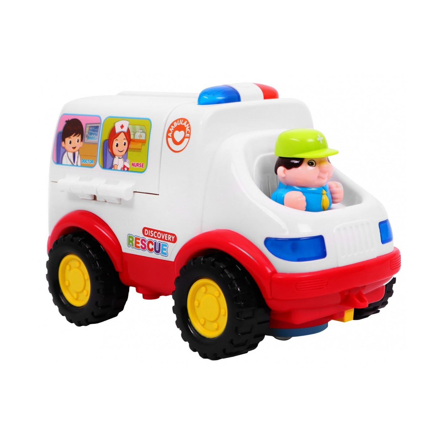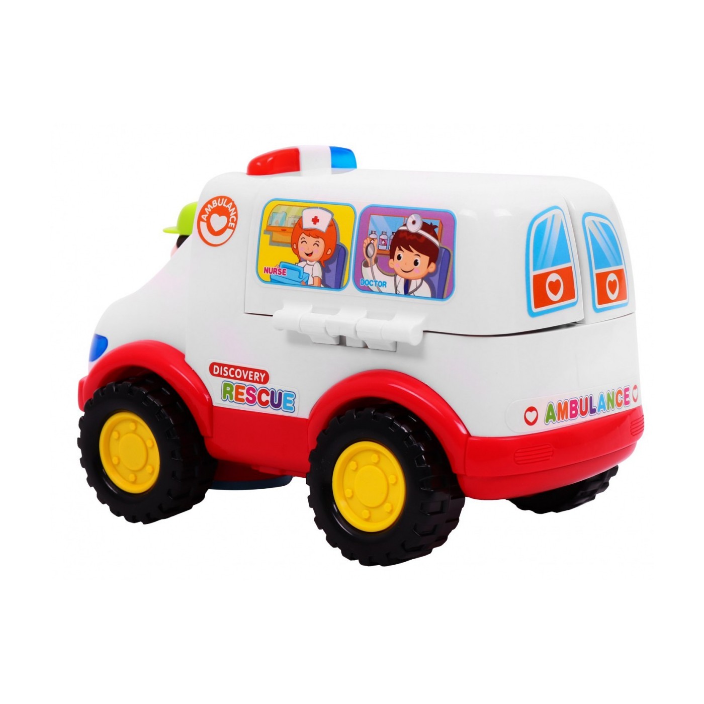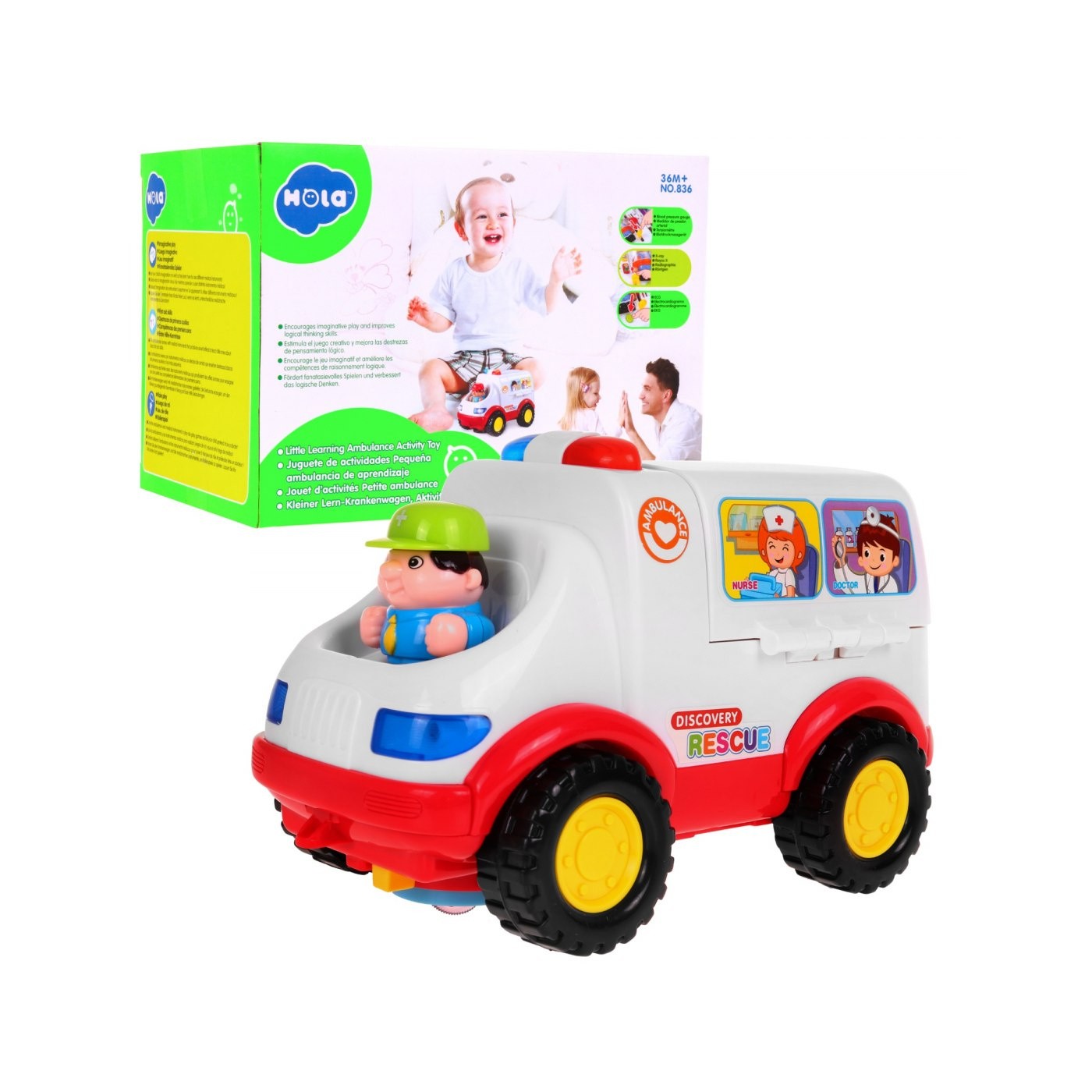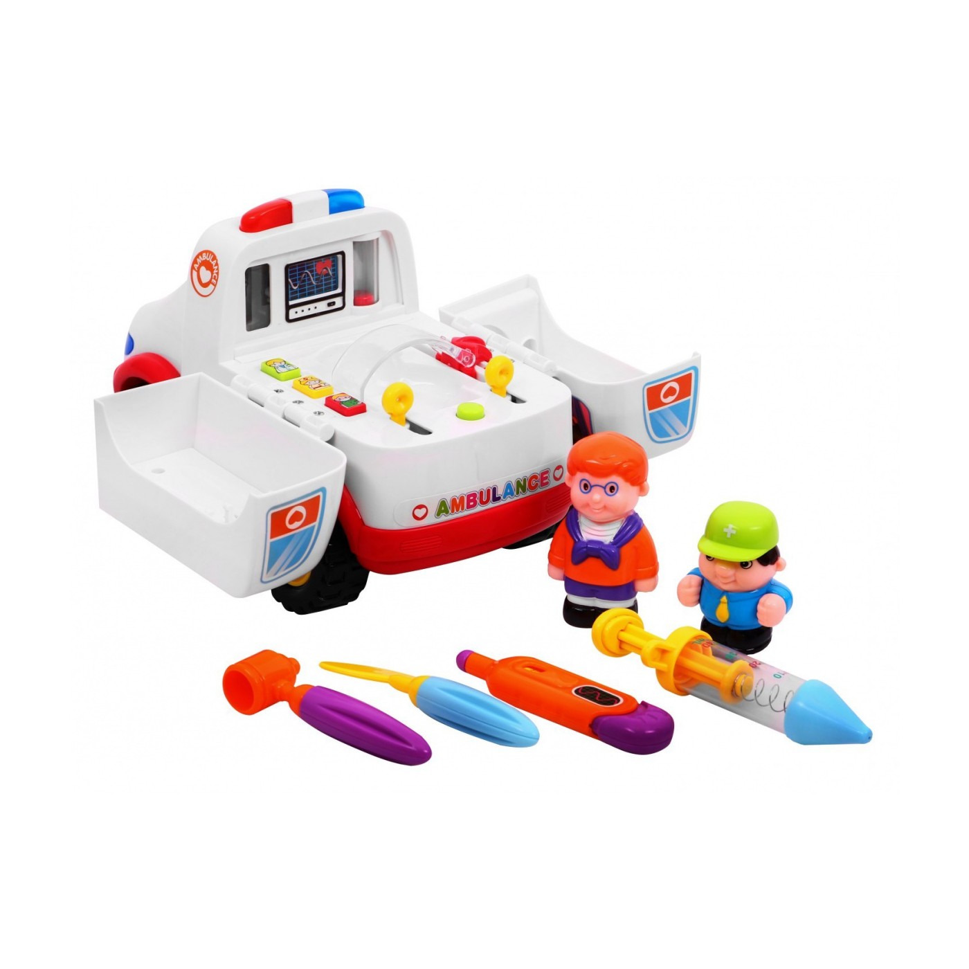 | | Karetka jeździ sama i zmienia kierunki jazdy po napotkaniu przeszkody. Wydaje przy tym dźwięki: syreny pogotowia ratunkowego, klaksonu oraz rozruch silnika. Po otwarciu tyłu ambulansu mamy dostęp do pacjenta oraz narzędzi diagnostycznych umieszczonych w karetce. Dostępne narzędzia lekarskie to: - skalpel, - otoskop, - termometr z przyciskiem zmiany temperatury, - strzykawka. AMBULANS posiada: - ruchomą klamrę przytrzymującą pacjenta, można ją przesuwać po jego ciele, otwierać aby wyjąć go a po naciśnięciu jej autobus wygrywa melodie, - rentgen ręki i głowy uruchamiany przyciskiem, - ciśnieniomierz mierzący ciśnieni krwi również uruchamiamy przyciskiem, - realistyczne EKG serca, - trzy przyciski lekarzy wydające odgłosy bicia serca, kaszlu oraz burczenia brzucha. |