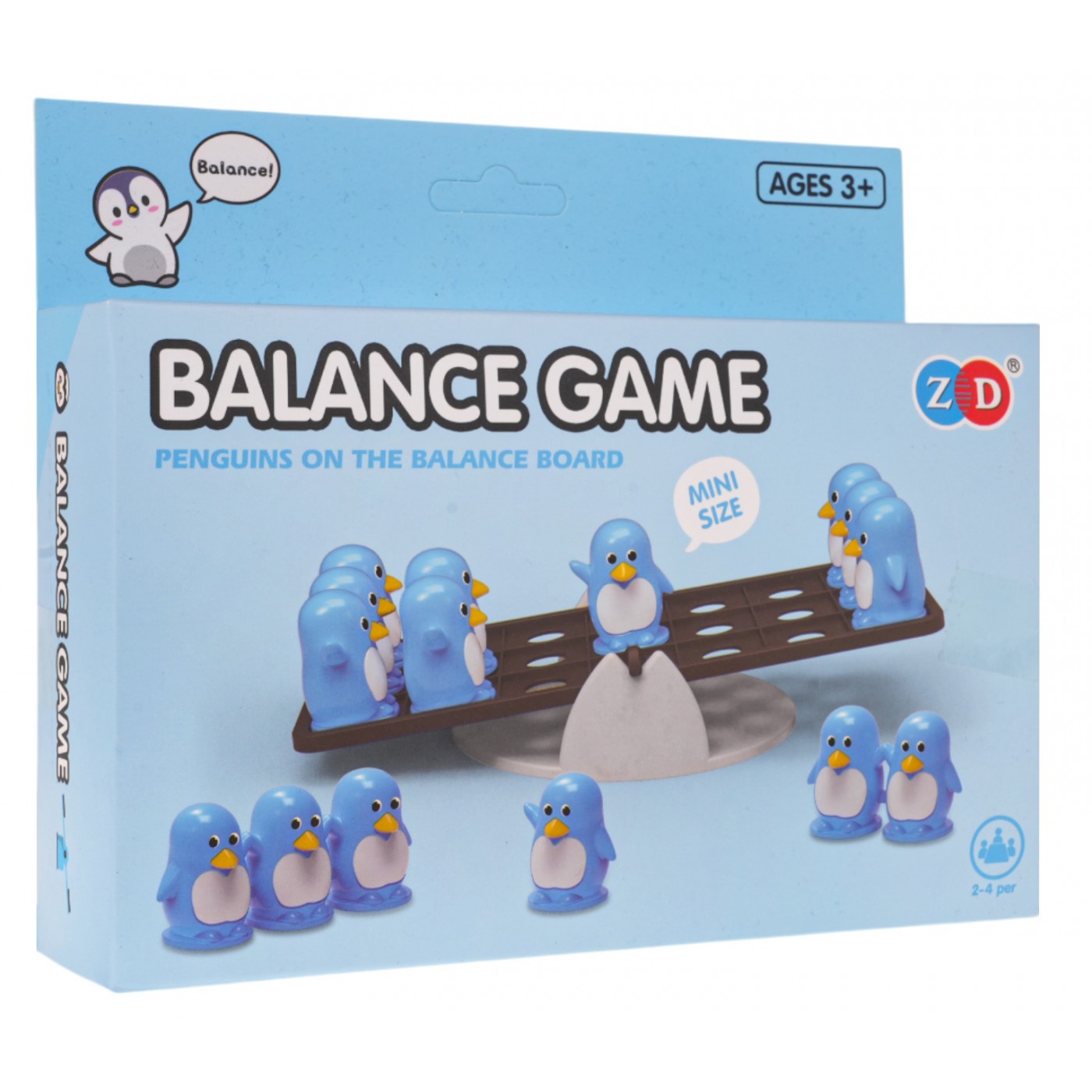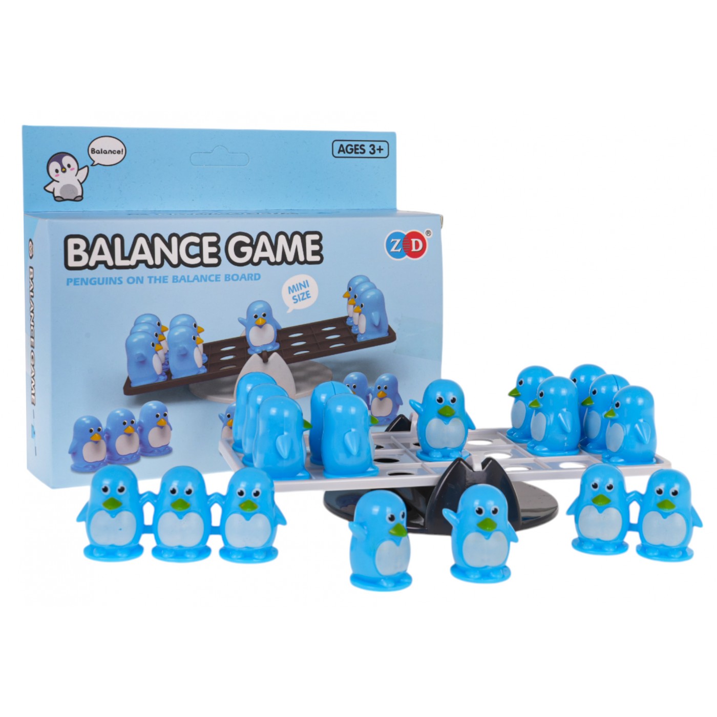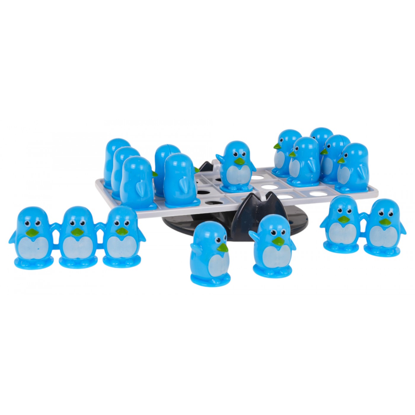 - základňa na hranie na stojane, - závažia v podobe malých tučniakov: 3 x jednoduché tučniaky, 3 x dvojité tučniaky, 3 x trojité tučniaky, - návod na hru. |