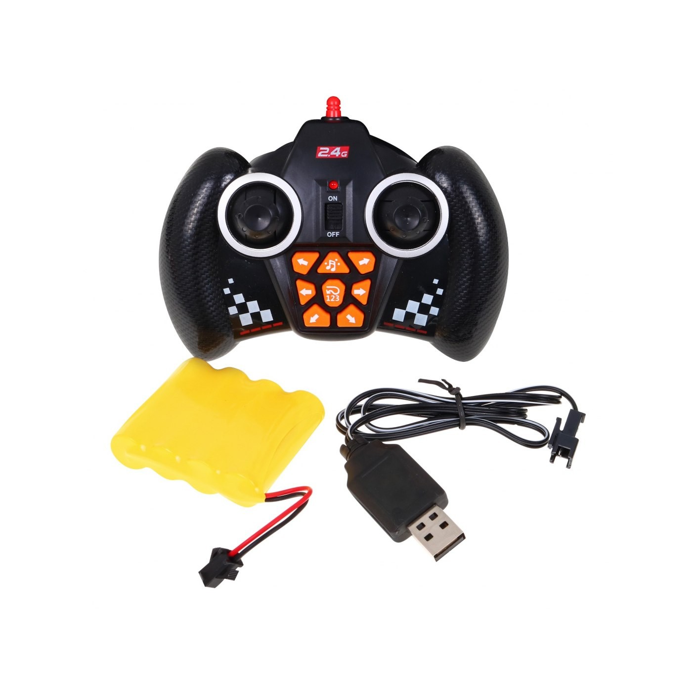 | Pilot | - częstotliwość pracy 2,4GHz, - wyprofilowany – idealnie mieści się w ręce 6-latka, - przycisk ON/OFF, - sterowanie – skręty: prawo - lewo, - sterowanie – jazda: przód – tył. - przyciski do jazdy w bok i pod skosem - dwa przyciski do jazdy w trybie demo |