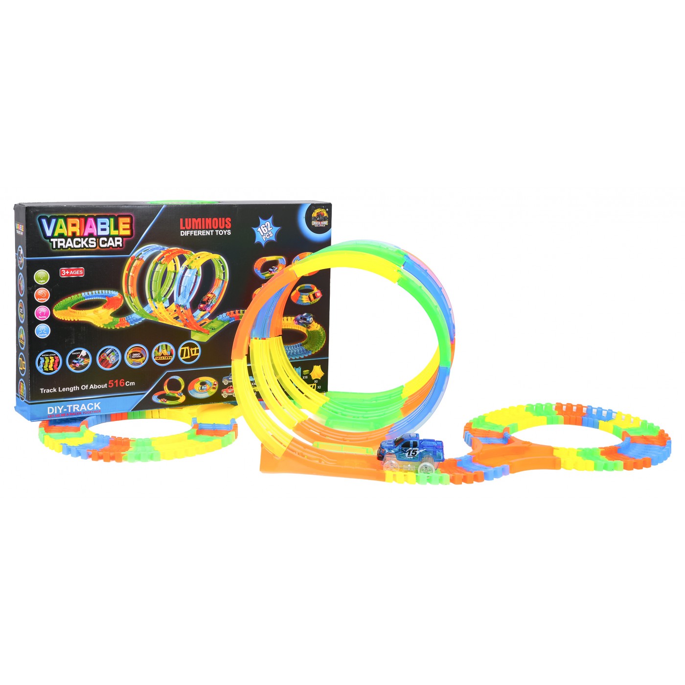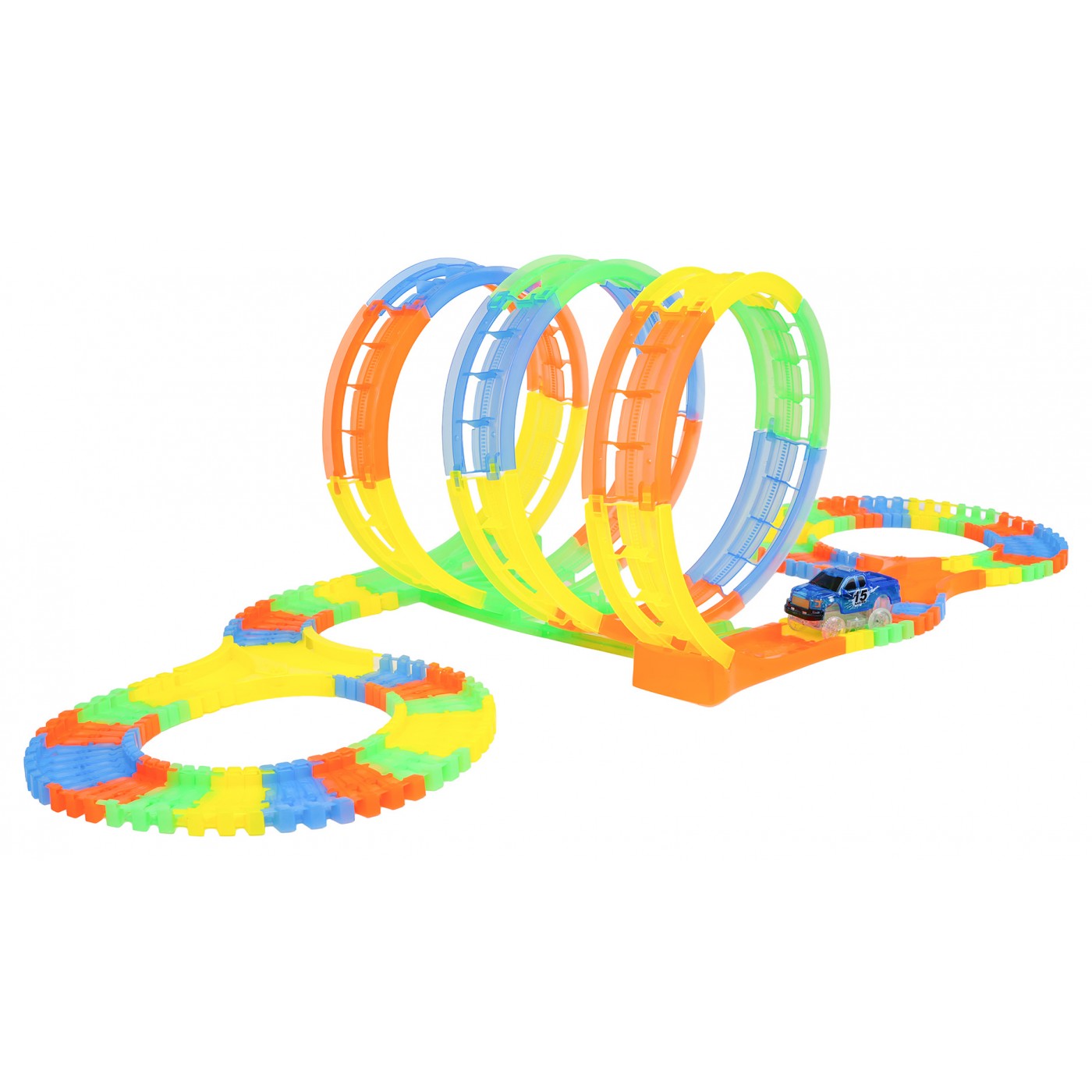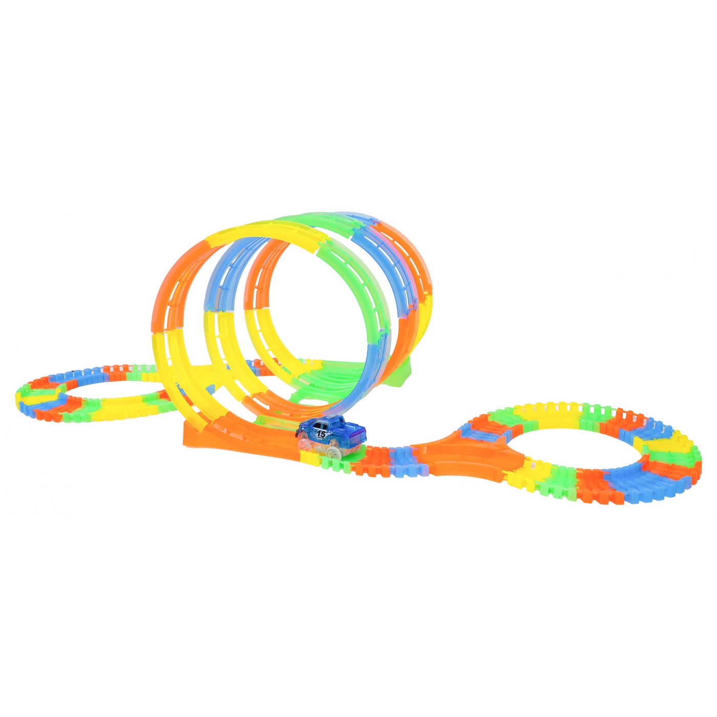 Táto svietiaca pretekárska dráha so slučkami a autom je ideálna pre deti od troch rokov. Dráhy sú flexibilné a dajú sa ľubovoľne kombinovať, otáčať, zdvíhať a premiestňovať, kým je auto v pohybe. Dráhy sú navyše fluorescenčné, svietia v tme. Súčasťou balenia je LED osvetlenie, ktoré vytvára úžasný efekt pri jazde v tme. Vozidlo je napájané 2 batériami AA 1,5 V (nie sú súčasťou balenia). Na naštartovanie auta stačí stlačiť tlačidlo na streche.