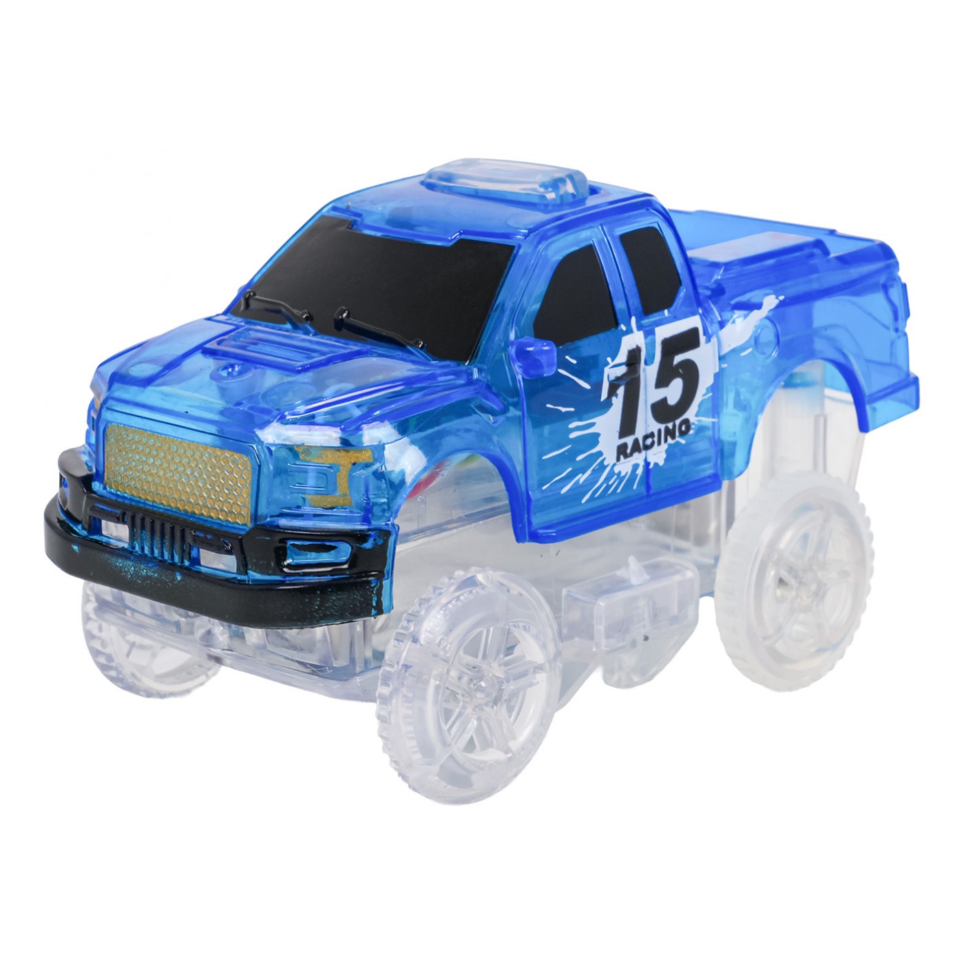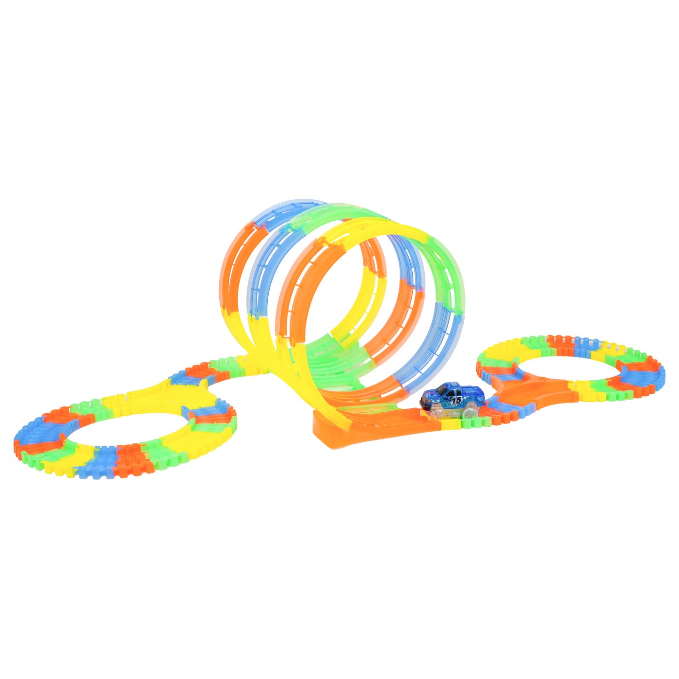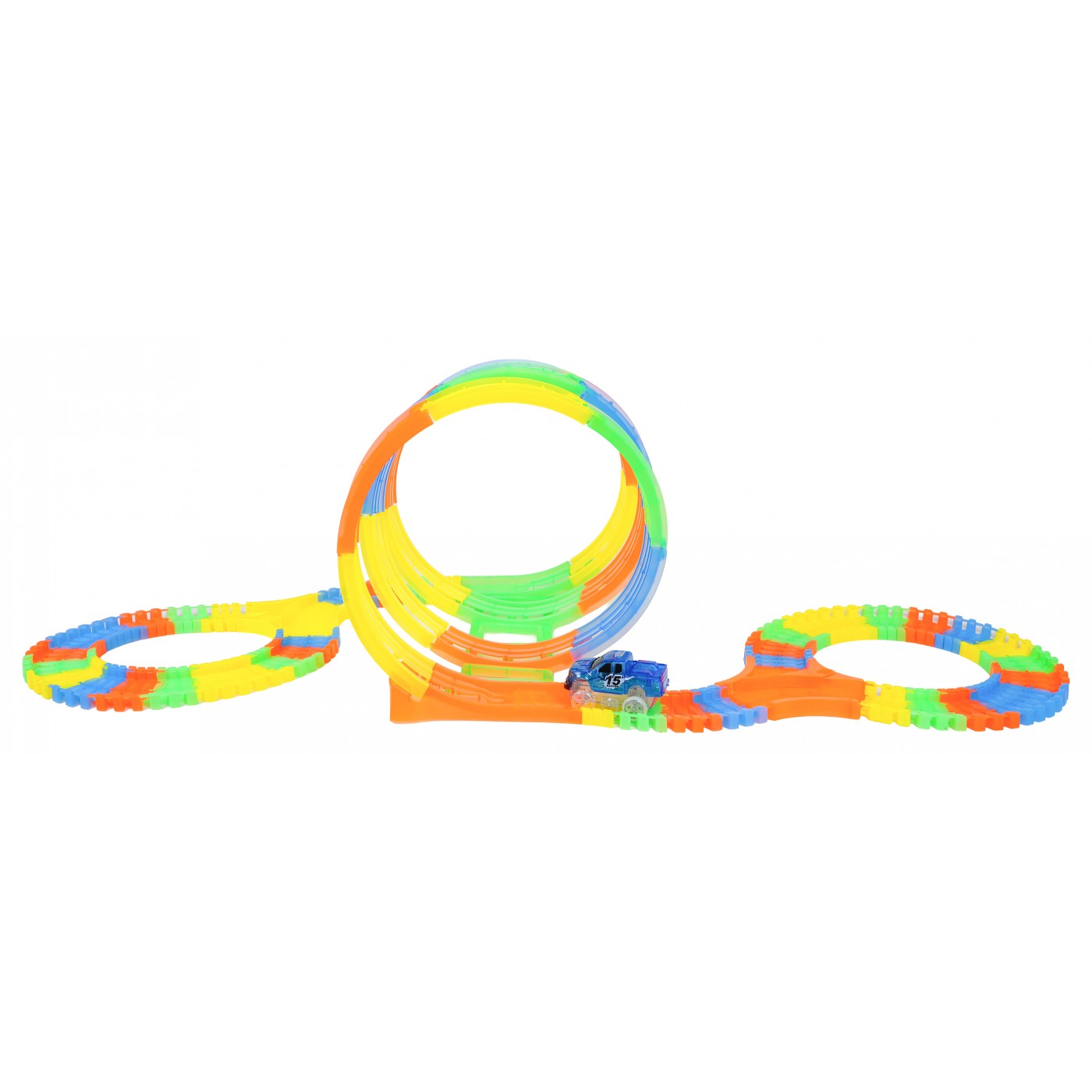 Táto svietiaca pretekárska dráha so slučkami a autom je ideálna pre deti od troch rokov. Dráhy sú flexibilné a dajú sa ľubovoľne kombinovať, otáčať, zdvíhať a premiestňovať, kým je auto v pohybe. Dráhy sú navyše fluorescenčné, svietia v tme. Súčasťou balenia je LED osvetlenie, ktoré vytvára úžasný efekt pri jazde v tme. Vozidlo je napájané 2 batériami AA 1,5 V (nie sú súčasťou balenia). Na naštartovanie auta stačí stlačiť tlačidlo na streche.