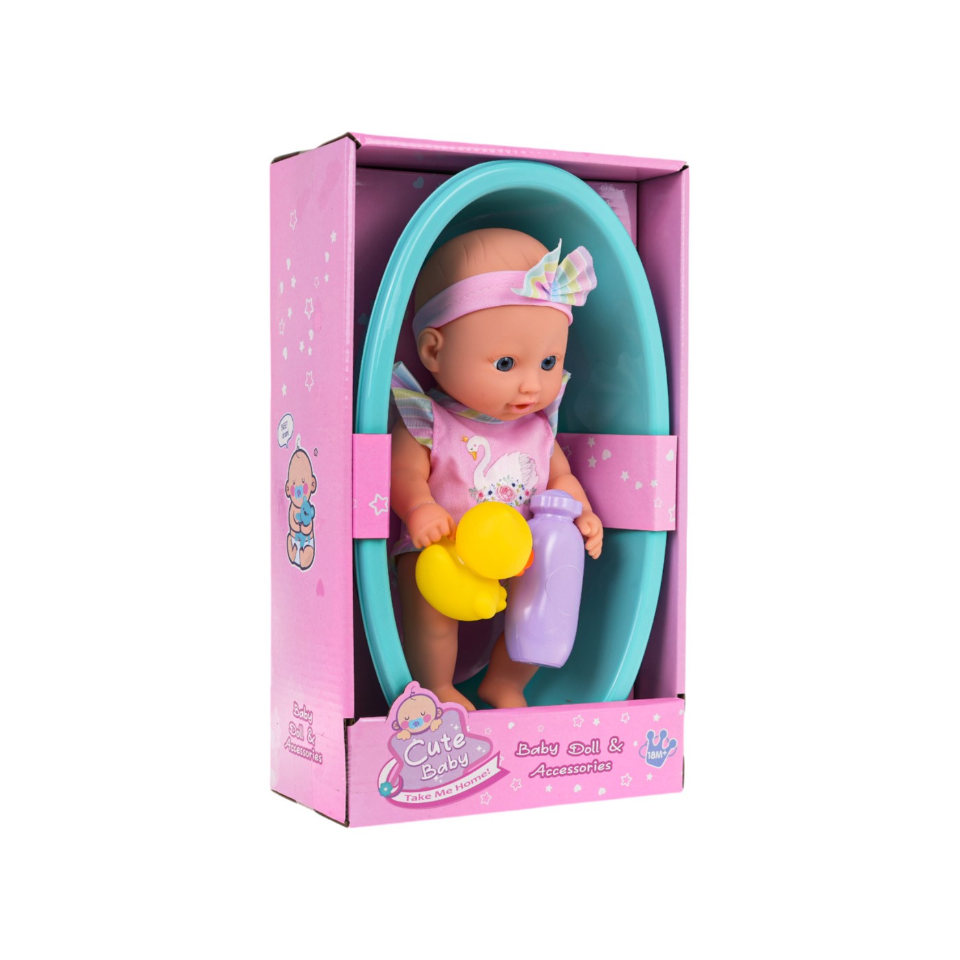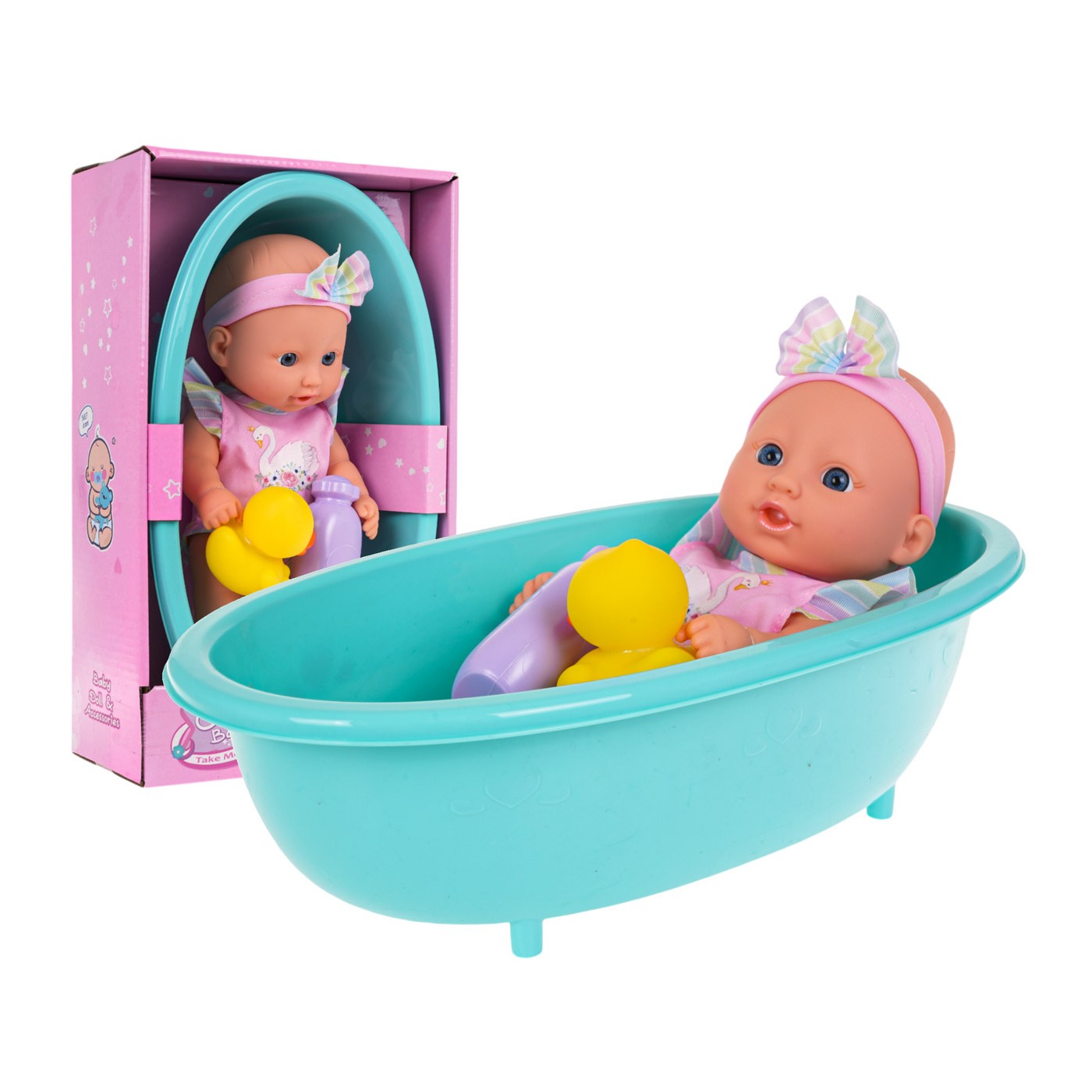 Bábika, bábätko s vaničkou, perličkovým kúpeľom a kačičkou pre deti od 18 mesiacov. Krásna bábika je oblečená vo farebnom body a má čelenku. Vaše dieťa ju bude môcť kúpať a starať sa o ňu. Bábika má pohyblivú hlavu, ruky a nohy. Je vyrobená z mäkkého, na dotyk príjemného materiálu.