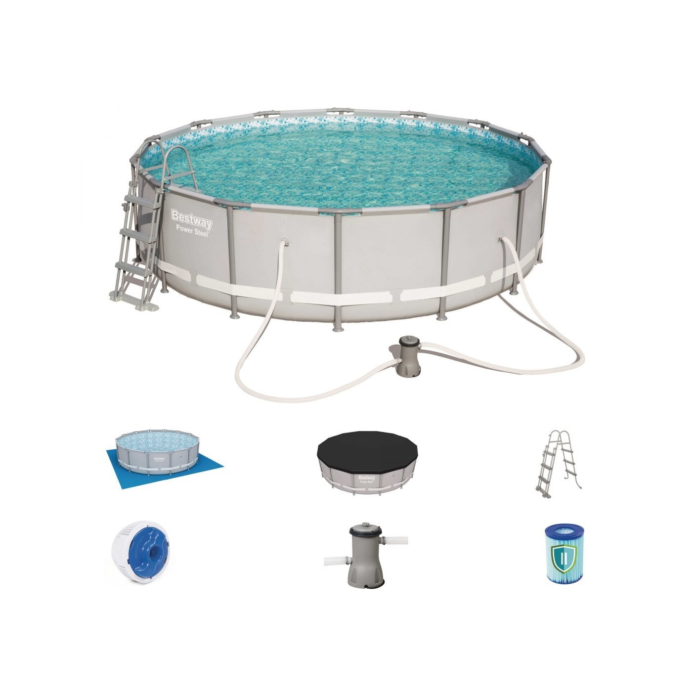 | - basen 56641, - pompa filtrująca 58386, - filtr antybakteryjny 58476, - mata pod basen 58003, - pokrywa pod basen 58248, - dozownik chemi basenowej 58501, - drabinka 58330, - kolorowe opakowanie.