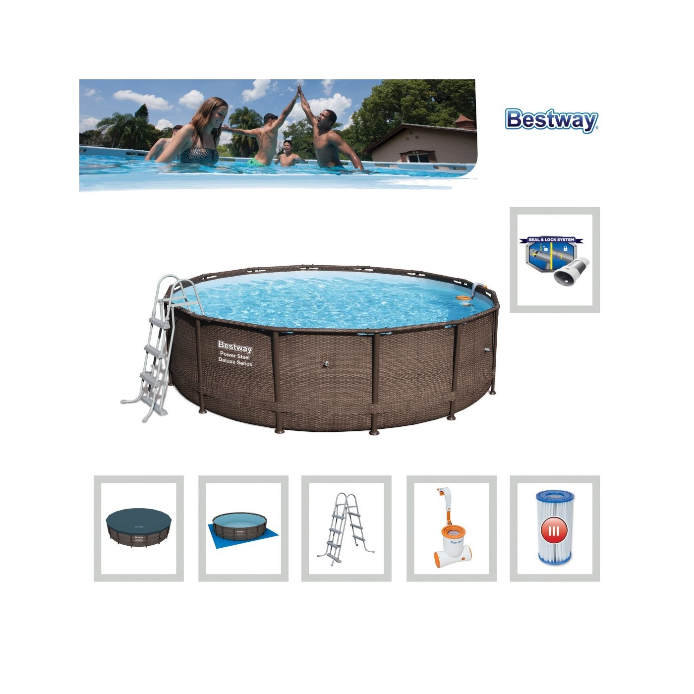| - odporny na korozje stelaż z owalnymi rurkami, - powłoka basenu PVC wykonana w technologii TRITECH™, - zawór spustowy, - ścianki wewnętrzne basenu pokryte mozaikową grafiką, - zewnętrzne ścian pokryte rattanową grafiką, - basen wyposażony w Seal & Lock System™ zabezpieczający połączenie między elementami stelażu, - łatwy montaż,