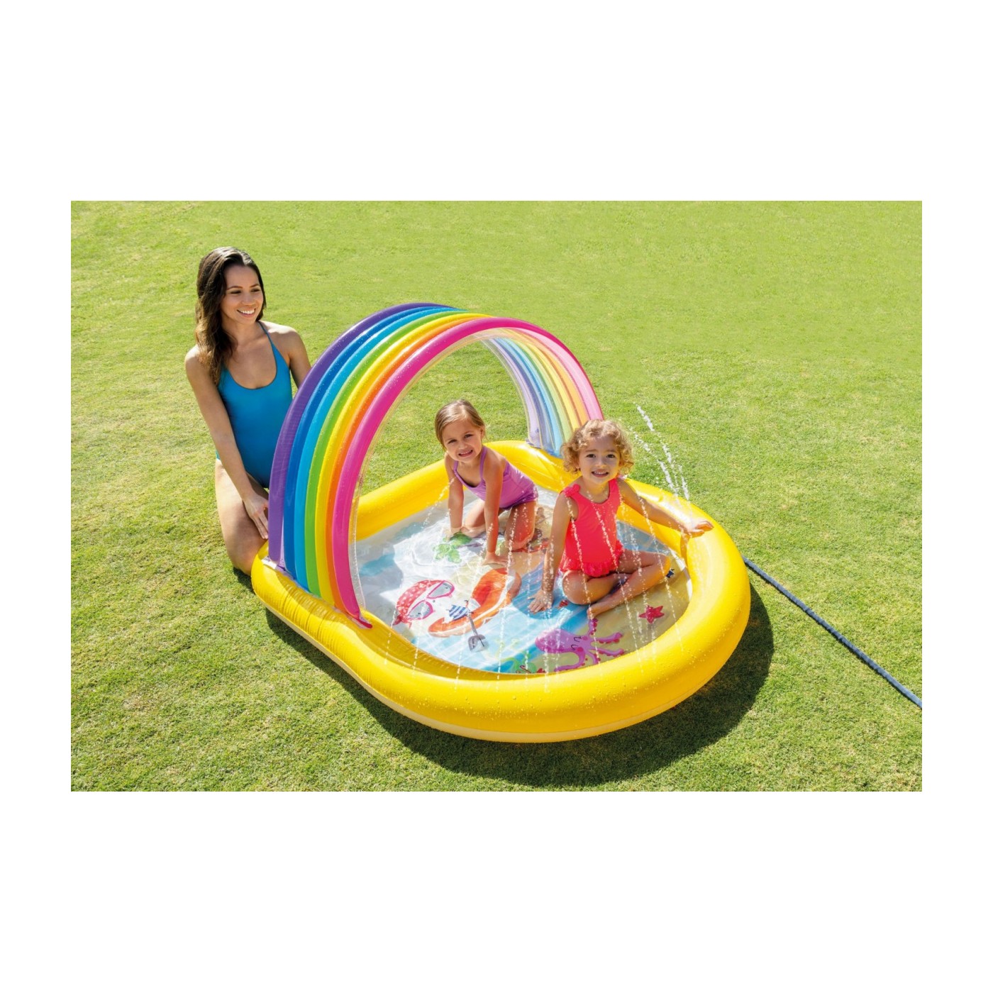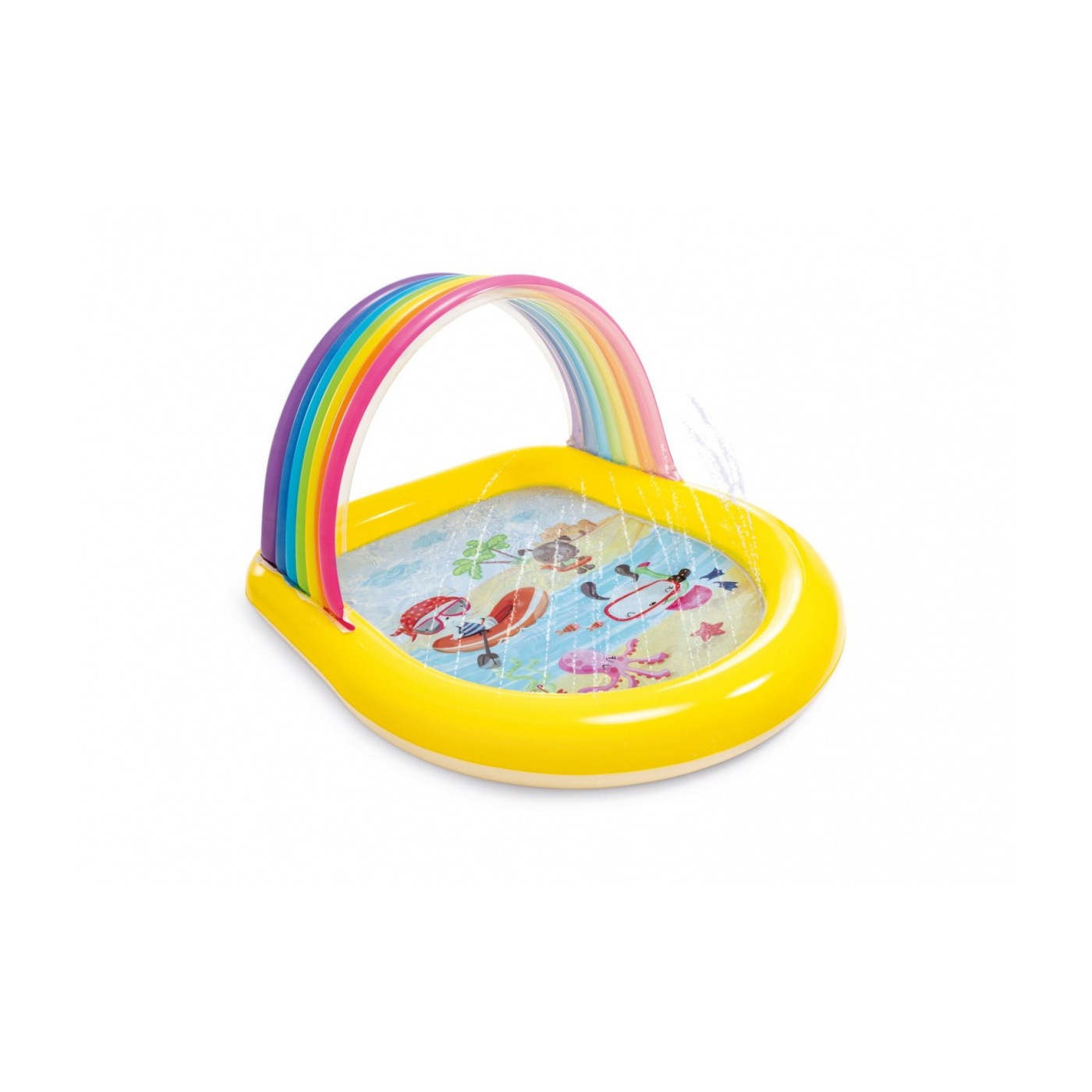 | - dmuchane miękkie dno brodzika, - wbudowany daszek w kształcie grzybka, - napełnienie przy 10 cm / 84L, - wbudowane natryski, - efektowna kolorystyk basenu z dodatkową tęczą, |