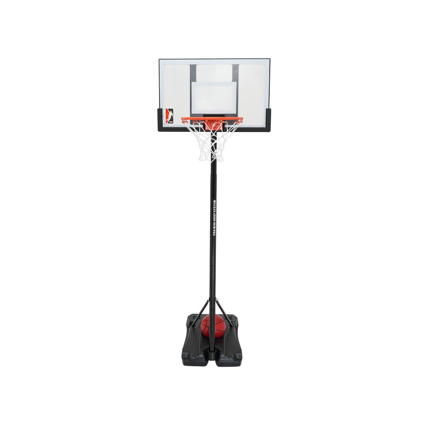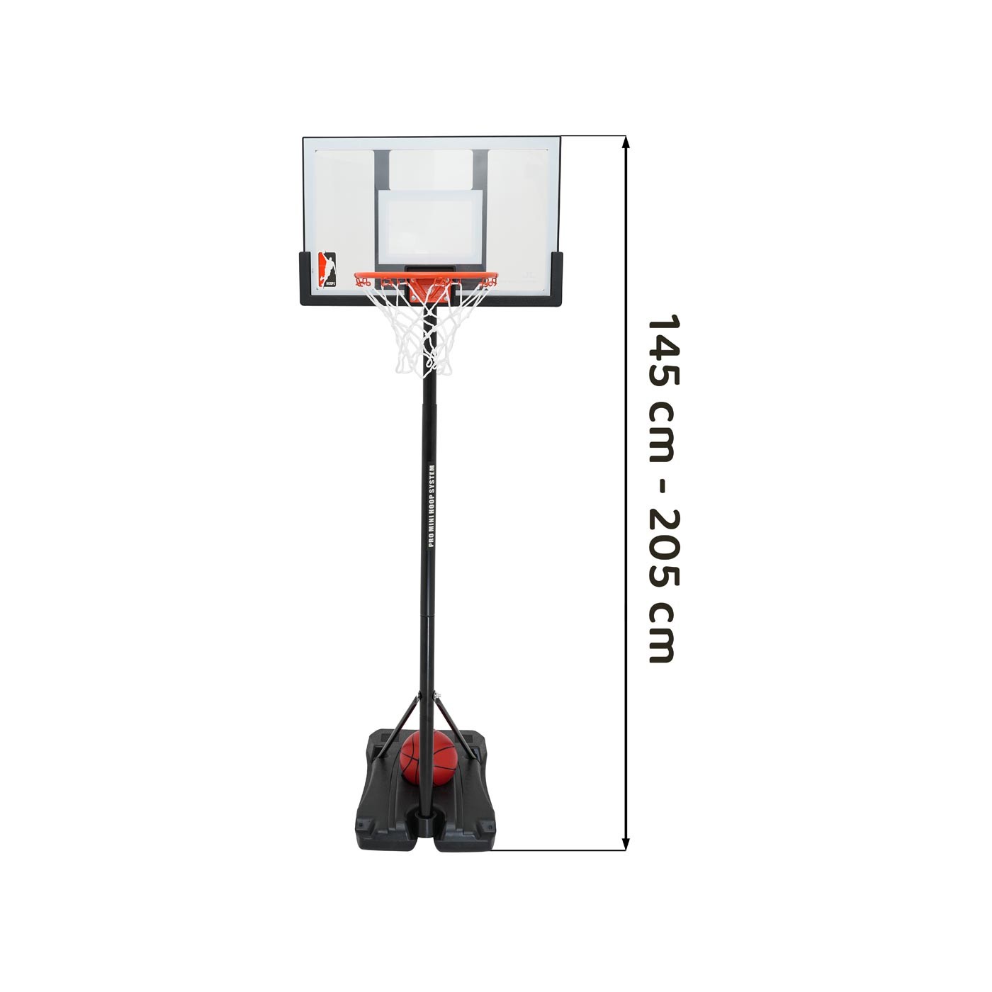 - vhodné pre deti od 6 rokov, - výškové nastavenie v rozsahu 145 až 205 cm, - veľká základňa, ktorú možno zaťažiť pieskom alebo vodou, - doska vyrobená z odolného materiálu, - oceľový ráfik, - vrátane lopty a pumpy. |