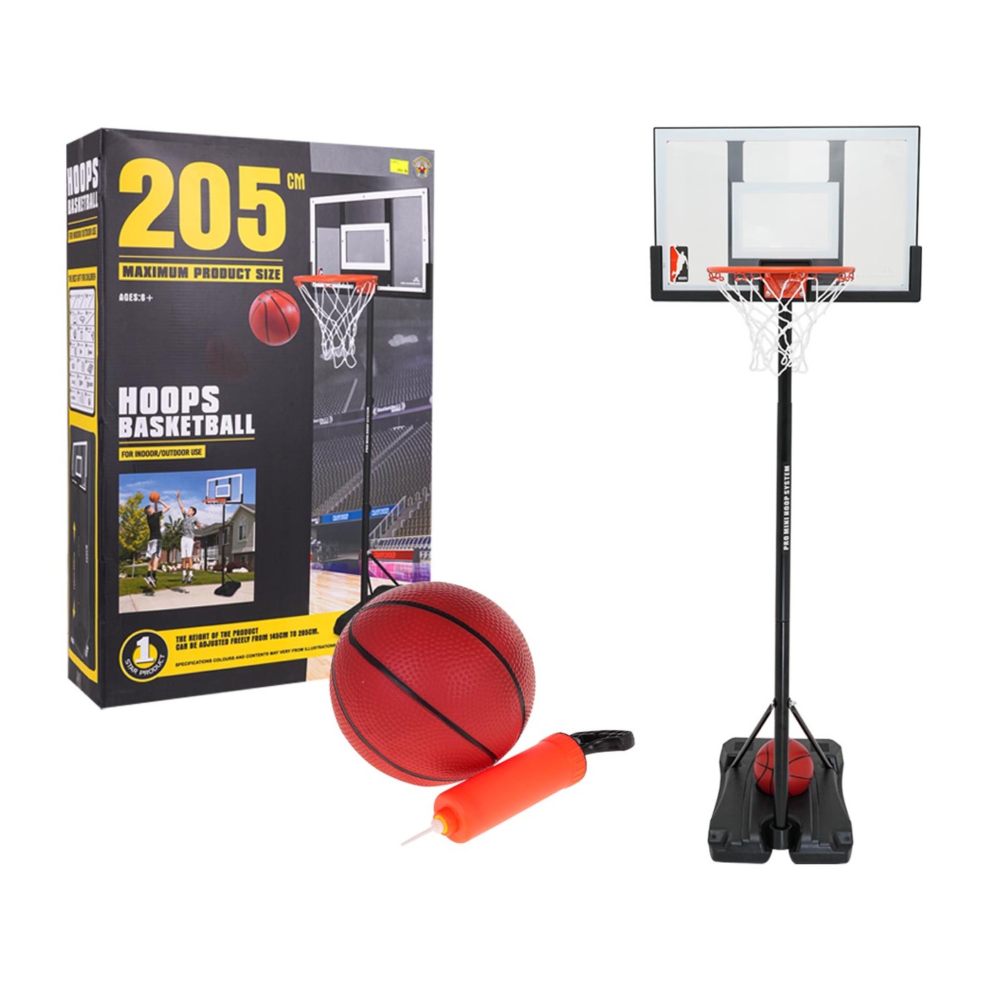 Basketbalový set pre deti od 6 rokov a tínedžerov. Súprava je výškovo nastaviteľná od 145 do 205 cm. Veľká základňa zaisťuje stabilitu konštrukcie. Môže sa dodatočne naplniť vodou alebo pieskom. Basketbalová doska je vyrobená z ľahkého a odolného materiálu, ktorý odolá veľmi veľkému počtu úderov loptou. Okraj košíka je oceľový a sieťka z nylonu. Všetky tieto parametre zaručujú dlhú dobu používania. Sada obsahuje aj loptičku a pumpu.