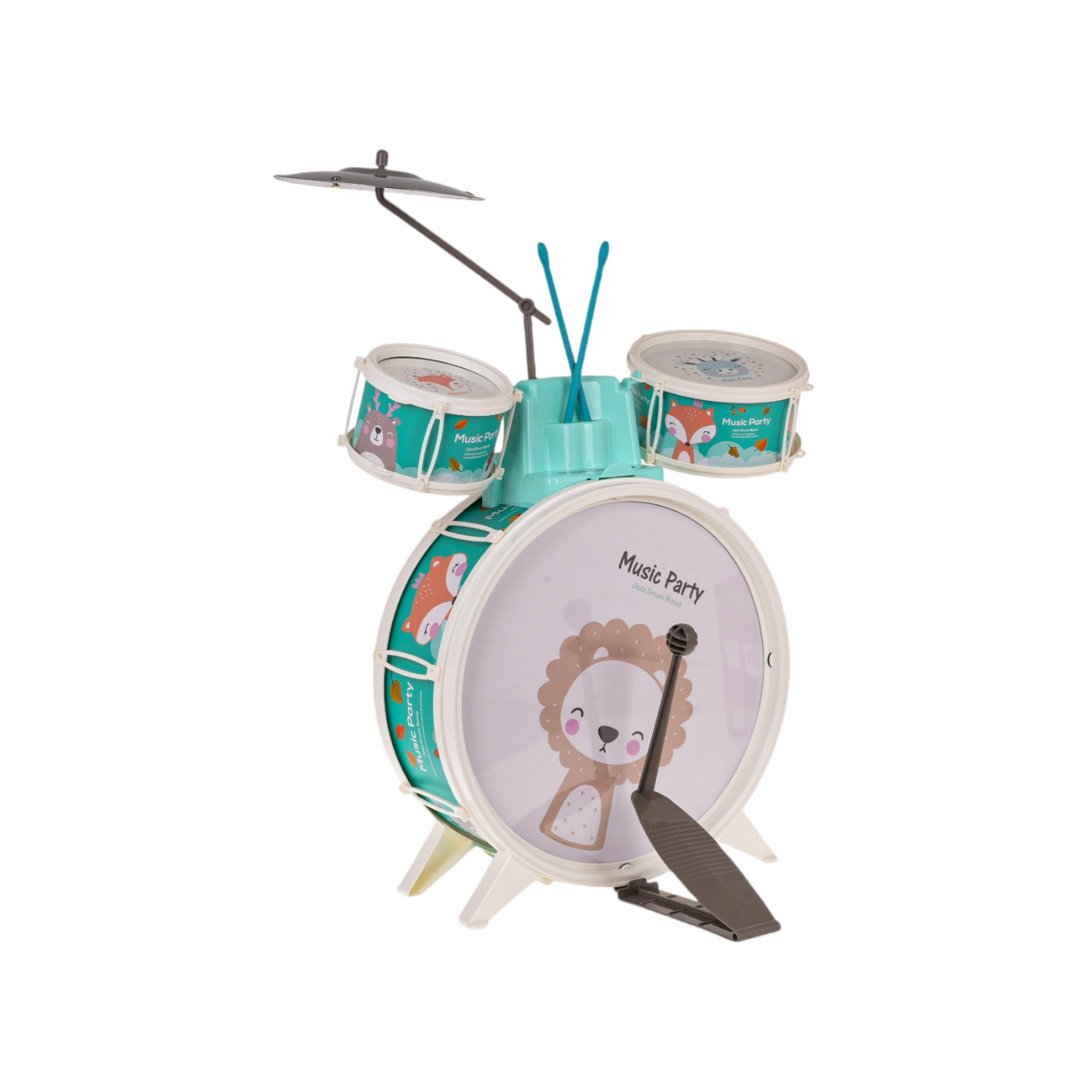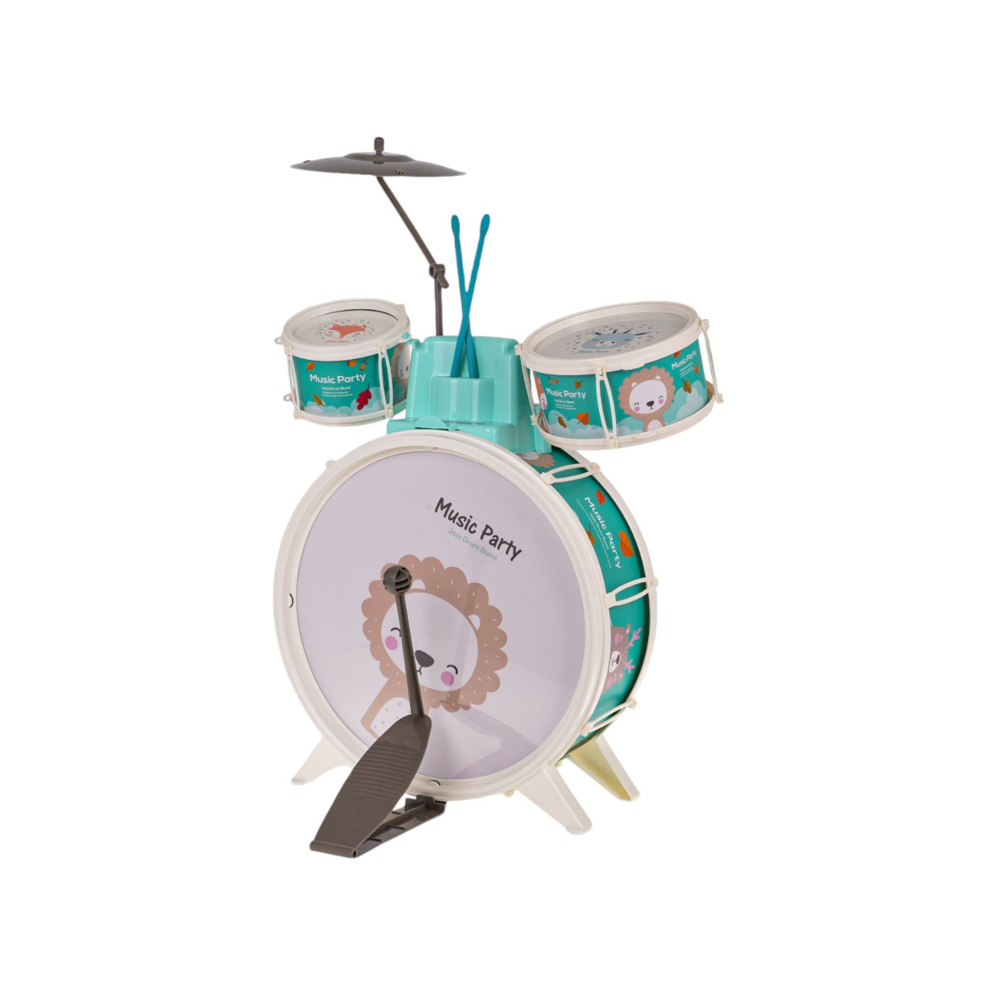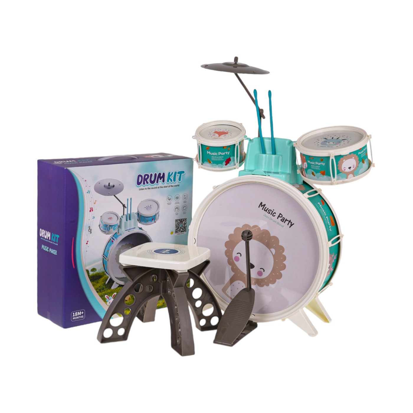 Bubny pre najmenšie deti od 18 mesiacov s taburetom v cene. Hračka je vyrobená z najkvalitnejších materiálov v živých farbách, ktoré upútajú pozornosť dieťaťa. Súpravu bicích tvoria tri bubny zdobené obrázkami zvieratiek ako lev, somár alebo líška, tanier a paličky. Máme aj pohodlnú stoličku na sedenie.