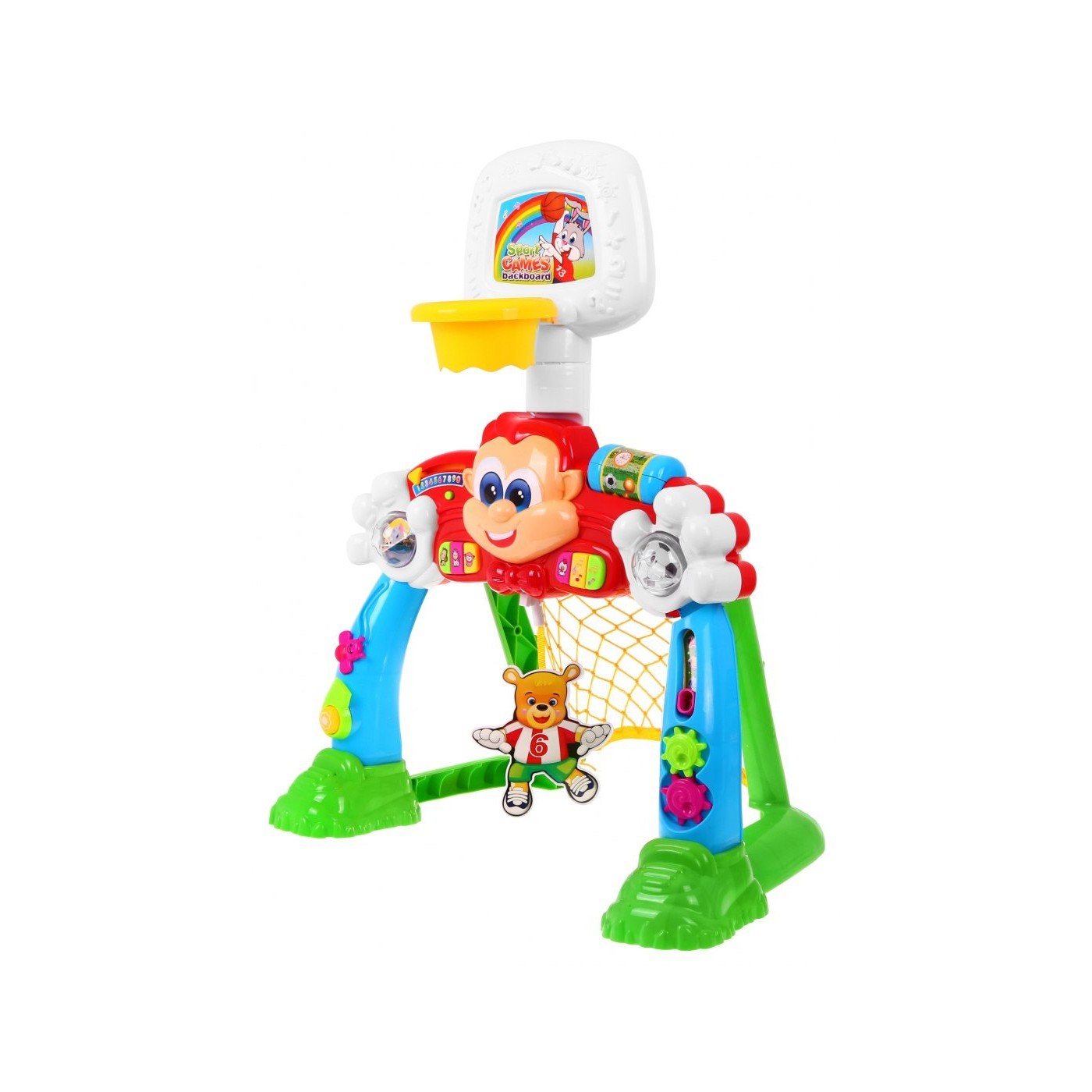 | | Ten zestaw to wymarzony prezent dla najmłodszego adepta piłki nożnej oraz wszelakich rzutów. Już od najmłodszych lat dziecko może wcielić się w rolę największych gwiazd futbolu oraz poznać tajniki gry w piłkę nożną. Zabawka działa na wszystkie zmysły dziecka - wzrok, słuch, dotyk oraz rozwija sprawność manualną. Poprzeczka to świecący panel muzyczny, licznik goli, kręciołek oraz 2 grzechotki. Panel odtwarza kilka wesołych melodyjek i krótkich dźwięków oraz odgłosy zwierzątek (konik, krówka, owieczka, kogutek). Dodatkowo na poprzeczce został doczepiony kosz. Gdy maluch znudzi się kopaniem piłki może poćwiczyć swoją celność. Na słupkach bramki zostały umieszczone: wesoły motylek do przesuwania, prosty mechanizm złożony z 2 kół zębatych oraz 4-stopniowy suwaczek. |
