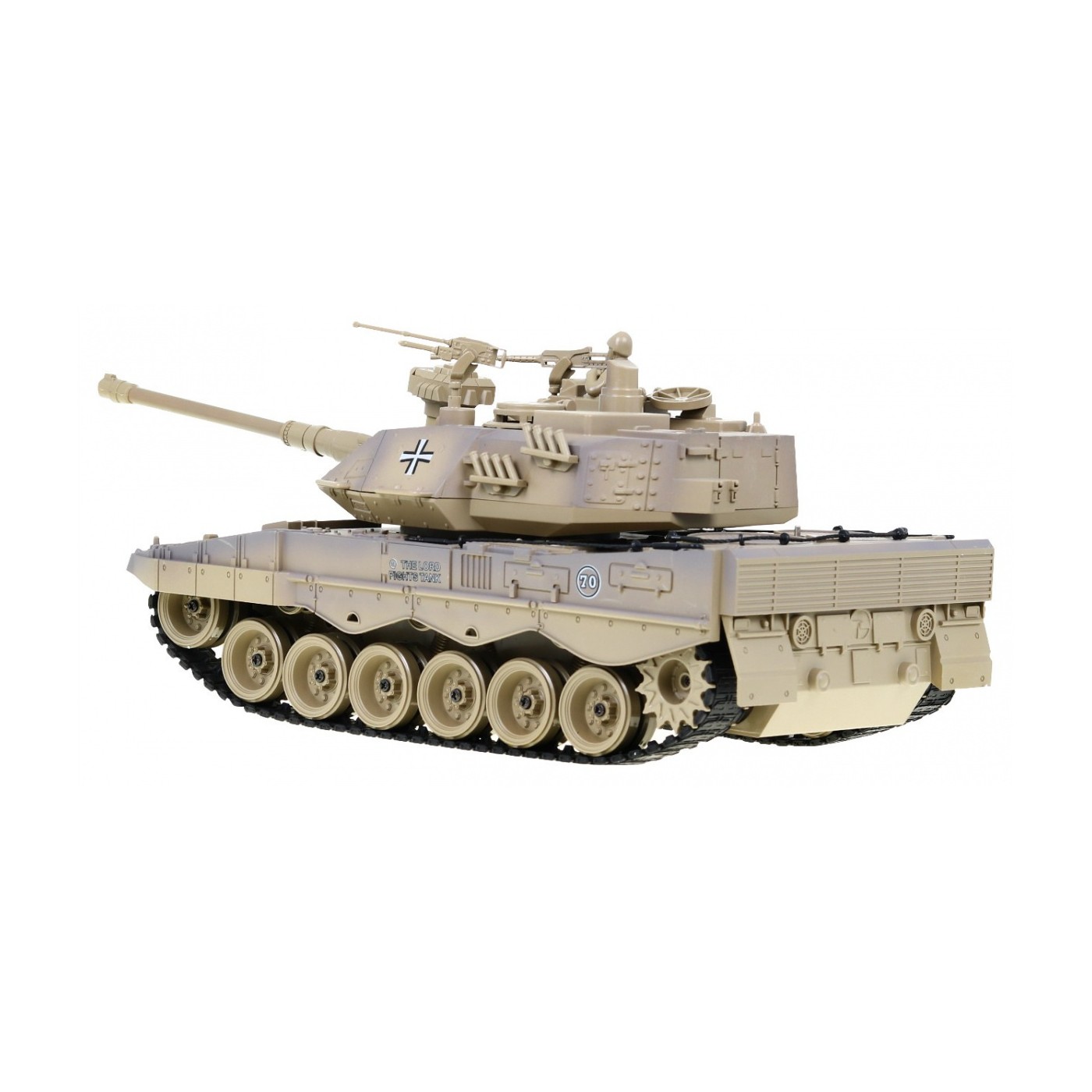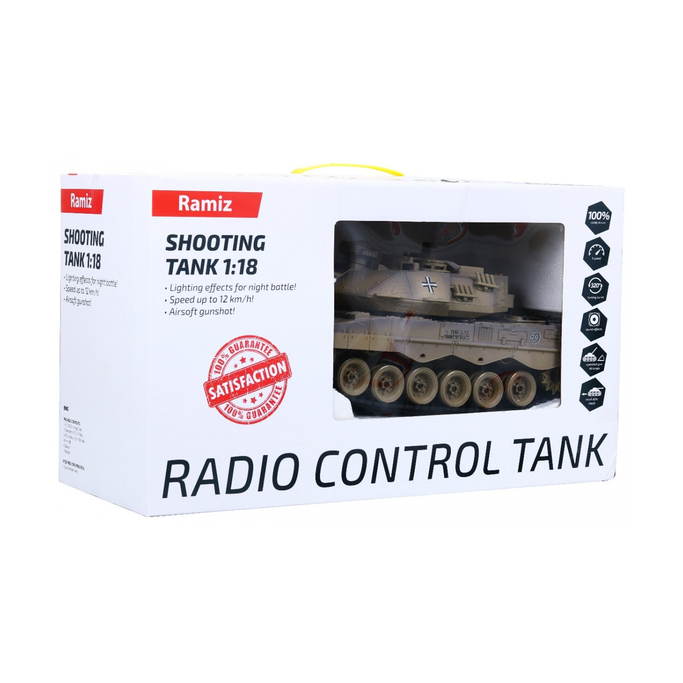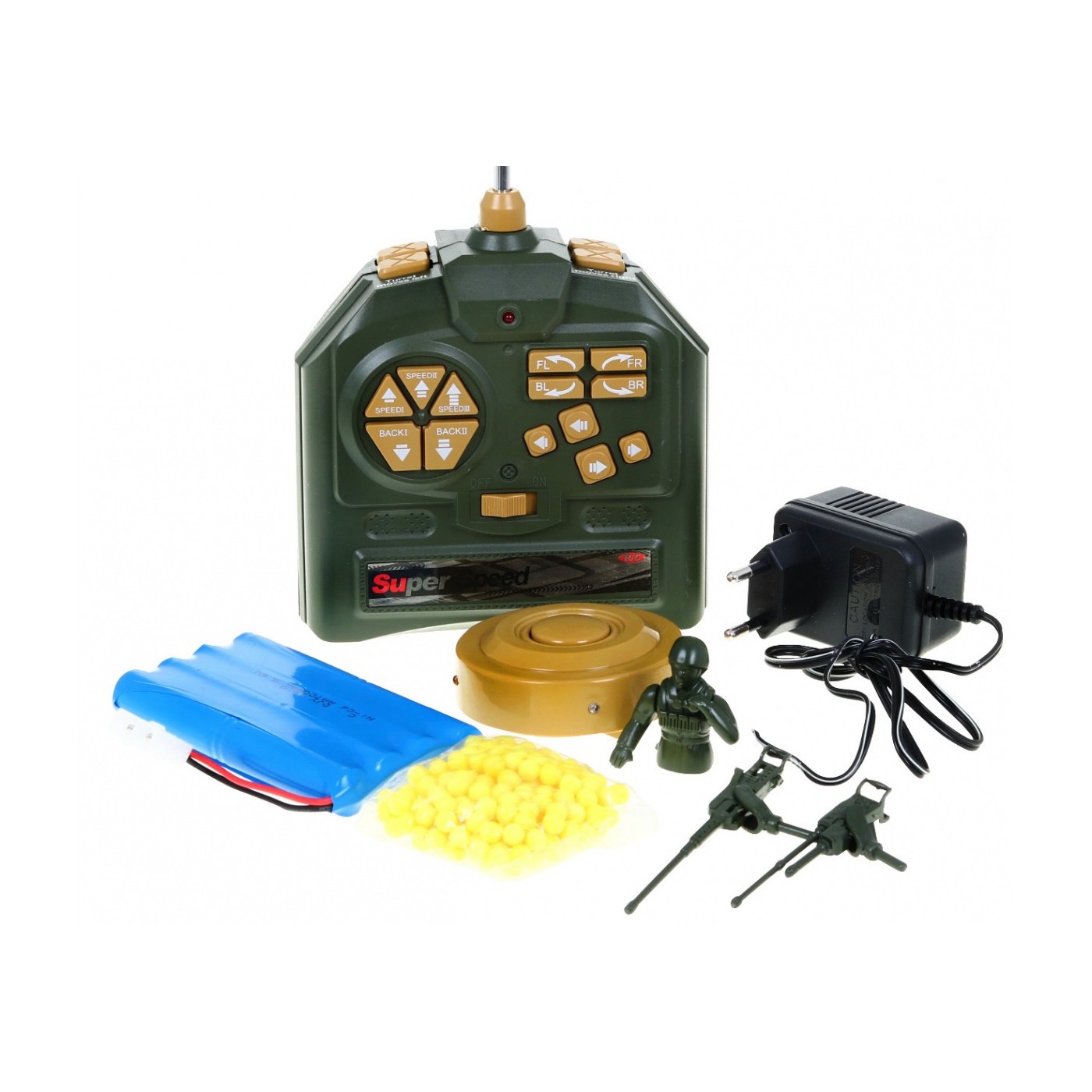 | Specyfikacja | - zasięg od 15 do 25 metrów, - 3 prędkości jazdy: 8km/h, 10km/h, 12km/h, - maksymalny kąt nachylenia powierzchni 45 stopni, - zasięg strzału do 12 metrów, - czas ładowania do 4 godzin, - obrót w miejscu 360 stopni, - obrót wieżyczki 320 stopni, - częstotliwość 27MHz, - działo typu BB (kulki o średnicy 6mm), z możliwością wyłączenia strzelania w ukrytym przełączniku pod włazem, - czołg może obracać się o 360 stopni, dodatkowo wieżyczka sterowana z pilota obraca się maksymalnie o 320 stopni, - lufa, która umieszczona jest w górnej części czołgu porusza się w górę i w dół. |