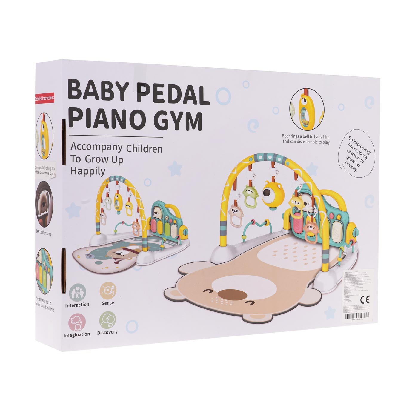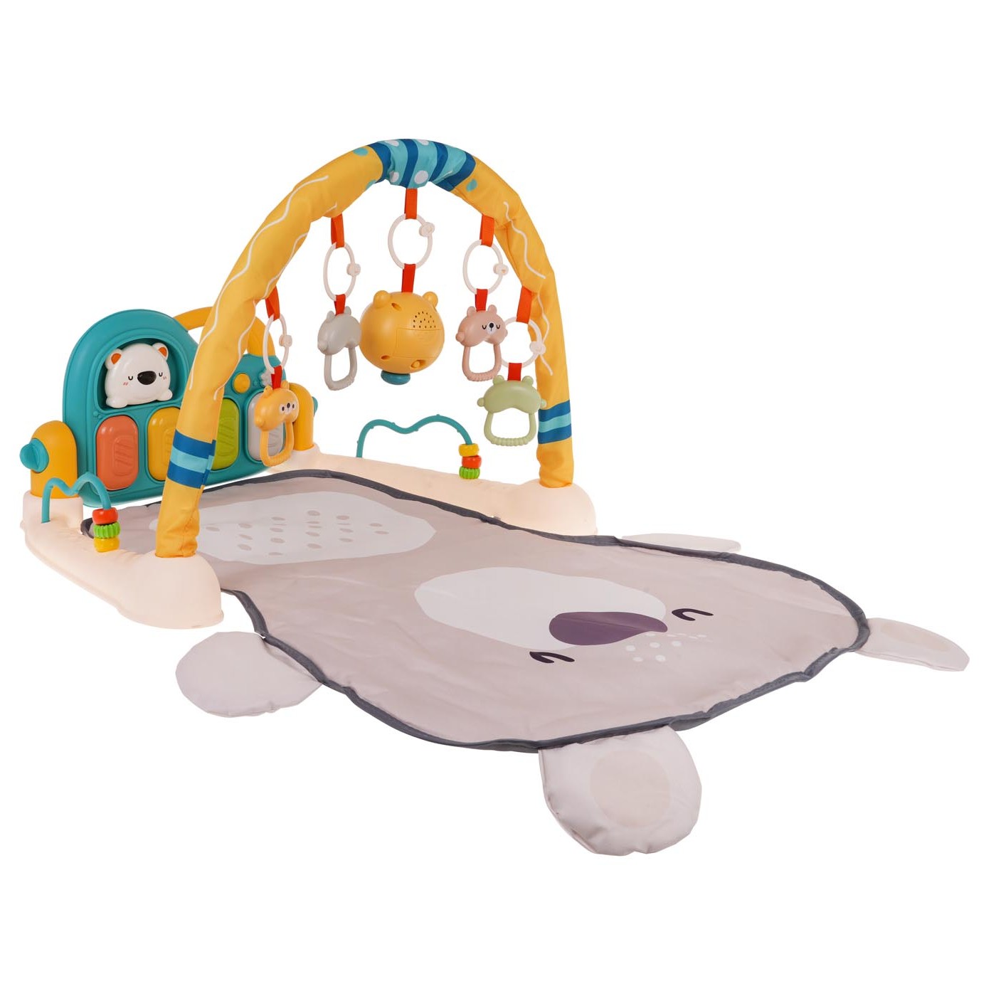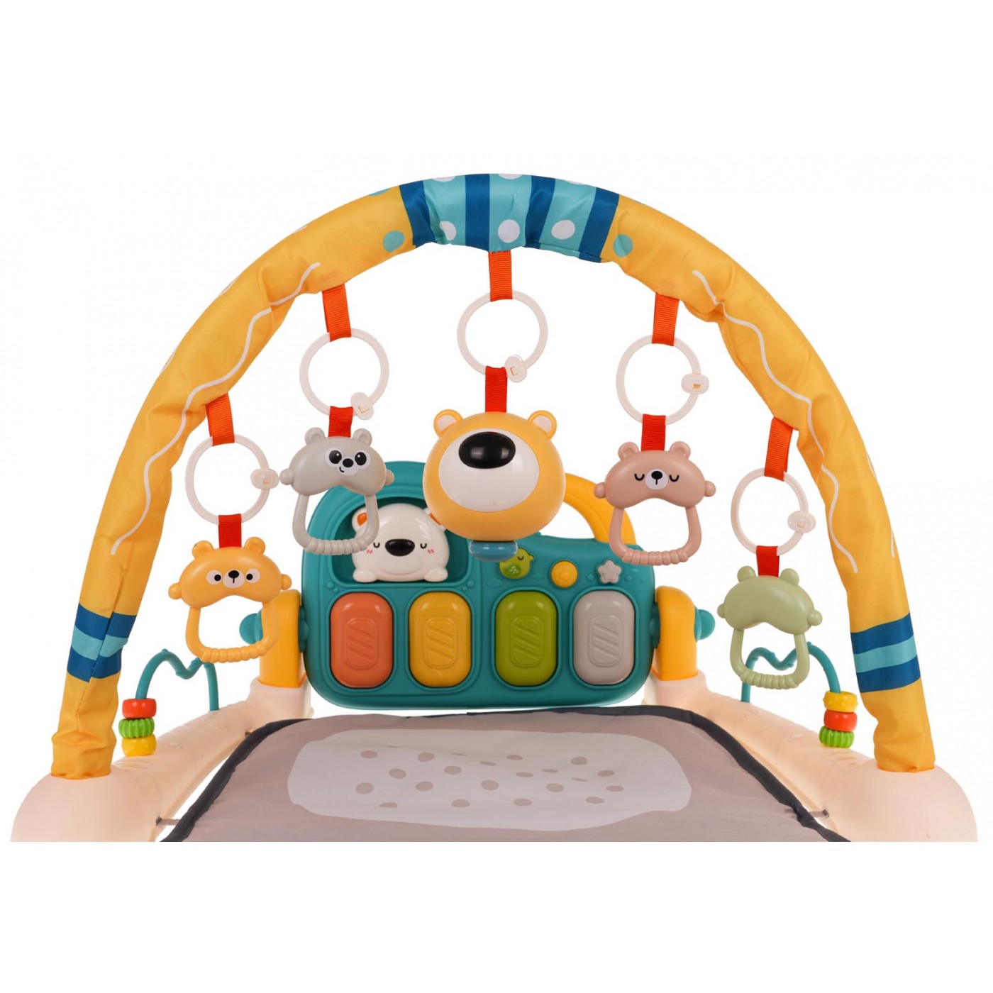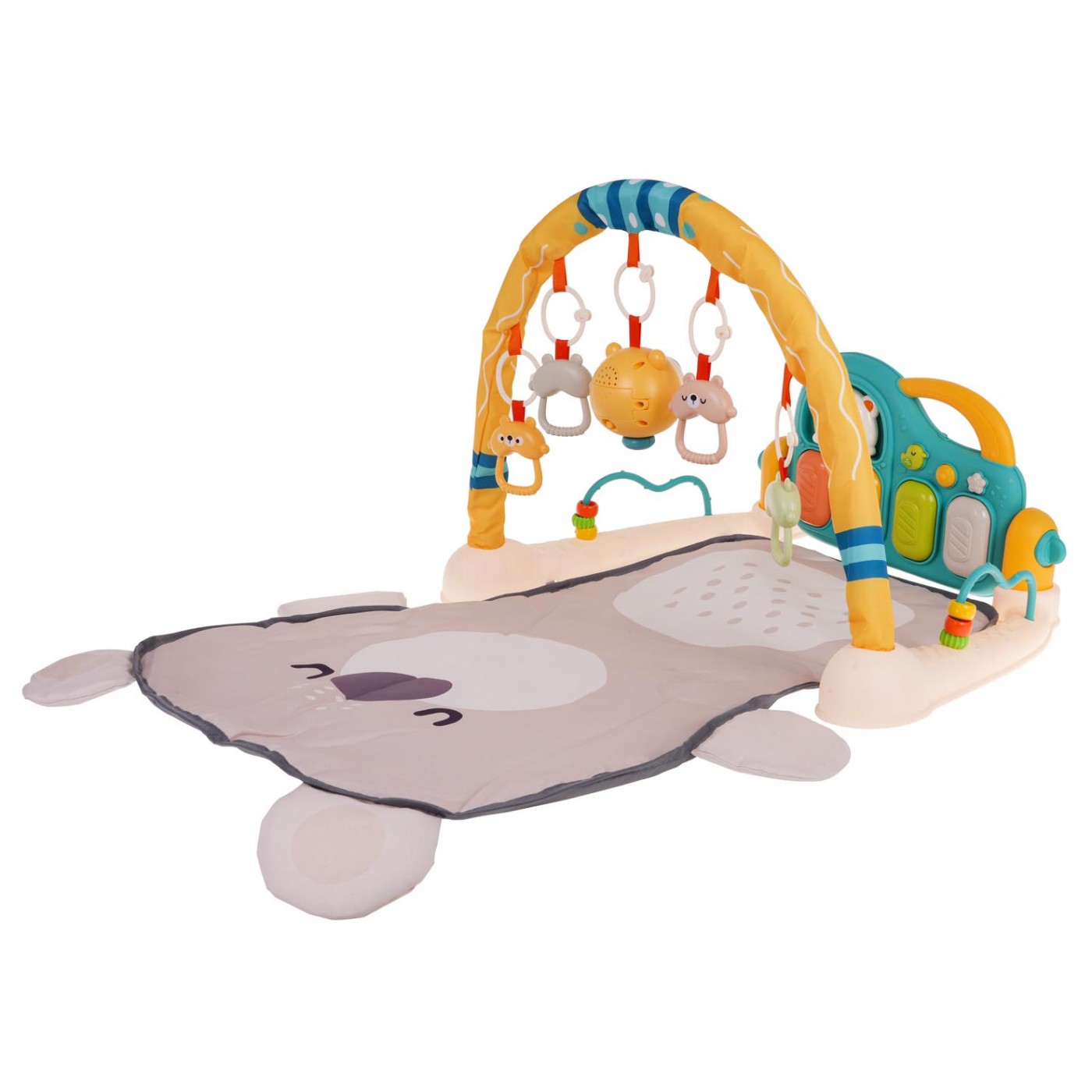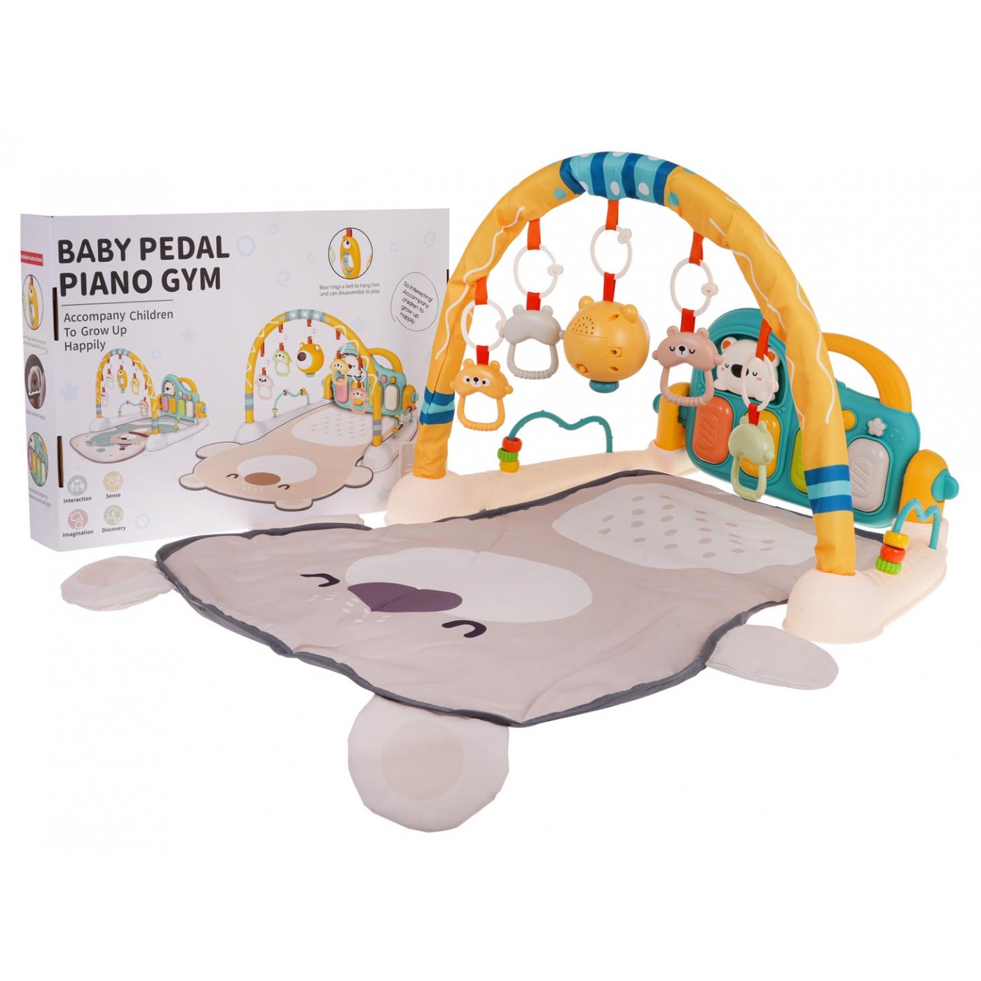 Interaktívna, multifunkčná podložka pre deti od prvých dní života. Set sa skladá z pohodlnej podložky pre bábätko, čelenky s príveskami a klavíra. Podložka rastie s dieťaťom. V prvom období života, do šiestich mesiacov života, môže bábätko ležať na pohodlnej podložke, kopať nohami do klavíra a pohybovať sa rukami, aby sa dostalo na prívesky na čelenke. Od šiestich do dvanástich mesiacov bude súprava mimoriadne nápomocná pri učení sa sedieť. Staršie dieťa vie hrať na klavíri samo. Klavír možno ľahko premeniť na hudobný stolík pomocou nastavovacích tlačidiel umiestnených na bočnej strane čelenky. Klavír môžeme nakloniť do niekoľkých polôh alebo ho odpojiť od súpravy a odniesť na rôzne miesta. Okrem toho má klavír pohodlnú rukoväť. Klavír je vybavený štyrmi klávesmi, každý s inou melódiou a 2 tlačidlami, ktoré menia funkcie klavíra z melódie na tóny. Nechýba ani vypínač a ovládanie hlasitosti. Na čelenke je 5 príveskov s medvedíkmi, ktoré aj jemne hrkajú. Stredný medvedík má navyše svetelné a zvukové funkcie. Po stranách základne sú rozpery s korálkami. Piano je napájané 3 x AA 1,5 V batériami (nie sú súčasťou), prívesok medvedík je napájaný 2 x AAA 1,5 V batériami.