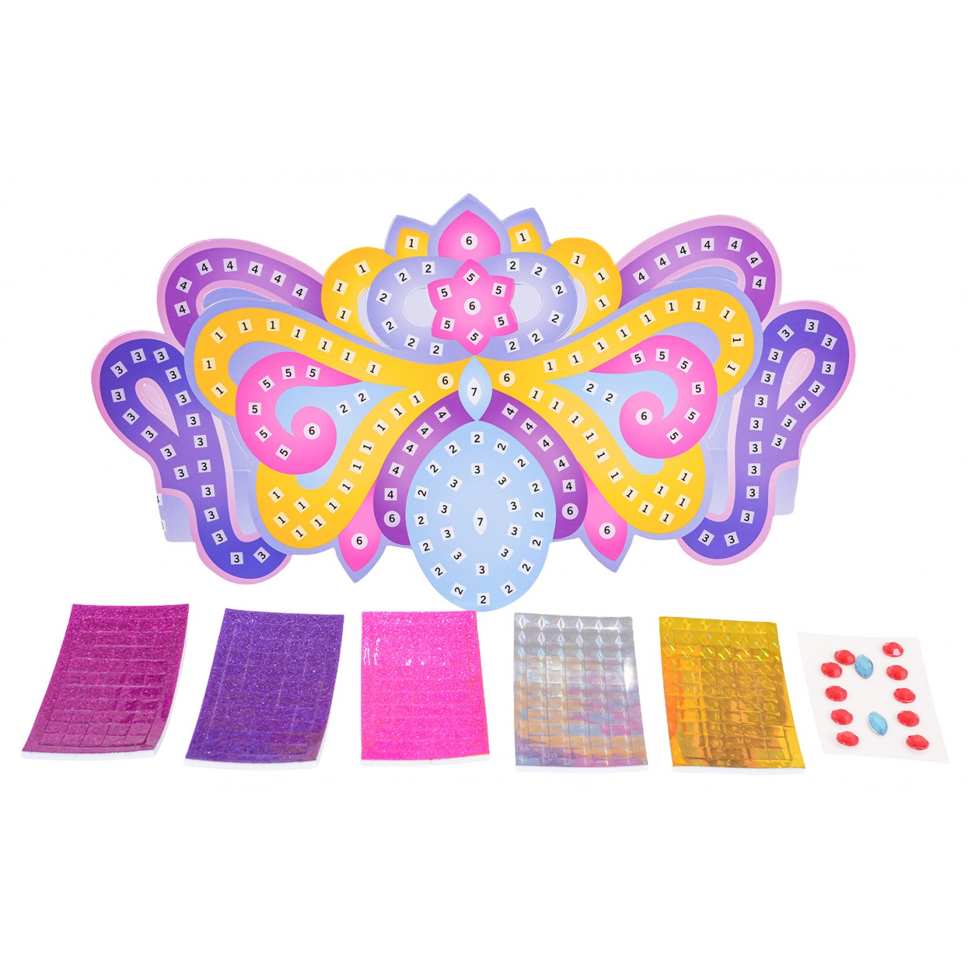 - kartónová tiara, - 5 listov rôznych farieb s nálepkami, spolu 200 štvorcov, - 10 okrúhlych kryštálov, - 2 predĺžené kryštály. |