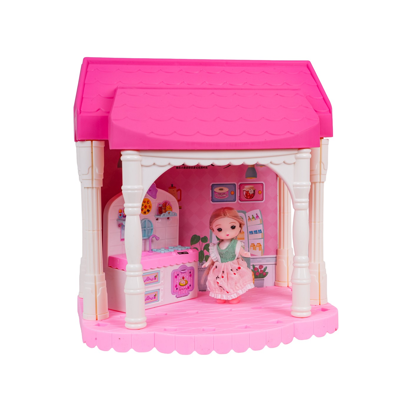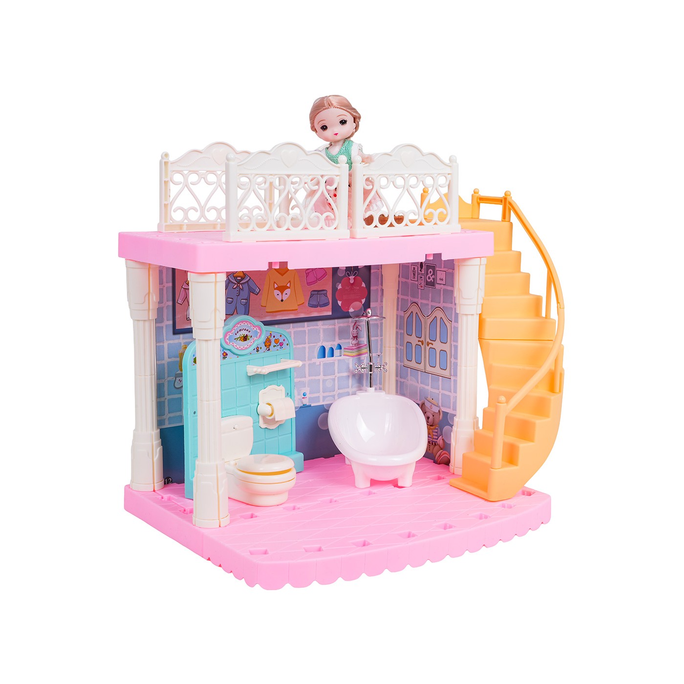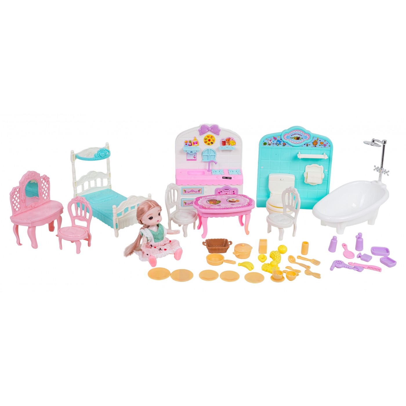 - bábika, - toaletný stolík, - posteľ, - vaňa so sprchovacím kútom - kuchynský panel s drezom, sporákom, skrinkami, - kúpeľňový panel s toaletou, poličkou a toaletným papierom, - bábika, - stôl, - 3 x stolička, - ďalšie doplnky ako: košík, taniere, hrnce, kúpeľňové doplnky, - pokyny. |