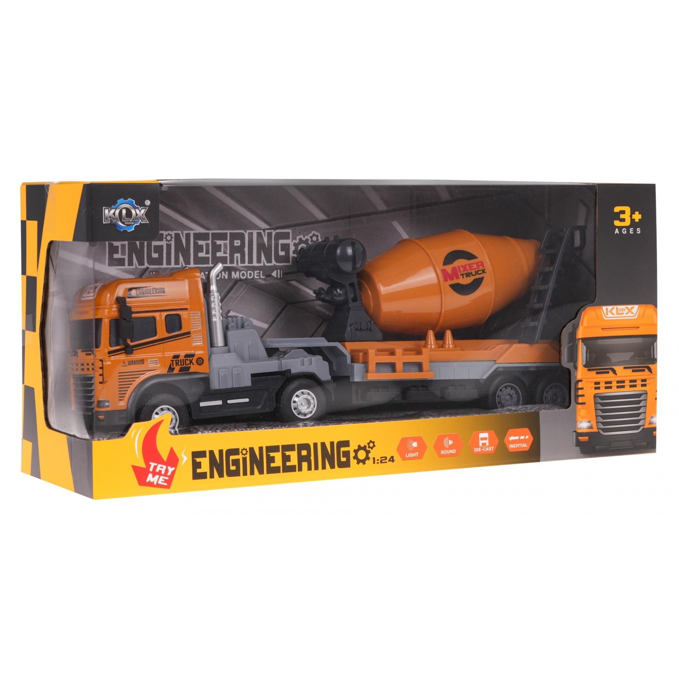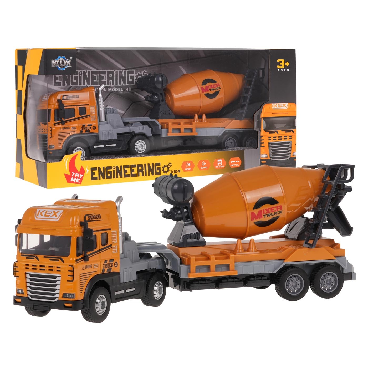 Interaktívna miešačka betónu pre deti od 3 rokov. Domiešavač betónu je vyrobený v mierke 1:24, má odolnú kovovú kabínu a otočný príves z najkvalitnejšieho plastu. Príves je odnímateľný, betónová hruška je pohyblivá. Vozidlo má blikajúce svetlomety a zvukové funkcie: zvuk jazdy vozidla, klaksón, zvuk pri cúvaní. Kolesá vozidla majú gumový behúň a pohon zadných kolies. Hračka je napájaná 3 x AG3 batériami (sú súčasťou balenia).