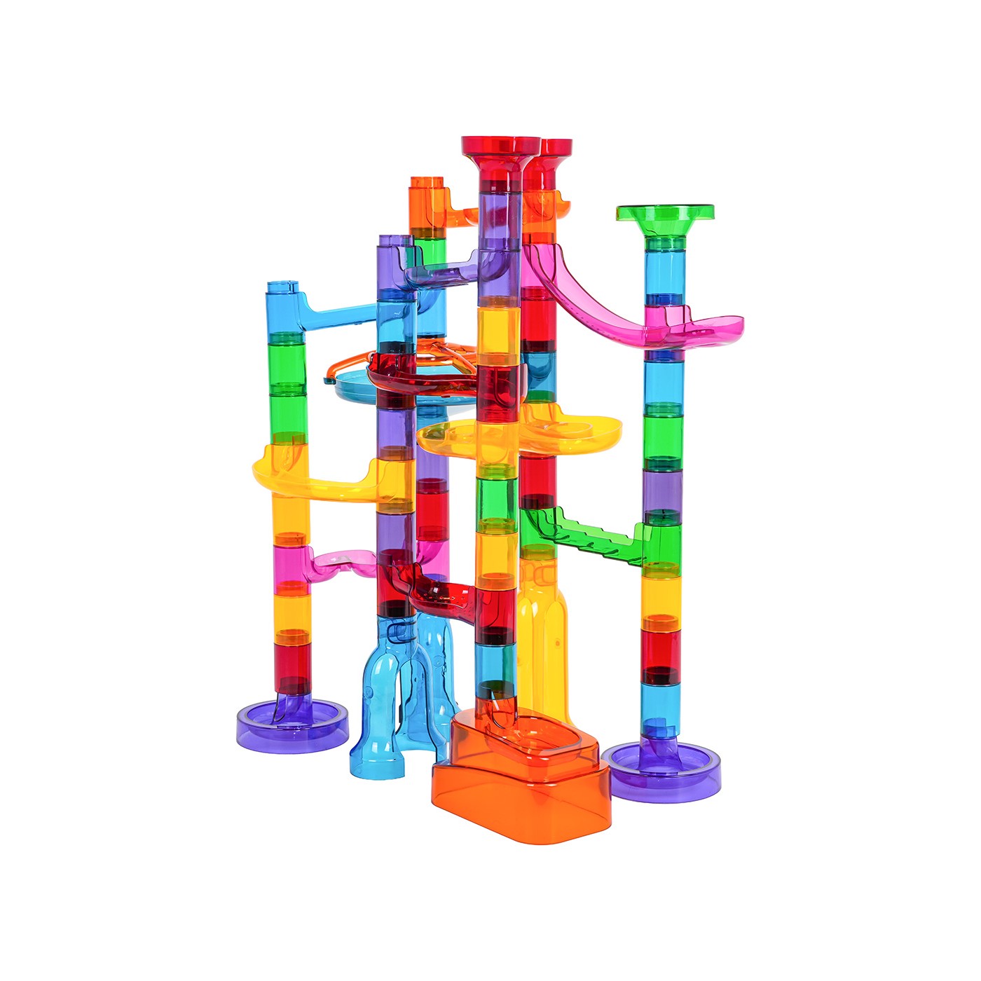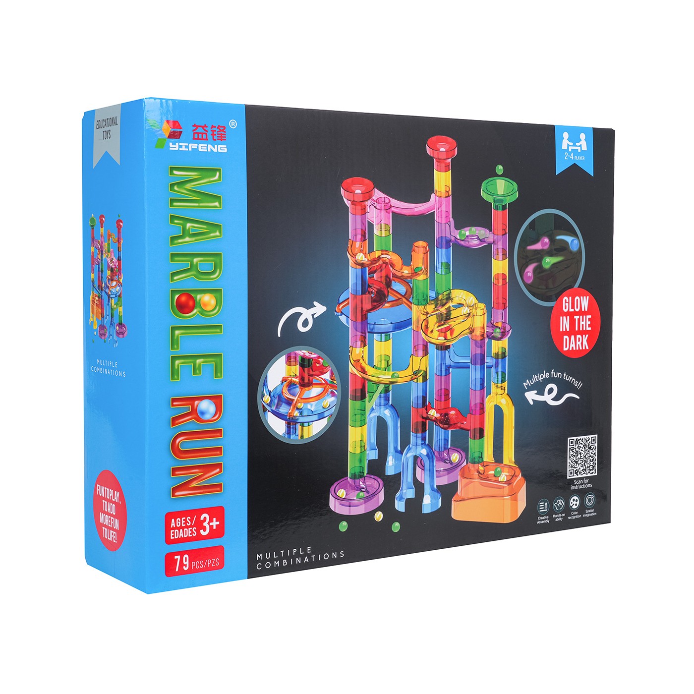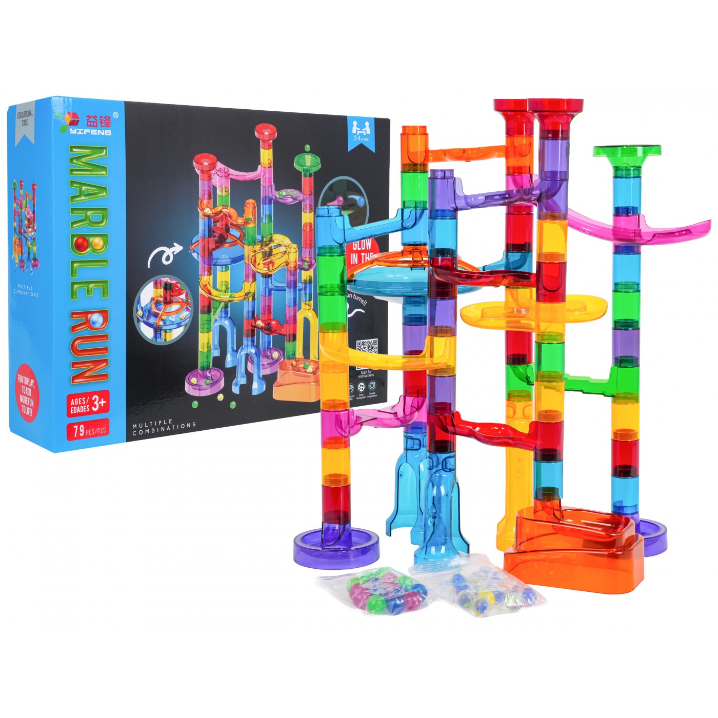 - konštrukčné prvky koľají, - 15 x svietiaca guľa v tme, - 15 farebných guličiek, - obrázkový návod na použitie. |