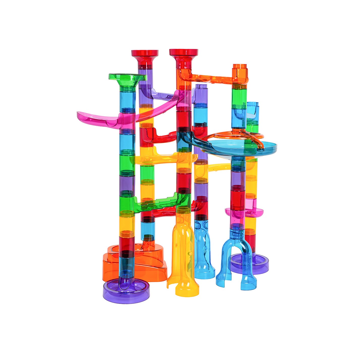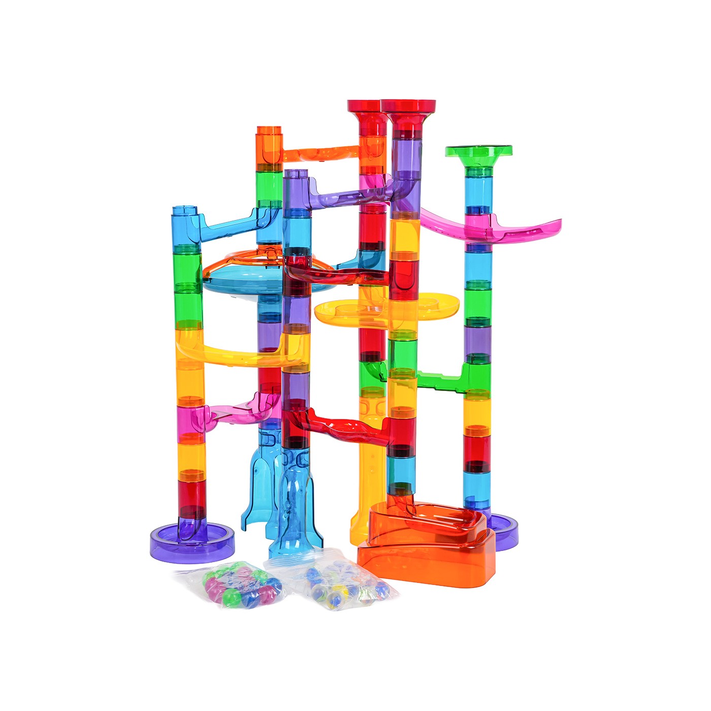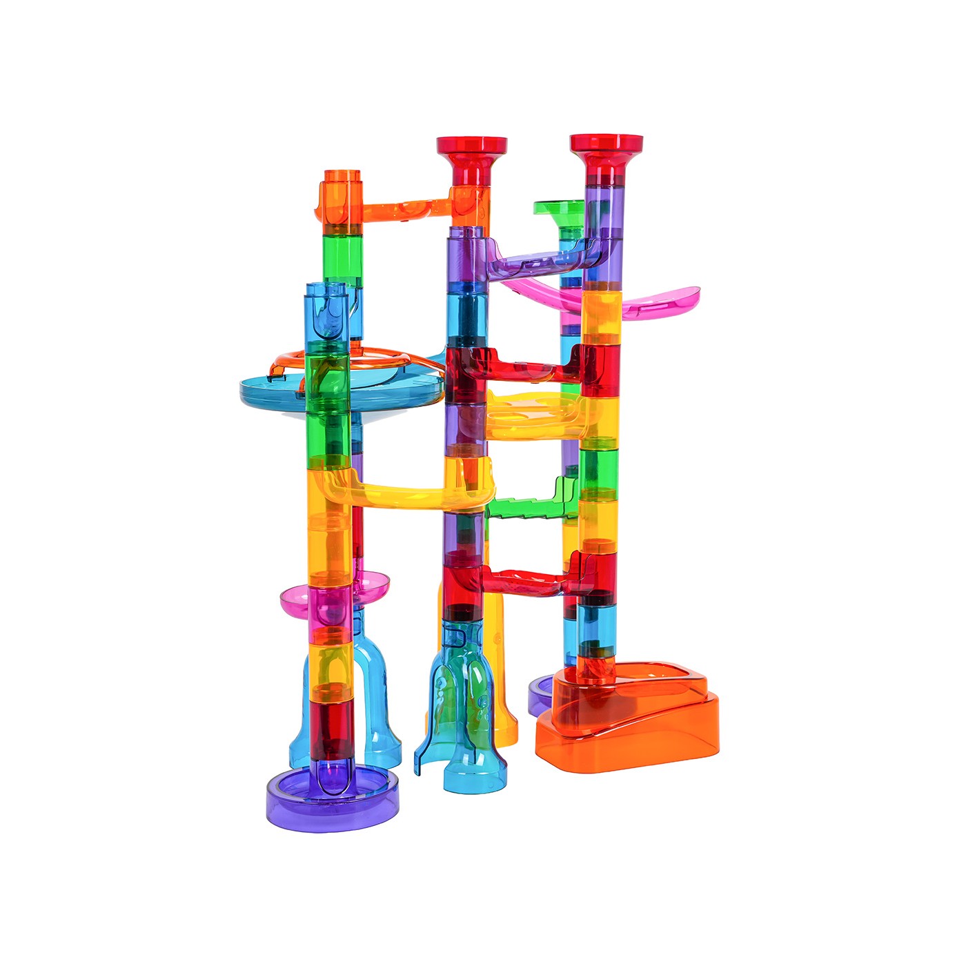 - konštrukčné prvky koľají, - 15 x svietiaca guľa v tme, - 15 farebných guličiek, - obrázkový návod na použitie. |