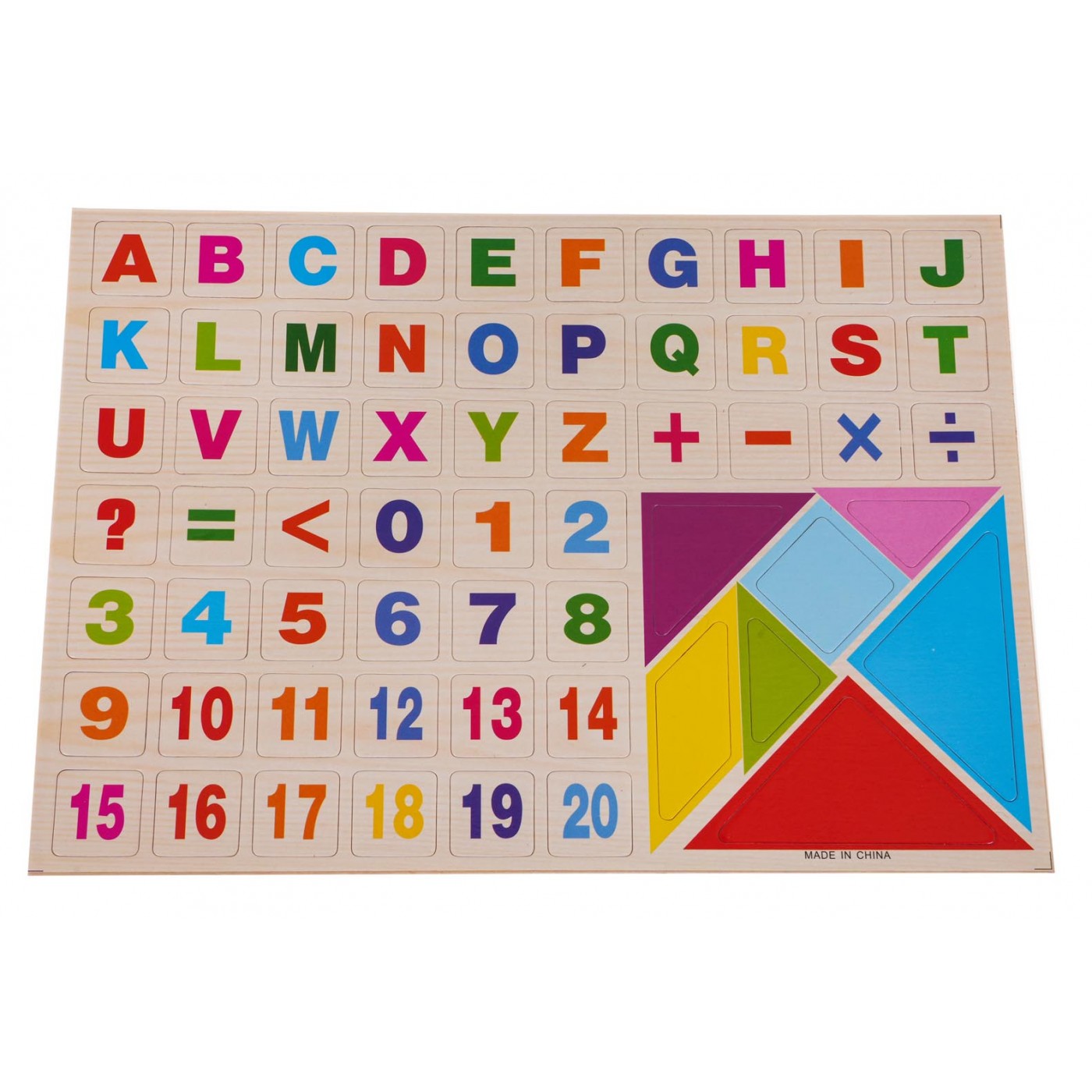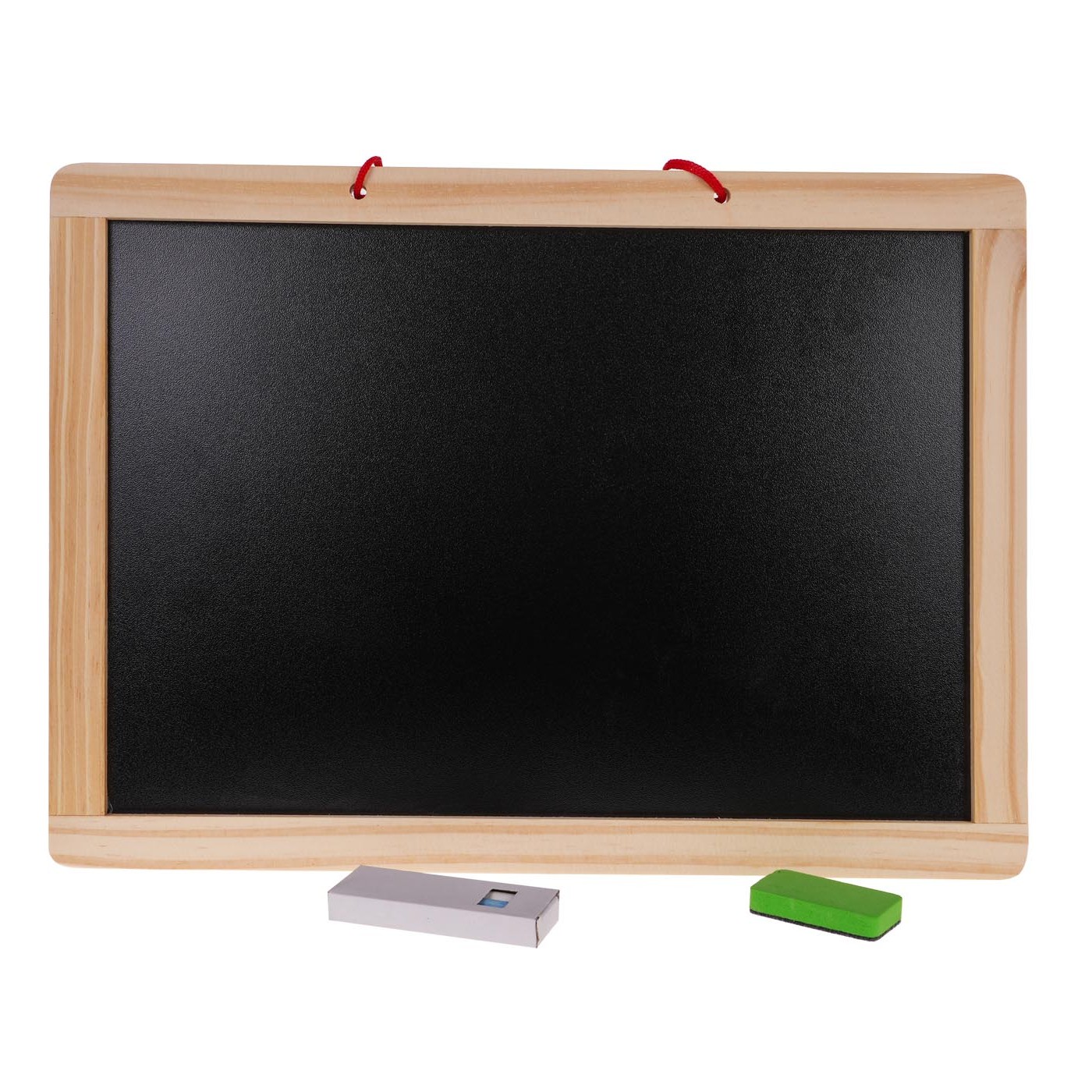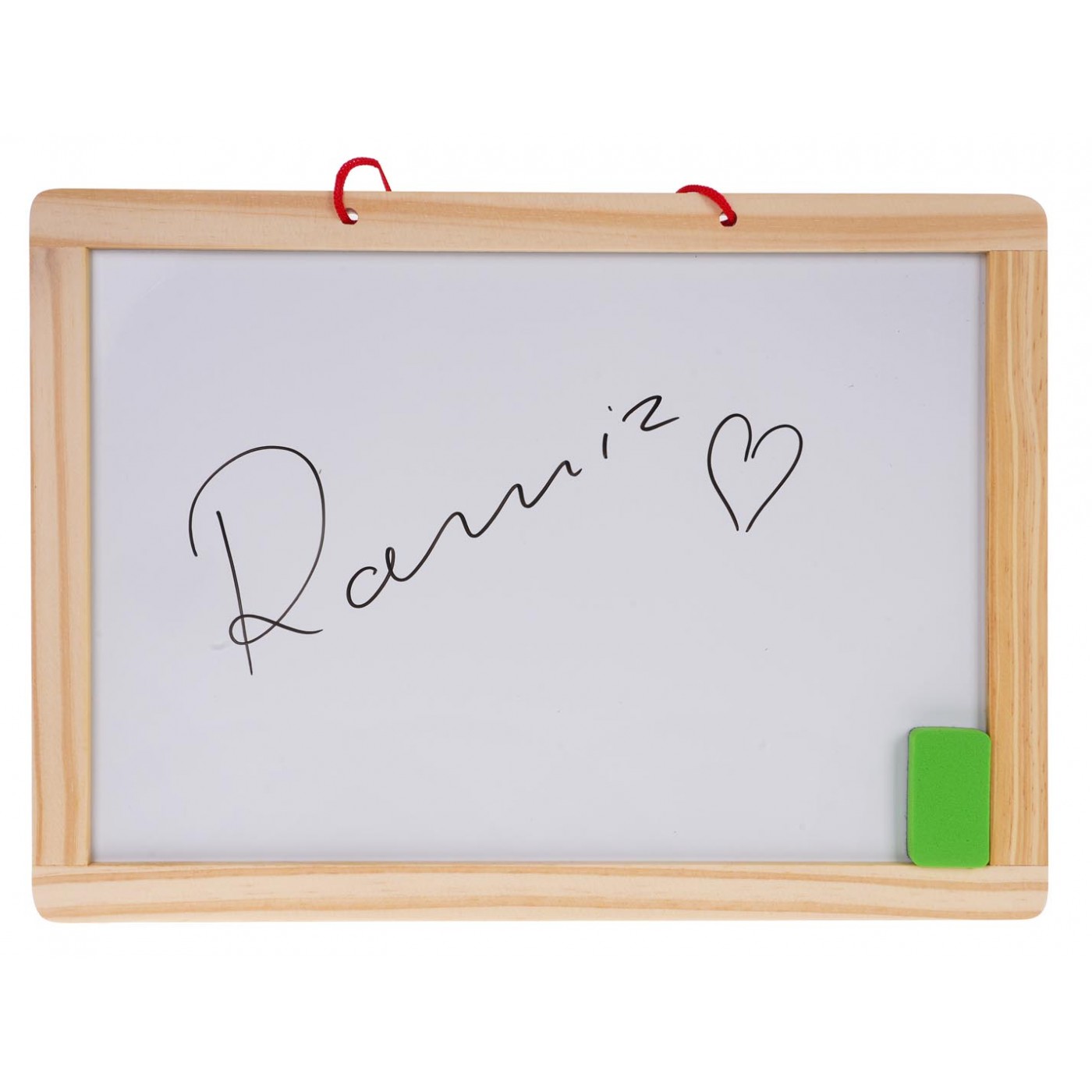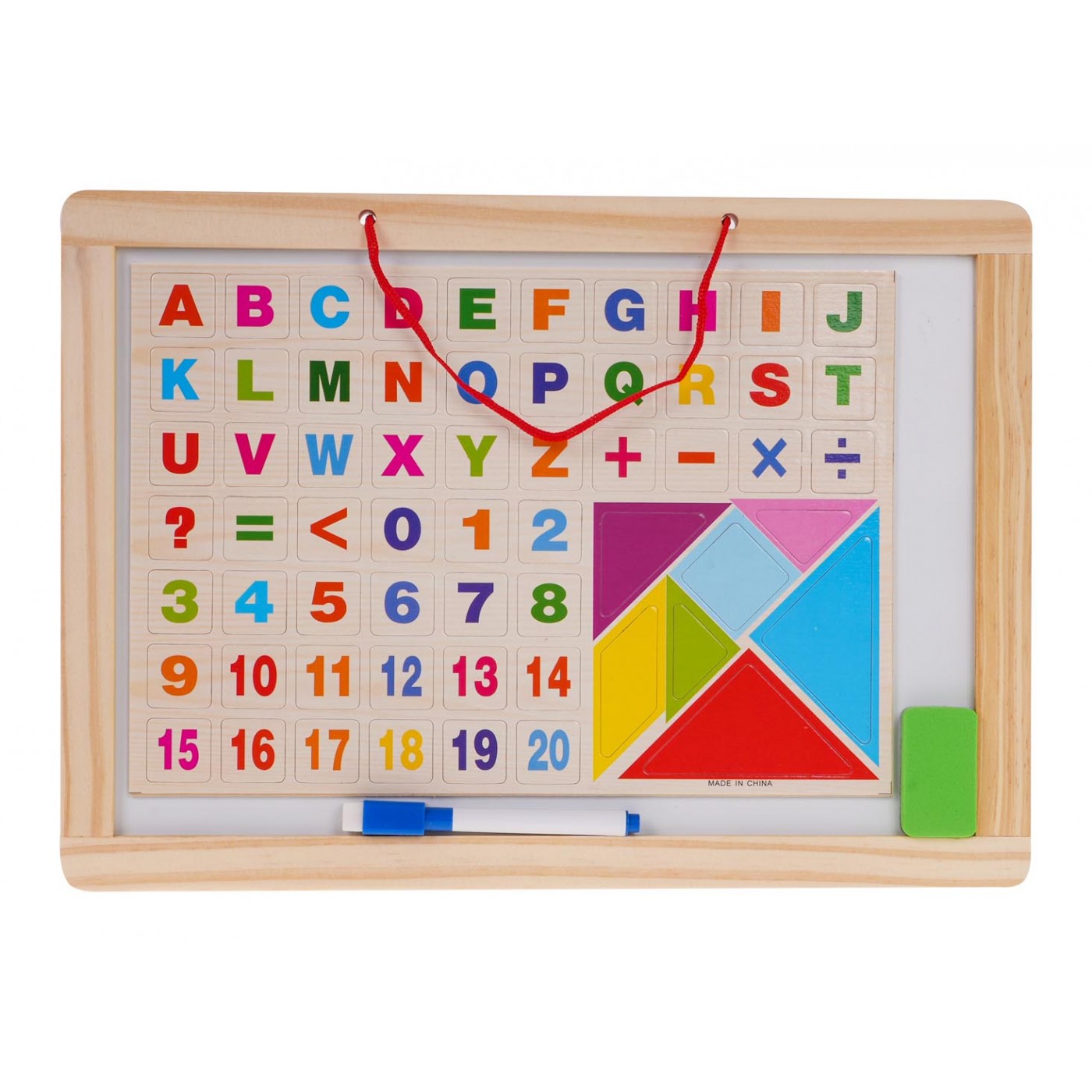 Drevená, obojstranná tabuľa s doplnkami pre deti od 3 rokov. Tabuľa je z jednej strany čierna na maľovanie kriedou a z druhej biela na písanie fixkami stierateľnými za sucha . Sada obsahuje aj kriedu, za sucha stierateľný fix , špongiu a magnetky s písmenami a číslami, ako aj geometrickými obrazcami.