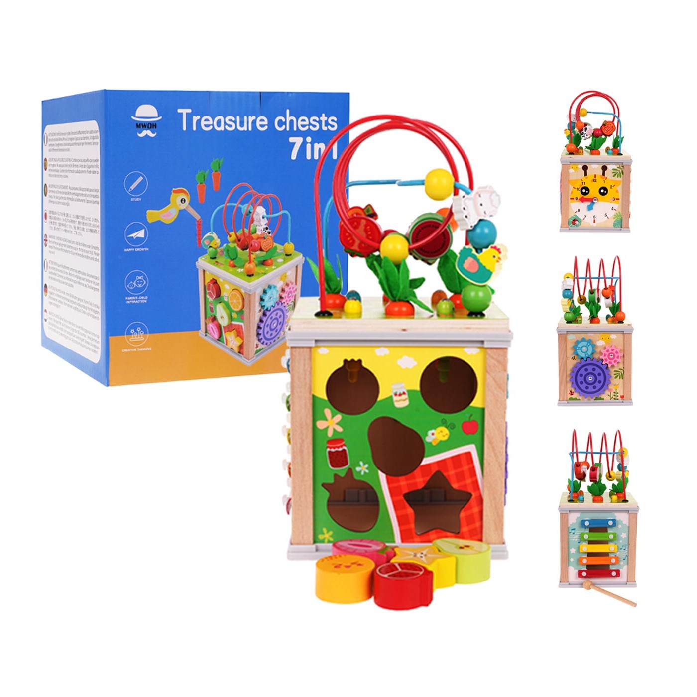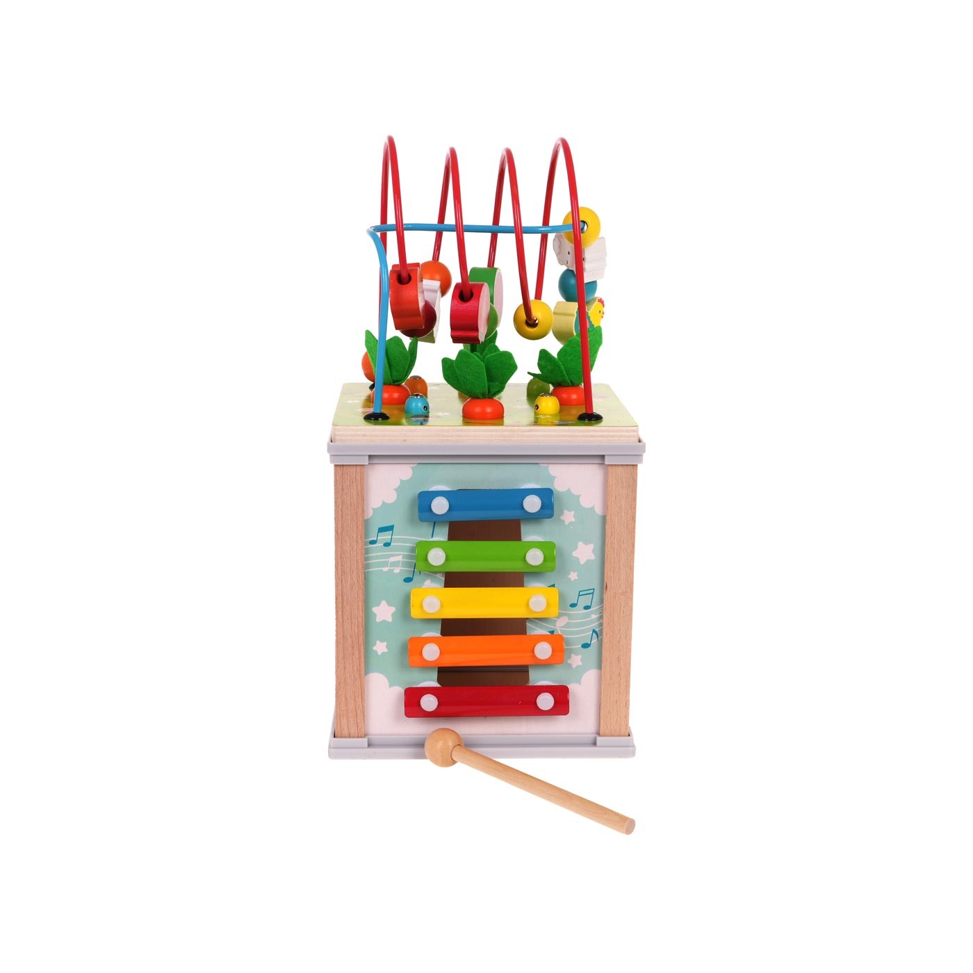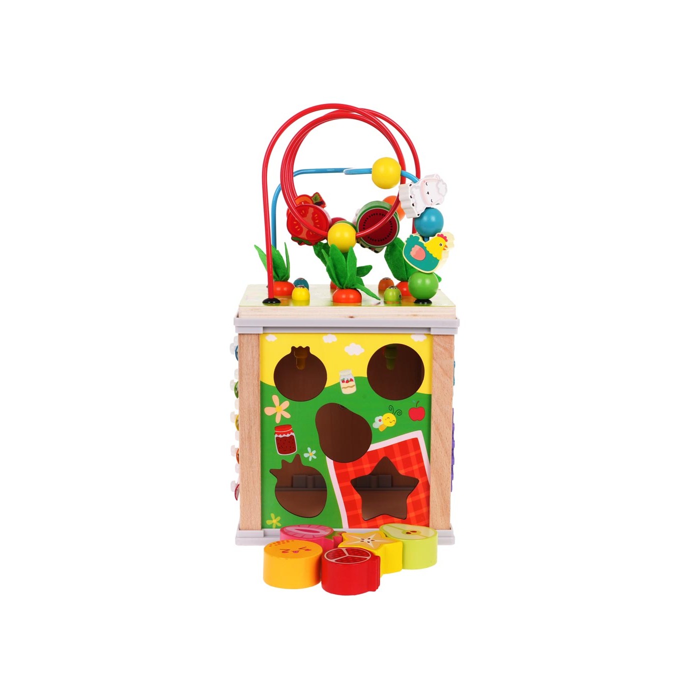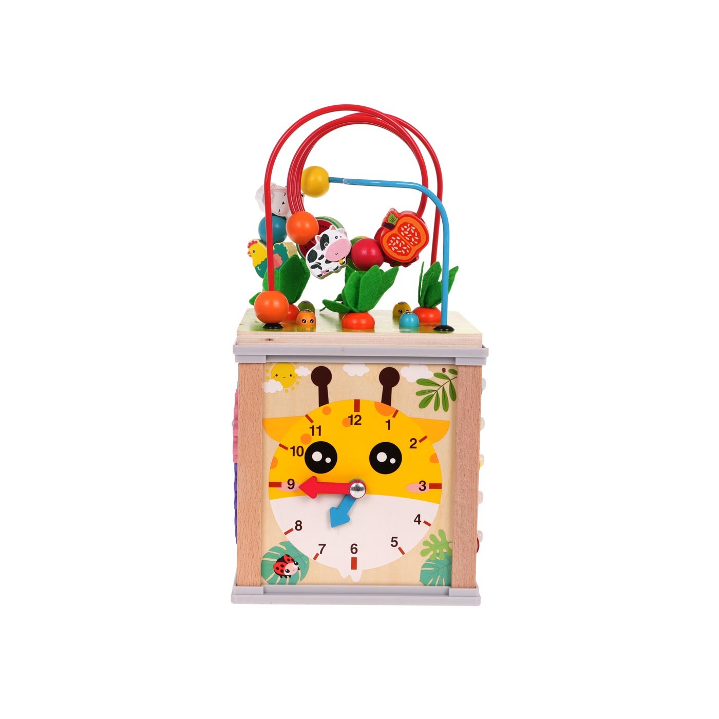 Drevená, farebná, bezpečná kocka pre deti od troch rokov. Hra s touto kockou stimuluje predstavivosť a kreativitu. Bábätko si precvičuje manuálne zručnosti a koordináciu oko-ruka a učí sa rozpoznávať farby a tvary. Drevená kocka a jej prvky sú vyrobené z kvalitného dreva, natreté nezávadnou farbou, sú trvácne a odolné voči poškodeniu, hračka vydrží roky. Kocka sa skladá zo šiestich bočných plôch. Na piatich stranách kocky sú rôzne atrakcie. Stena s hodinami
