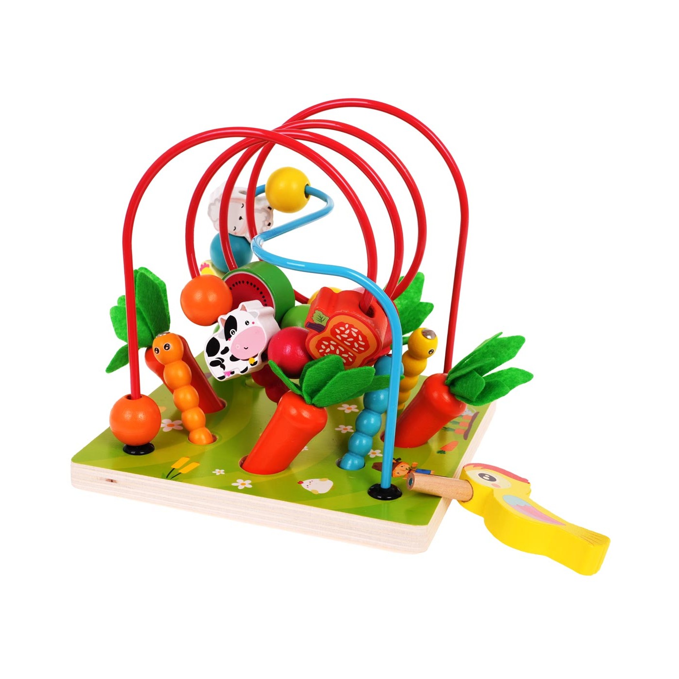 Na tejto stene sú otvory na vloženie drevených mrkvičiek a červíkov. Červíky majú magnety, treba ich odstrániť pomocou vtáčika, ktorý má magnet aj na zobáku. Nad doskou s otvormi na červíky a mrkvu je vrstva guľôčok. |