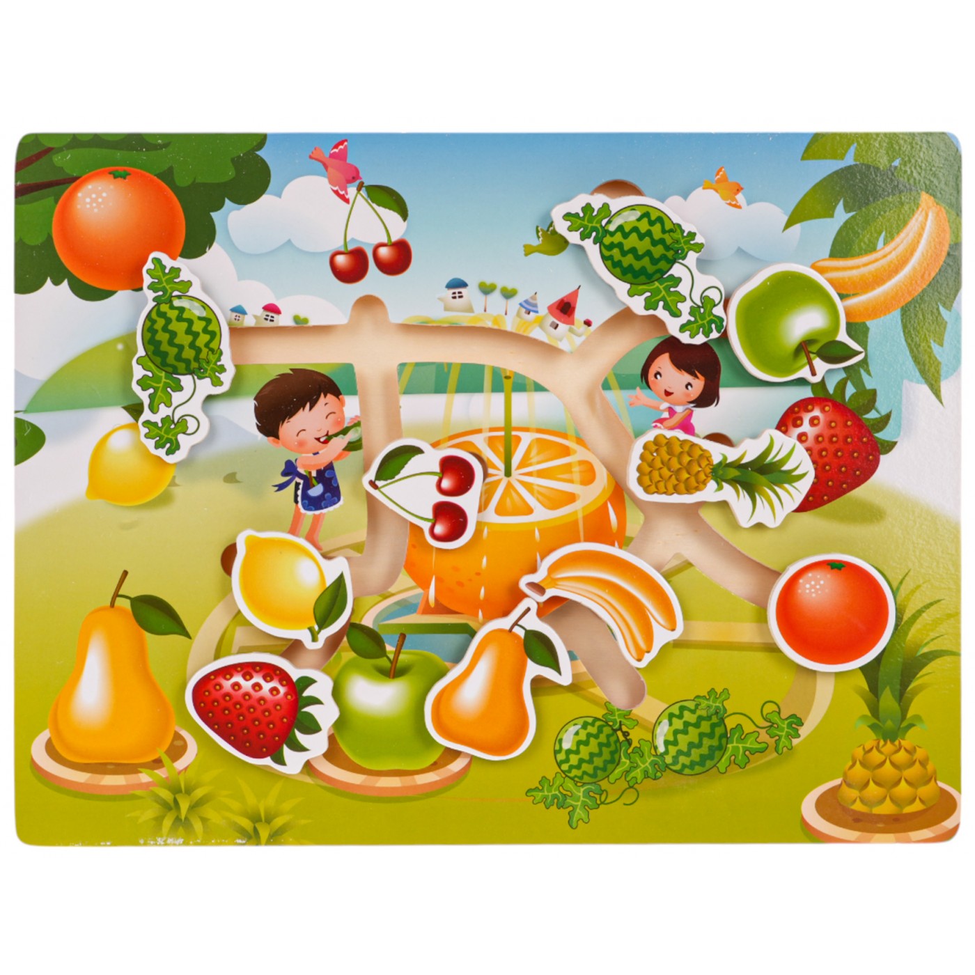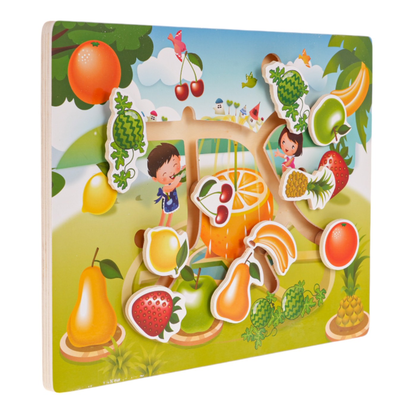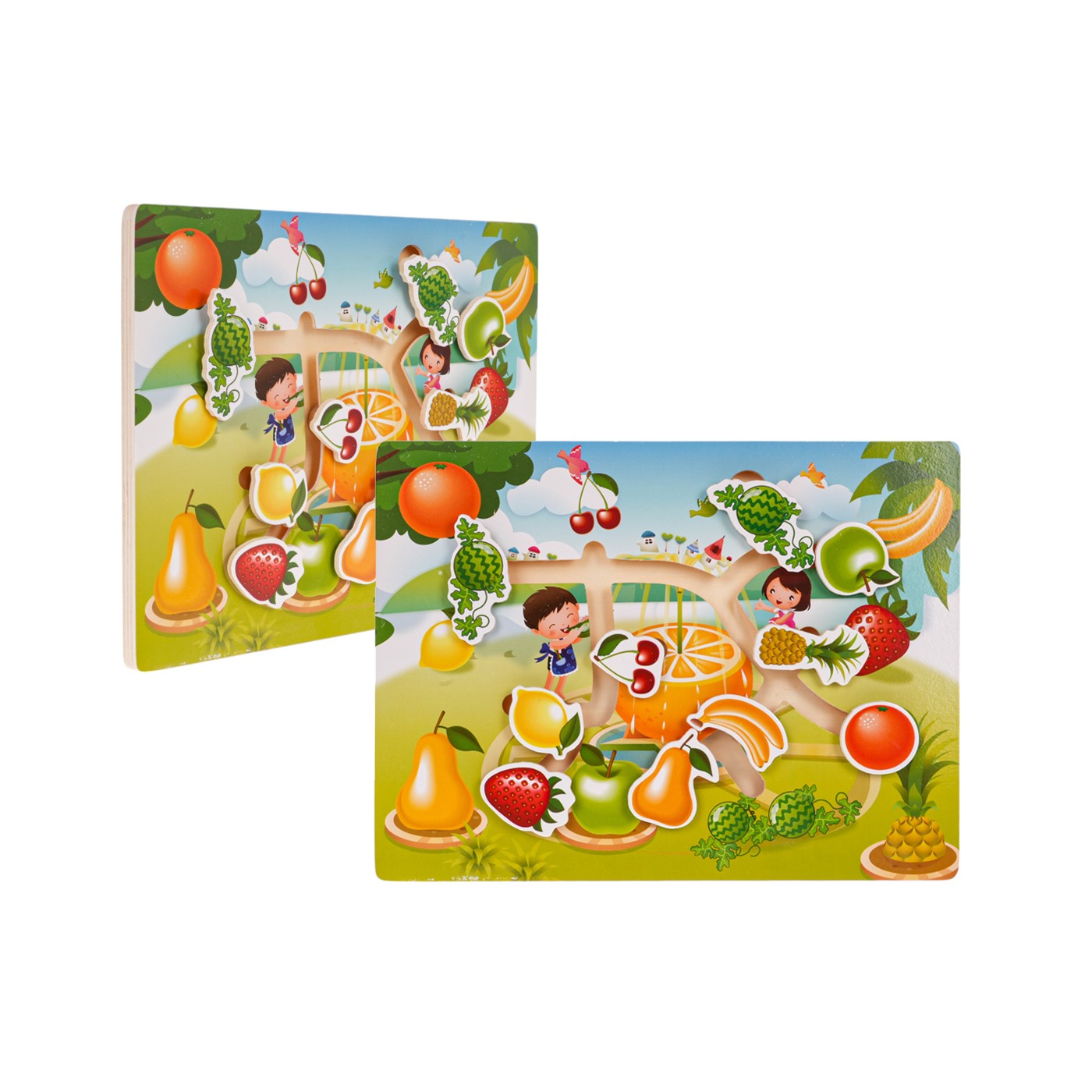 Drevené puzzle, chlebíček s ovocím pre deti od 3 rokov. Na drevenej doske je desať dielikov s kresbami ovocia (2 x egreše, ananás, jahoda, banány, jablko, čerešne, pomaranč, citrón, hruška), ktoré treba umiestniť na správne miesta na doske. Puzzle precvičuje koncentráciu a logické myslenie, učí vnímavosti, tvarom a farbám.