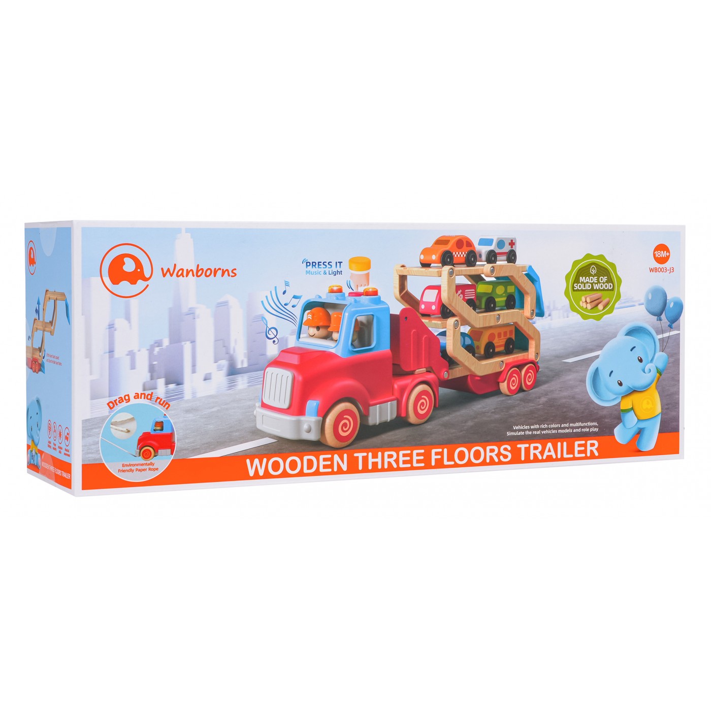 Toto drevené interaktívne odťahovka s vozidlami je ideálne pre deti od osemnástich mesiacov. Hračka je vyrobená z najkvalitnejších materiálov: plastu a dreva. Živé farby pútajú pozornosť detí a povzbudzujú k hre. Odťahovku je možné od vozidla oddeliť alebo rozložiť a vytvoriť tak dráhu pre autá. Sada obsahuje šesť drevených vozidiel: policajné auto, taxík, hasičské auto, sanitku, autobus a dodávku. Tlačidlo na streche vozidla generuje zvuky, ako je štartovanie auta, trúbenie alebo prehrávanie melódie. Zvukové efekty sú sprevádzané blikajúcimi svetlami. Slučka v prednej časti auta umožňuje pripevniť k hračke šnúrku. Hračka je napájaná 3 batériami AG13 (súčasťou balenia).