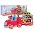 - prepravca automobilov, - 6 vozidiel: polícia, taxi, hasičské auto, sanitka, autobus, dodávka, - 2 x drevená figúrka. |