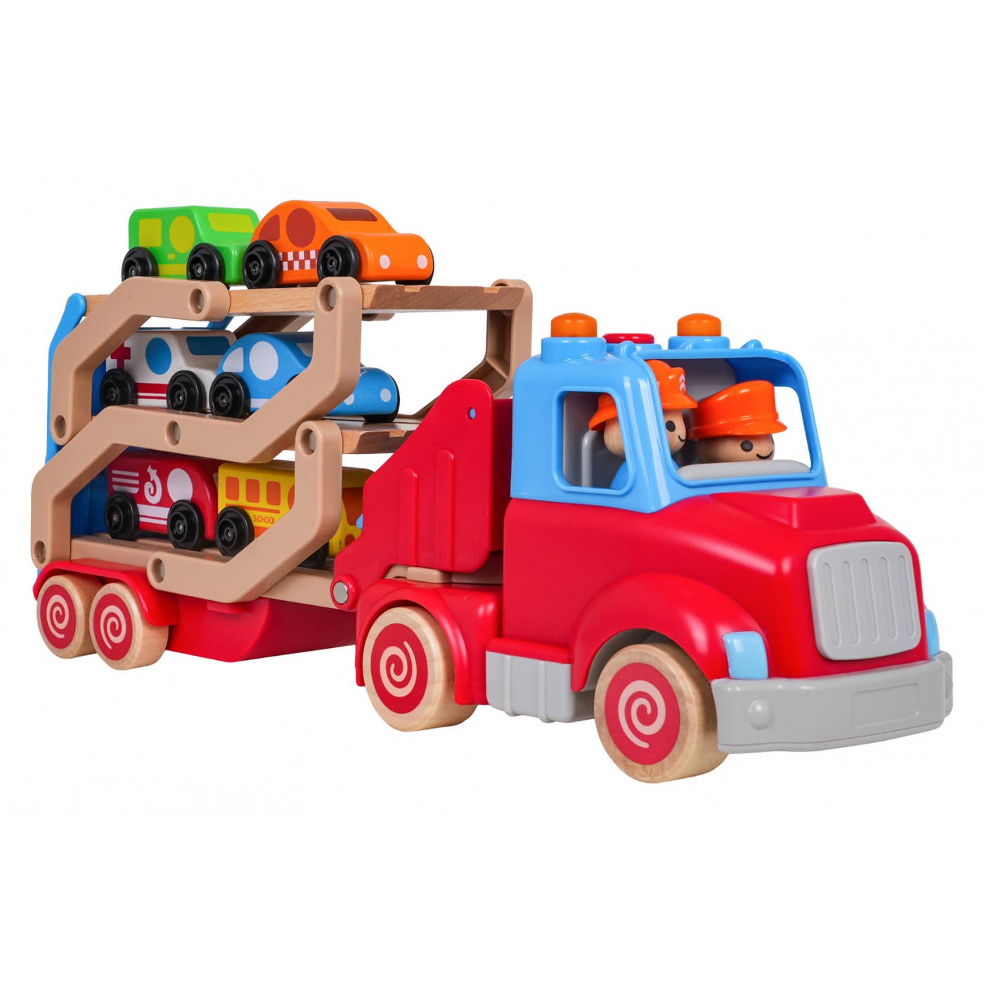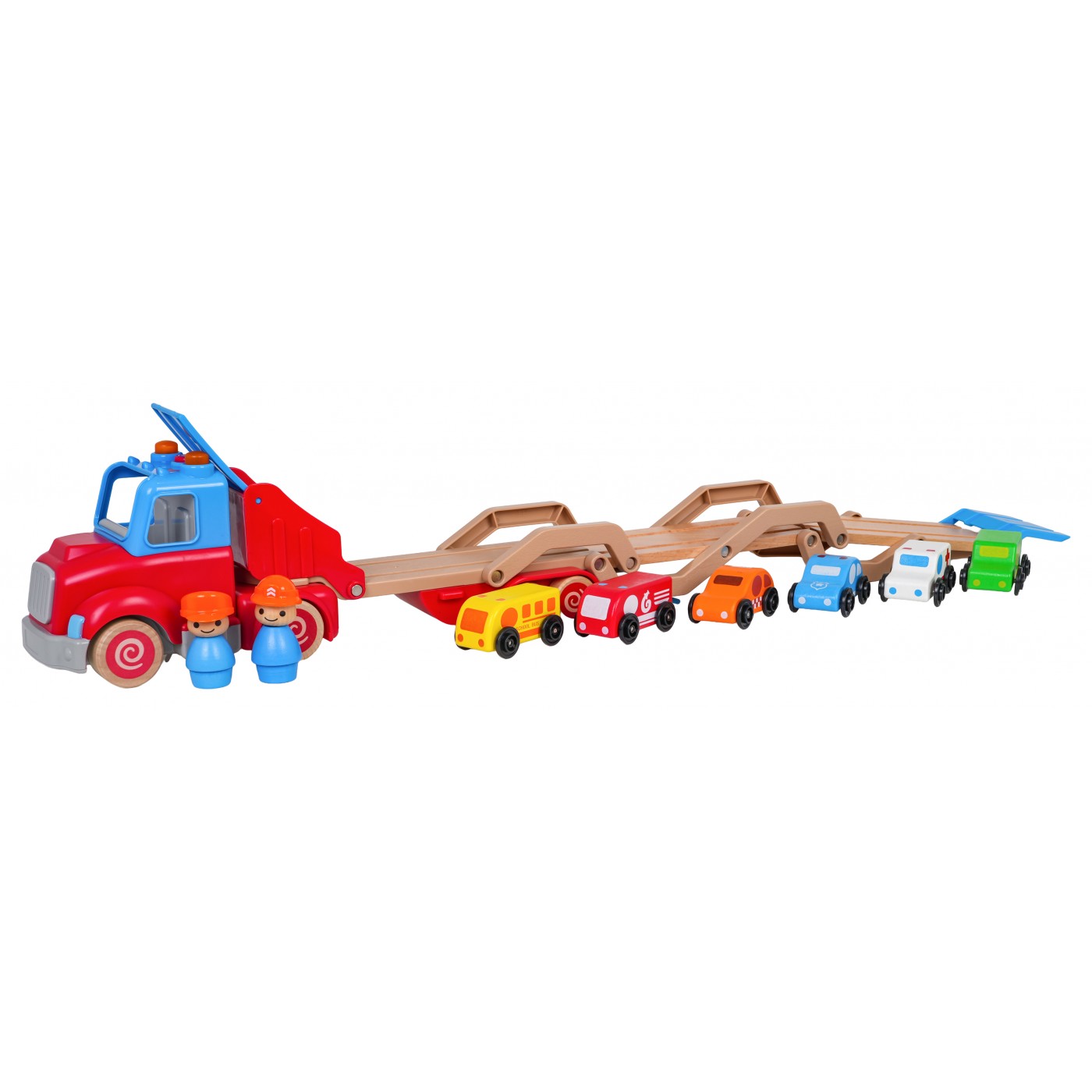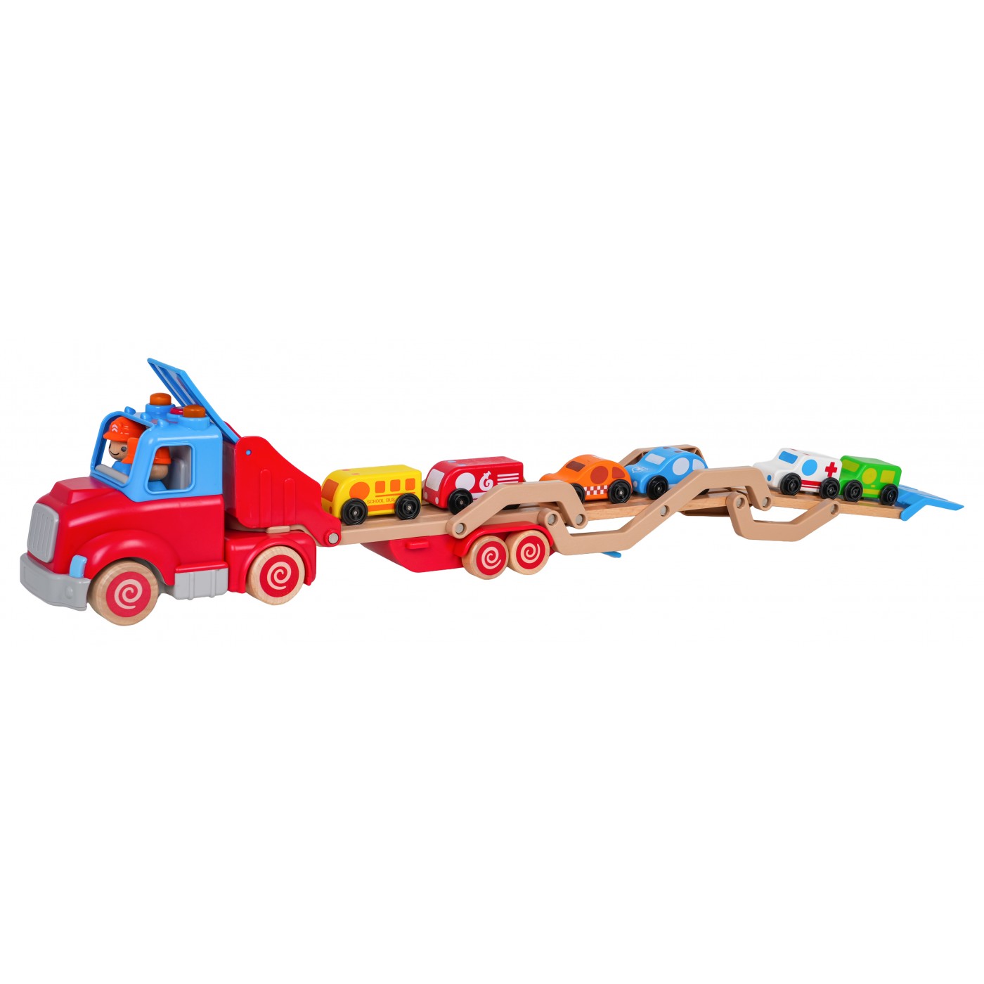 Vlastnosti: - hračka vhodná pre deti od osemnástich mesiacov, - vyrobené z dreva a plastu, - nemá ostré konce, - 6 vozidiel a 2 figúrky postáv sú súčasťou balenia, - zvukové efekty: štartovanie nákladného auta, trúbenie, prehrávanie melódií, - svetelné efekty, dve blikajúce svetlá na streche nákladného auta. |