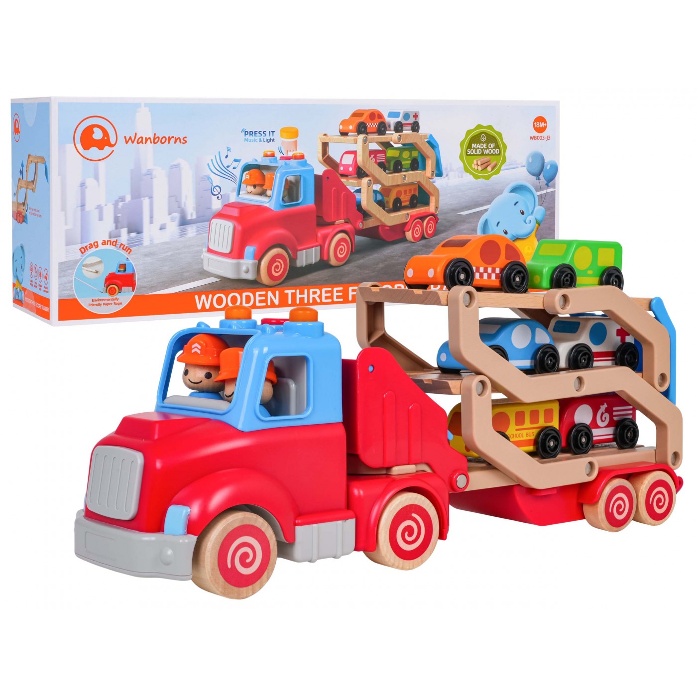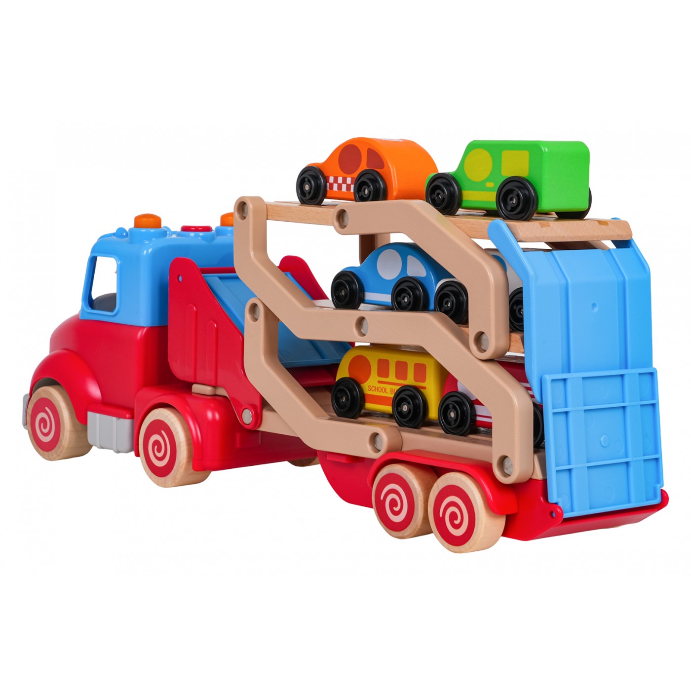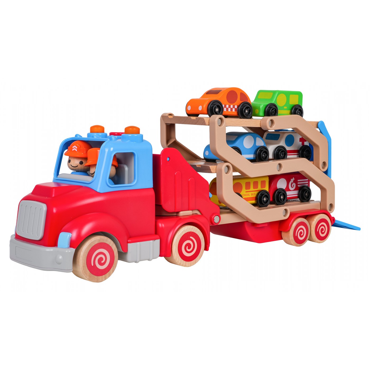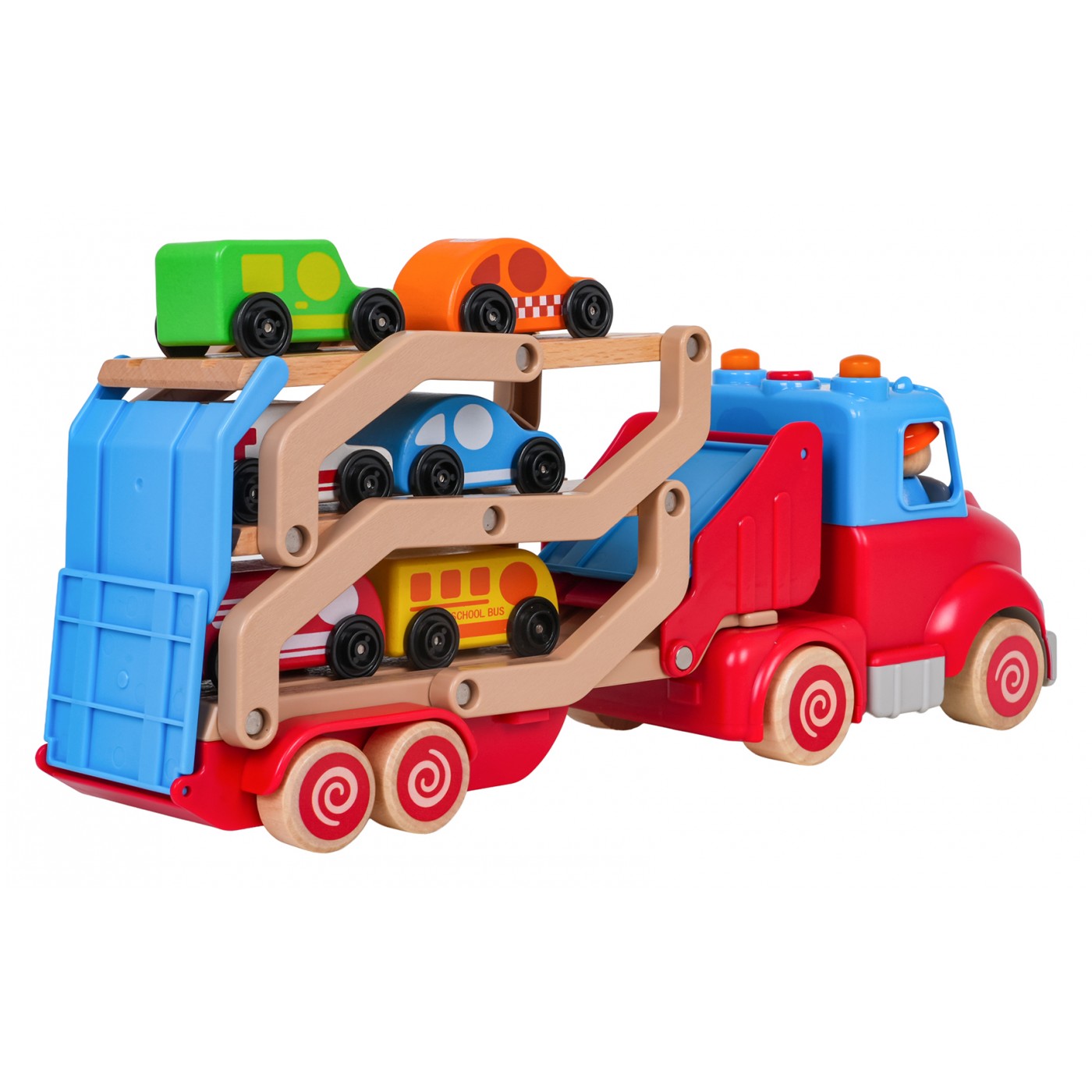 Vlastnosti: - hračka vhodná pre deti od osemnástich mesiacov, - vyrobené z dreva a plastu, - nemá ostré konce, - 6 vozidiel a 2 figúrky postáv sú súčasťou balenia, - zvukové efekty: štartovanie nákladného auta, trúbenie, prehrávanie melódií, - svetelné efekty, dve blikajúce svetlá na streche nákladného auta. |