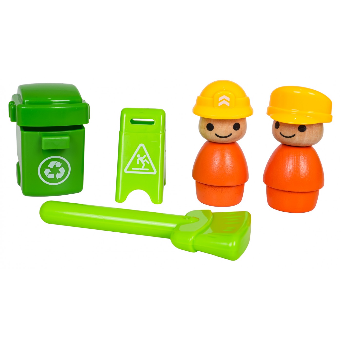 - smetiarske auto, - 2 figúrky, - odpadkový kôš, - výstražné znamenie, - štetec. |