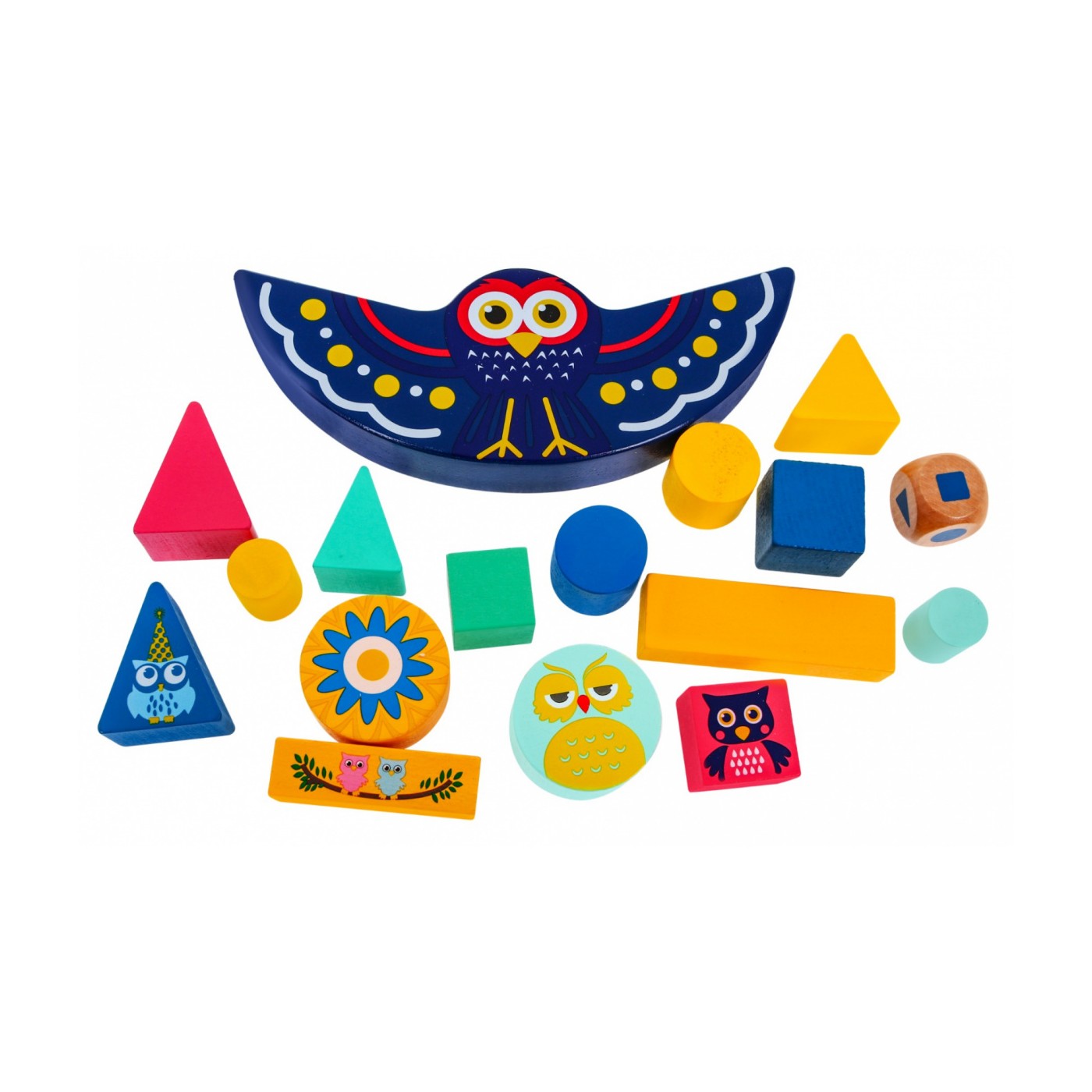 | | - drewniana balansująca sowa (podstawa), - 15 sztuk klocków o różnych kształtach i kolorach, - kostka. |