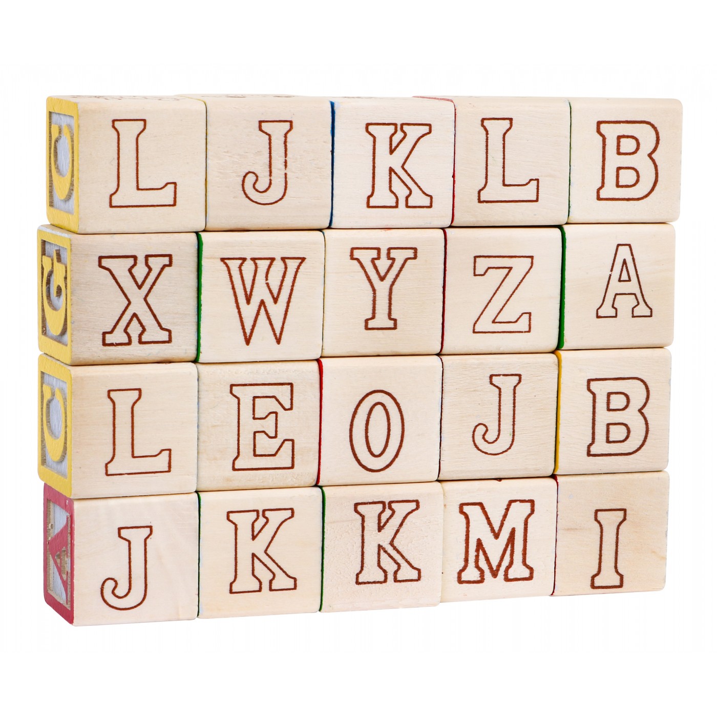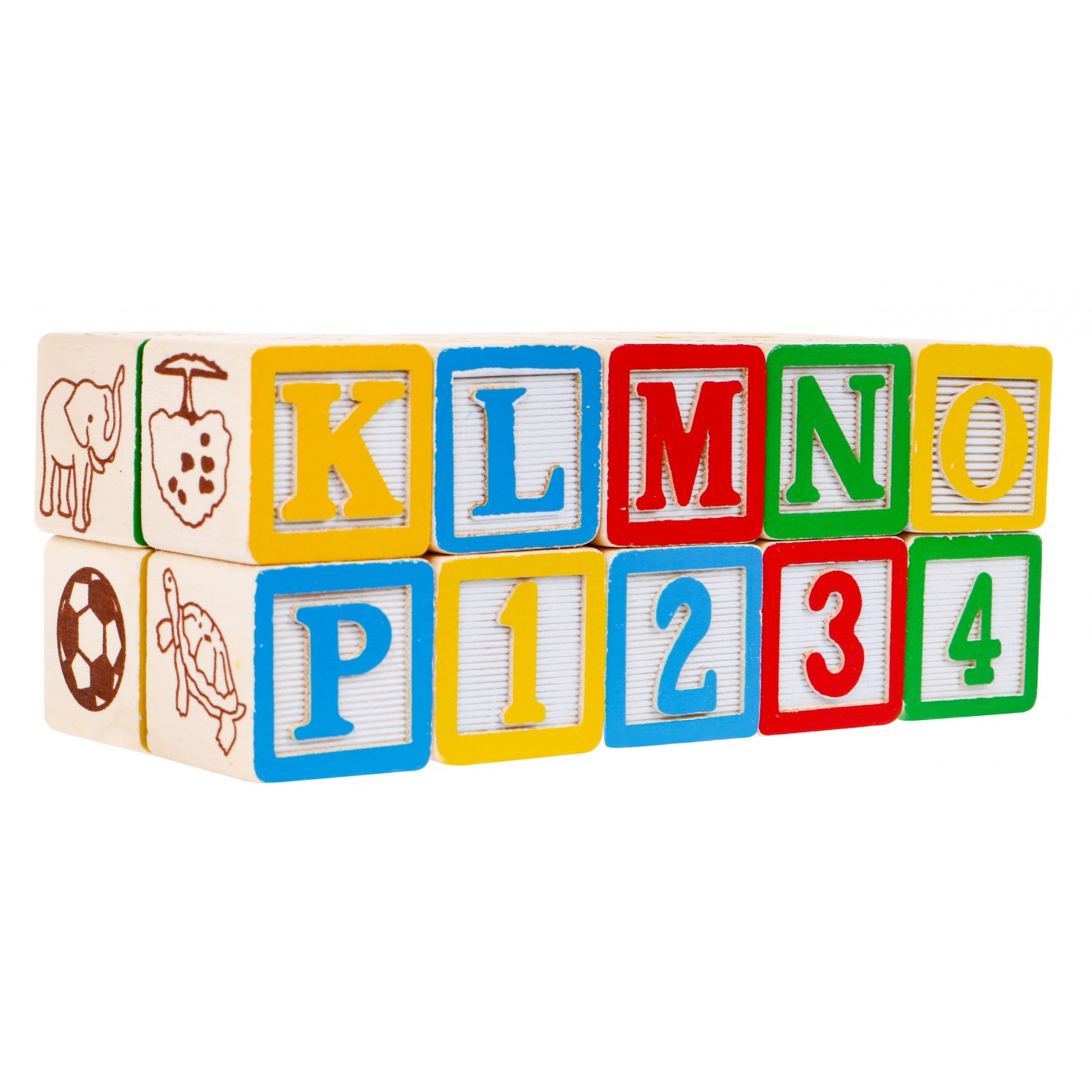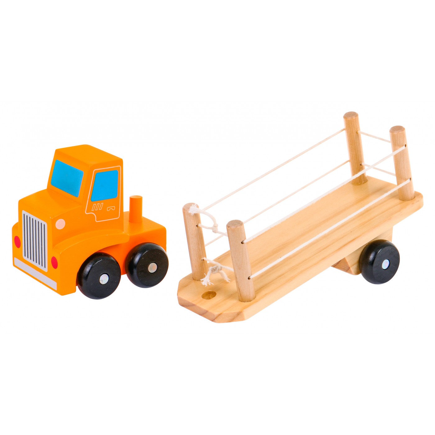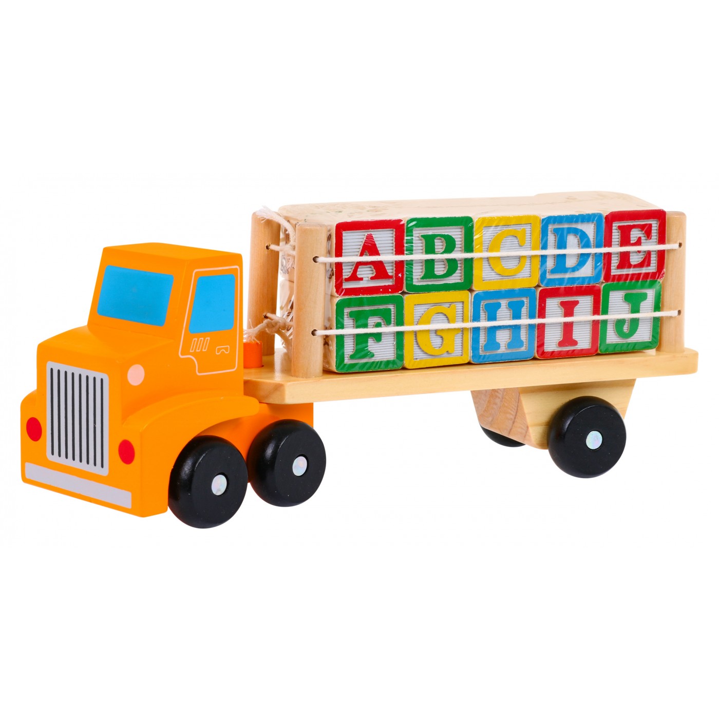 | - ciężarówka z odczepiana lawetą, - 20 drewnianych klocków z rysunkami i literami alfabetu. |