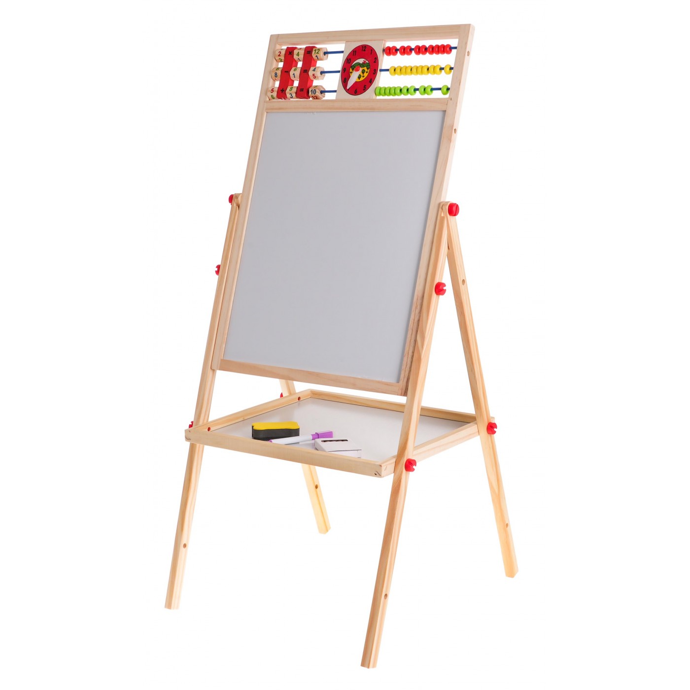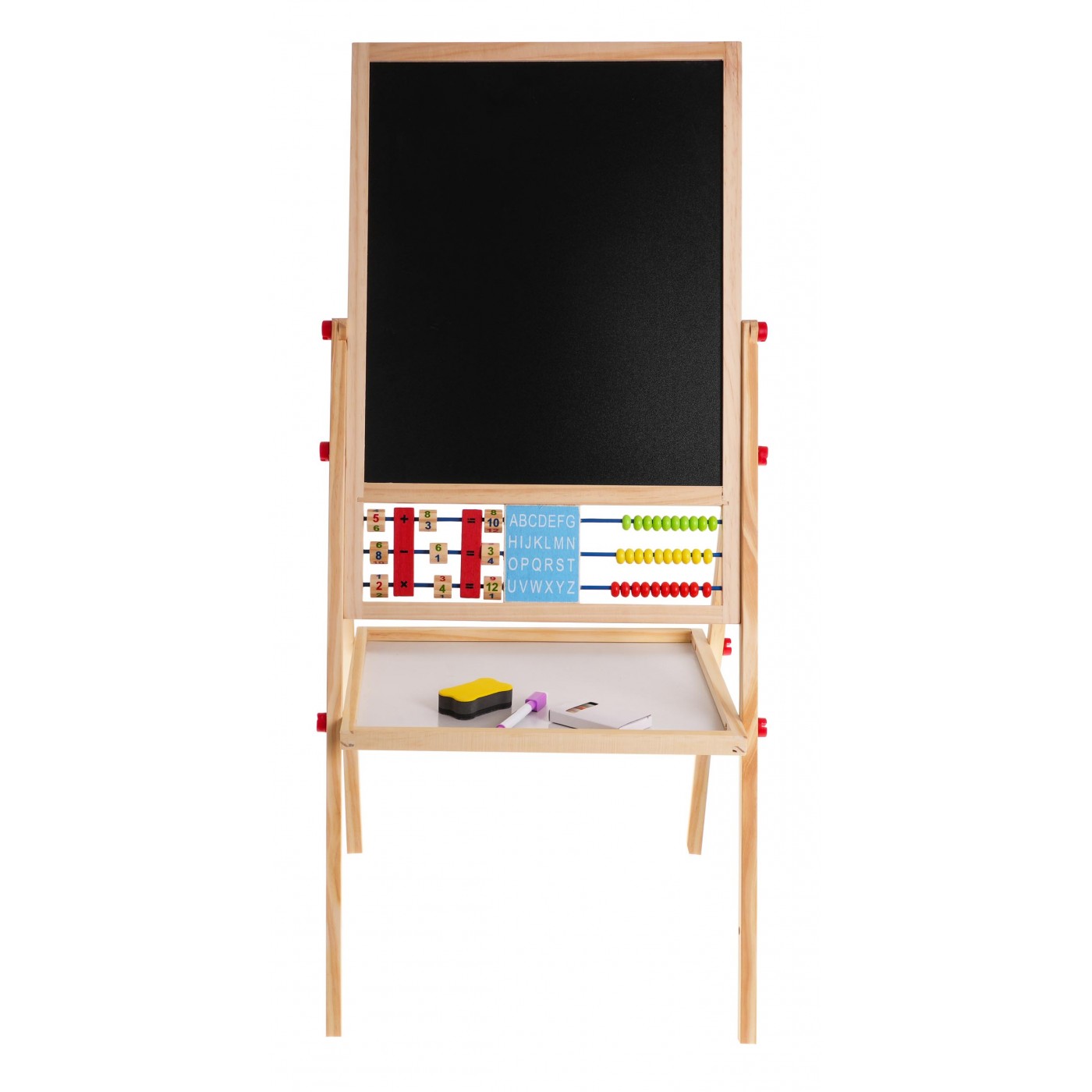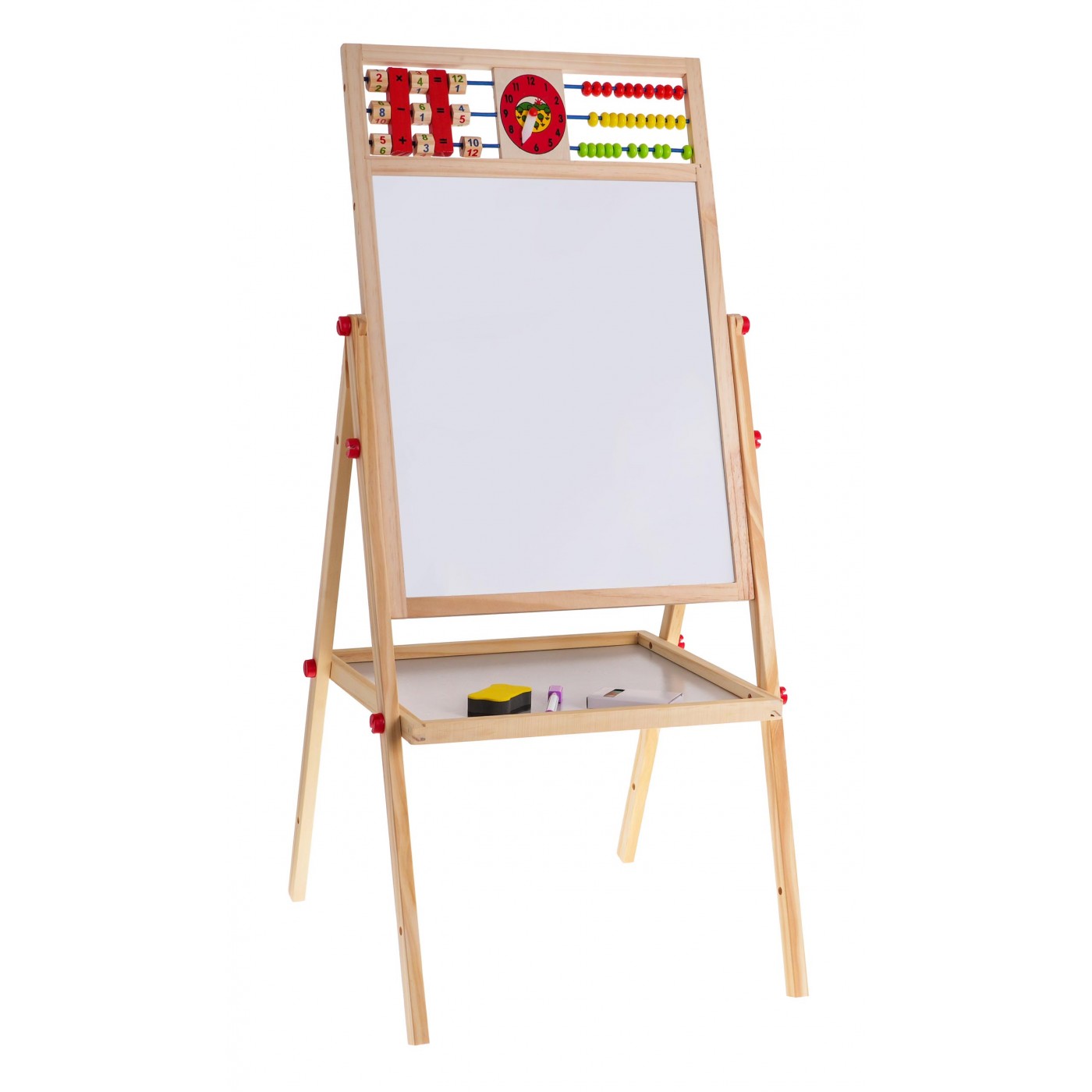 | Duża drewniana tablica to zabawka edukacyjna dla dzieci od 3 – go roku życia. Tablica jest z jednej strony biała magnetyczna, a z drugiej czarna kredowa. Biała strona służy do pisania pisakiem znajdującym się w zestawie. Pisak posiada magnez, żeby go można było przyczepić do tablicy oraz gumkę do mazania. Na czarnej stronie można malować kredą znajdującą się w zestawie, a potem wymazać wszystko gąbką. Zabawa z tablicą pozytywnie wpływa na zdolności manualne, koncentrację i wyobraźnię. | |