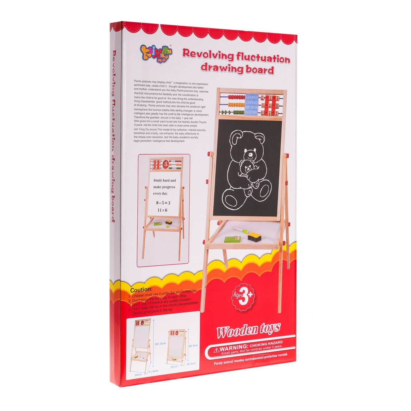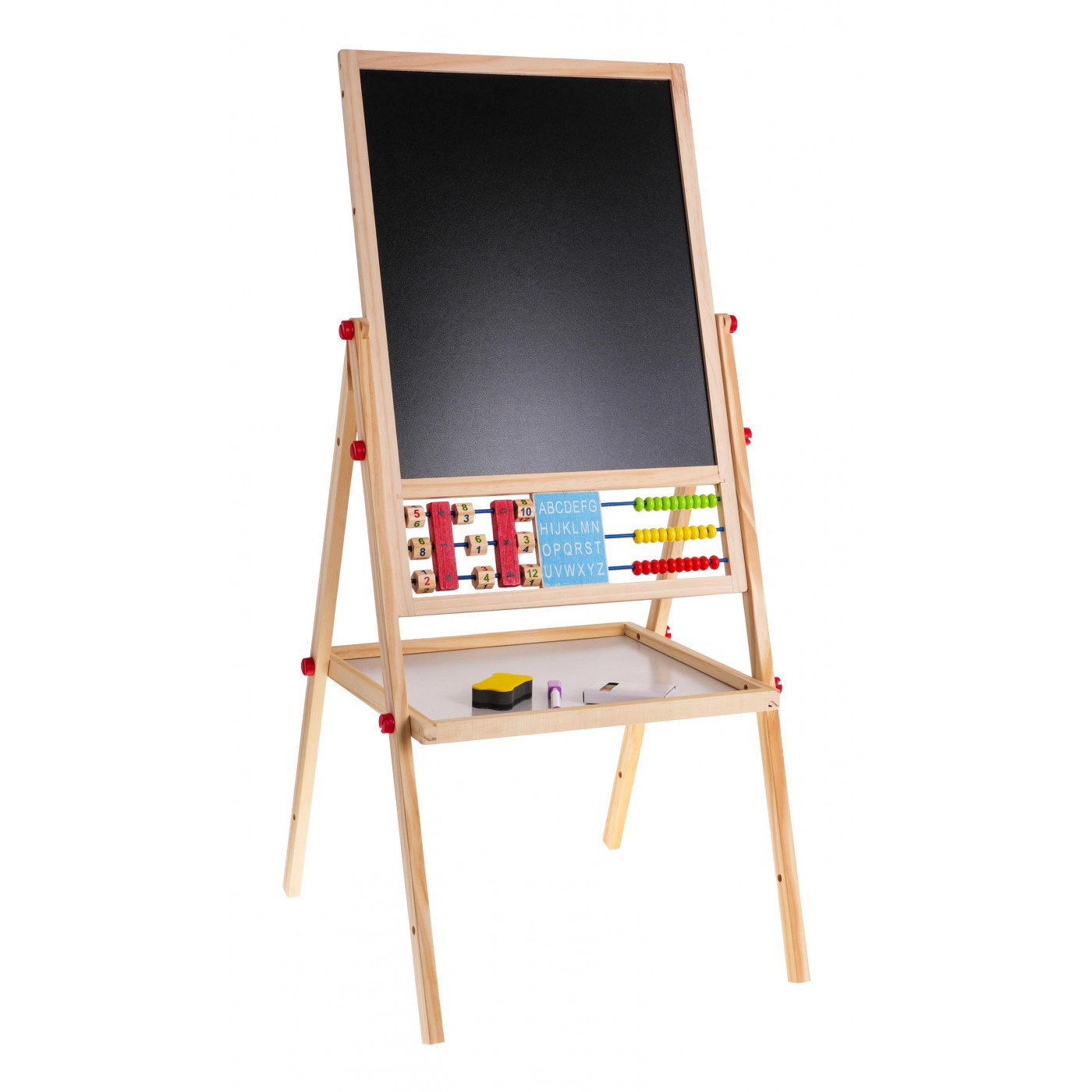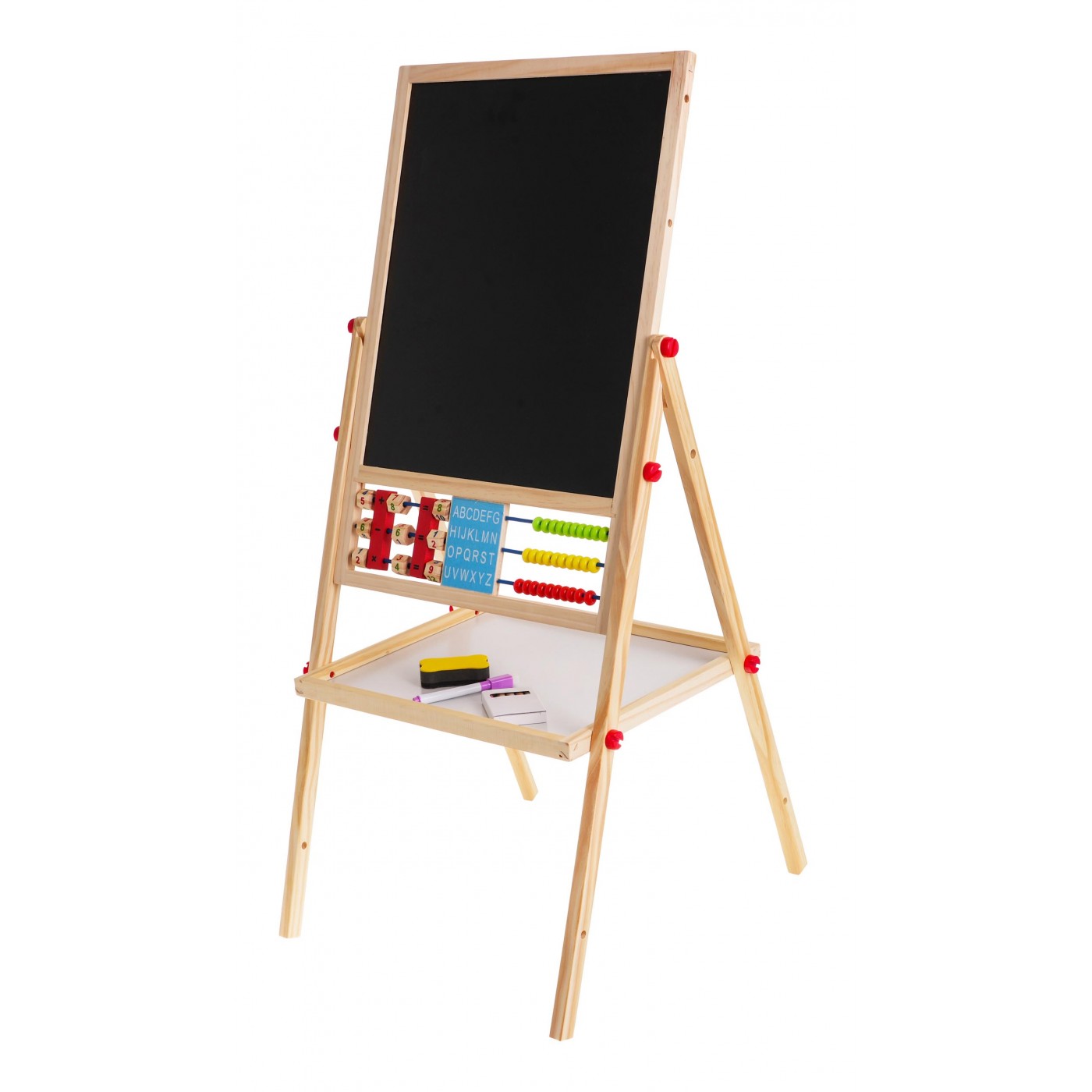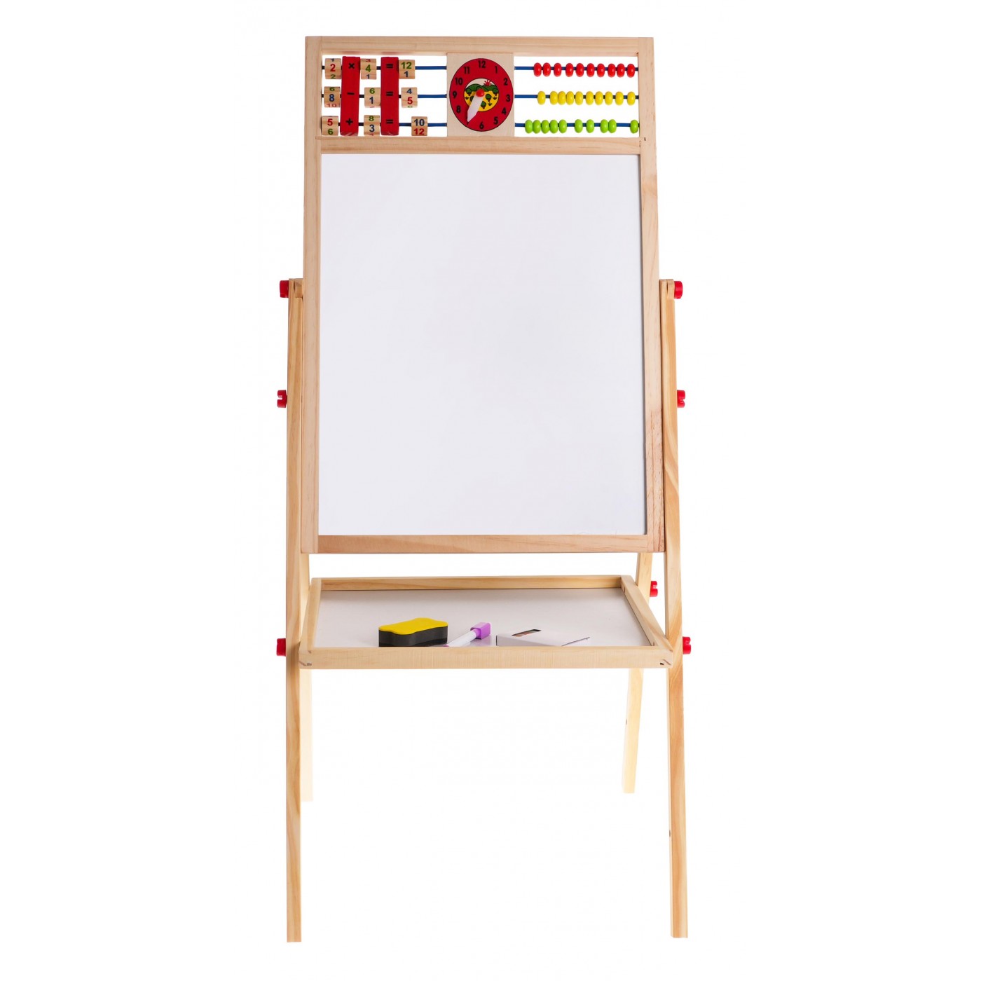 | Duża drewniana tablica to zabawka edukacyjna dla dzieci od 3 – go roku życia. Tablica jest z jednej strony biała magnetyczna, a z drugiej czarna kredowa. Biała strona służy do pisania pisakiem znajdującym się w zestawie. Pisak posiada magnez, żeby go można było przyczepić do tablicy oraz gumkę do mazania. Na czarnej stronie można malować kredą znajdującą się w zestawie, a potem wymazać wszystko gąbką. Zabawa z tablicą pozytywnie wpływa na zdolności manualne, koncentrację i wyobraźnię. | |