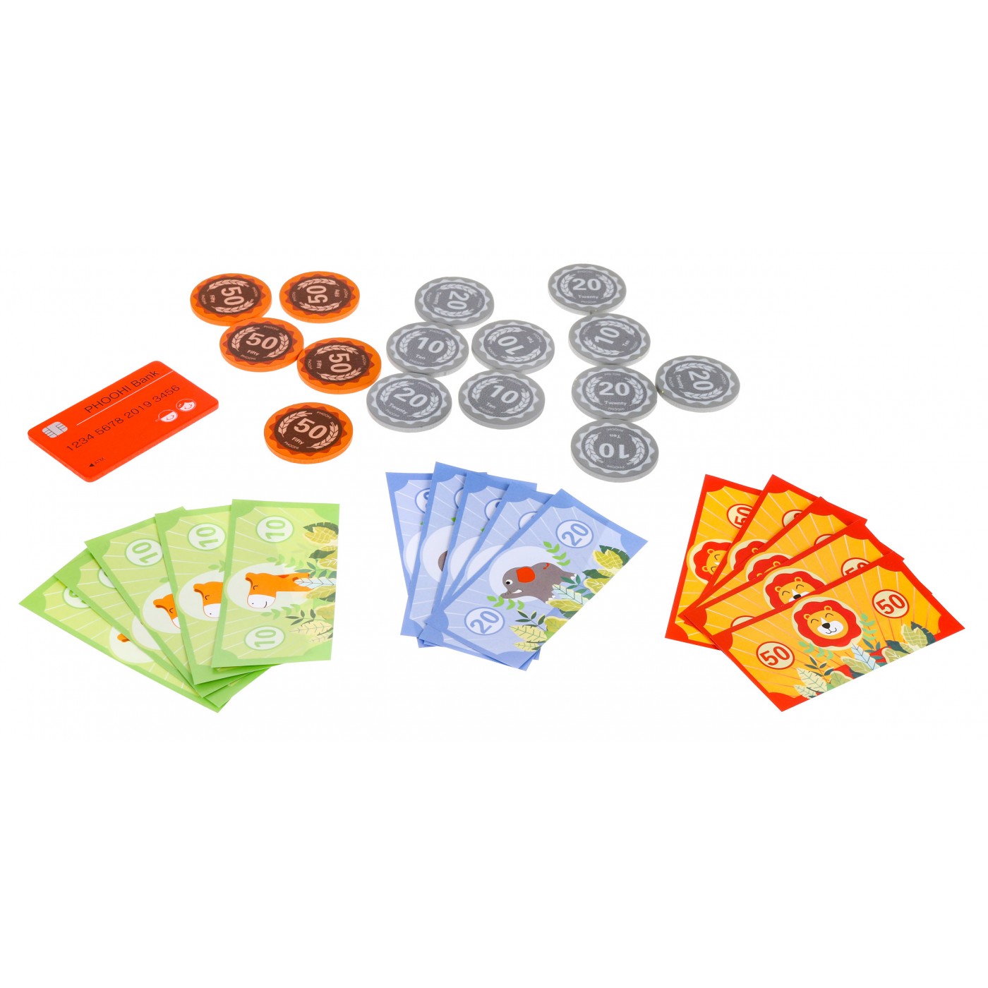 | - kasa z otwieraną szufladą, - liczydło, - terminal płatniczy, - skaner kodów kreskowych, - 10 banknotów, - rolka do kasy fiskalnej, - karta płatnicza, - 15 monet. |