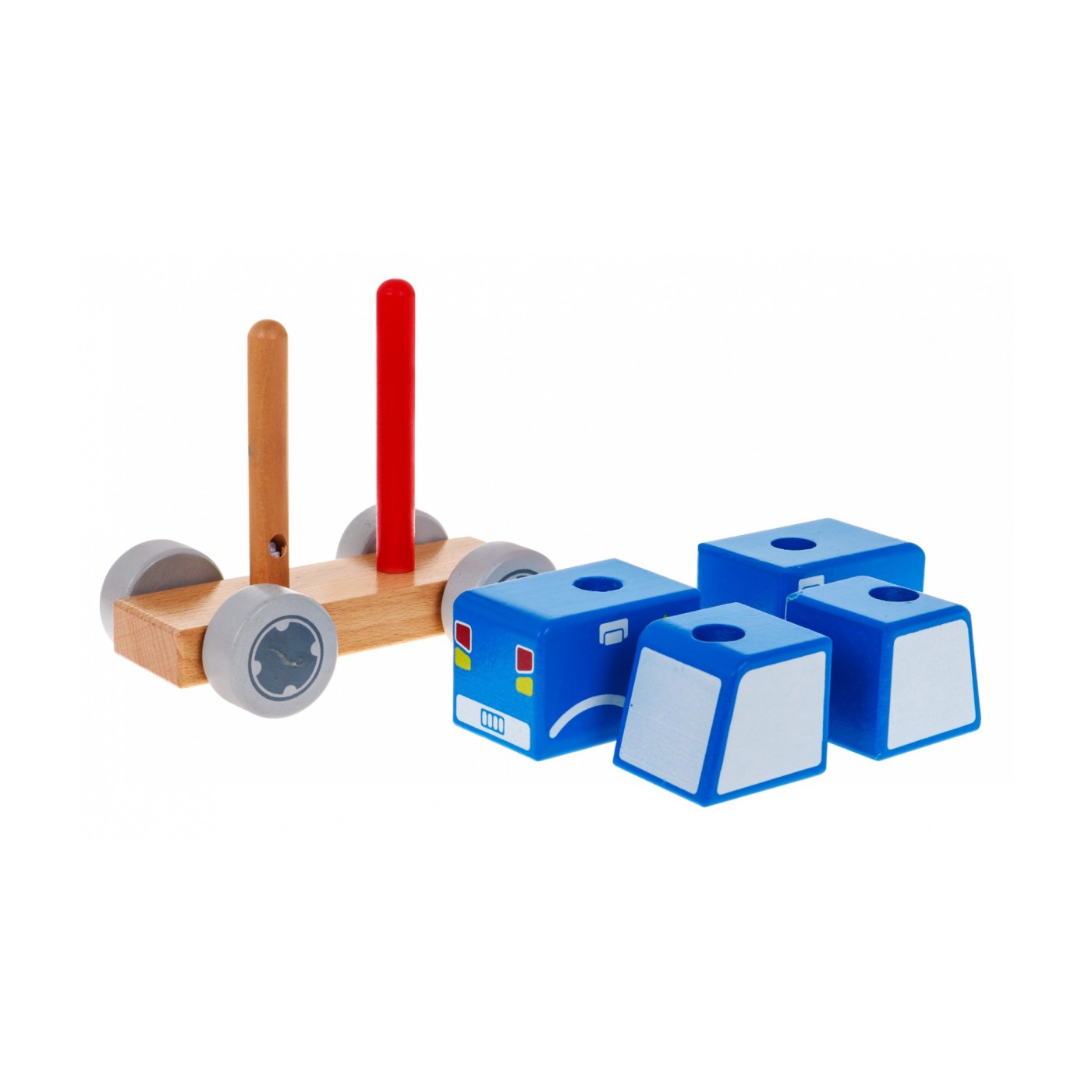| - 4 klocuszki, - podstawka z drewnianymi kołeczkami, - 4 ruchome kółeczka. |