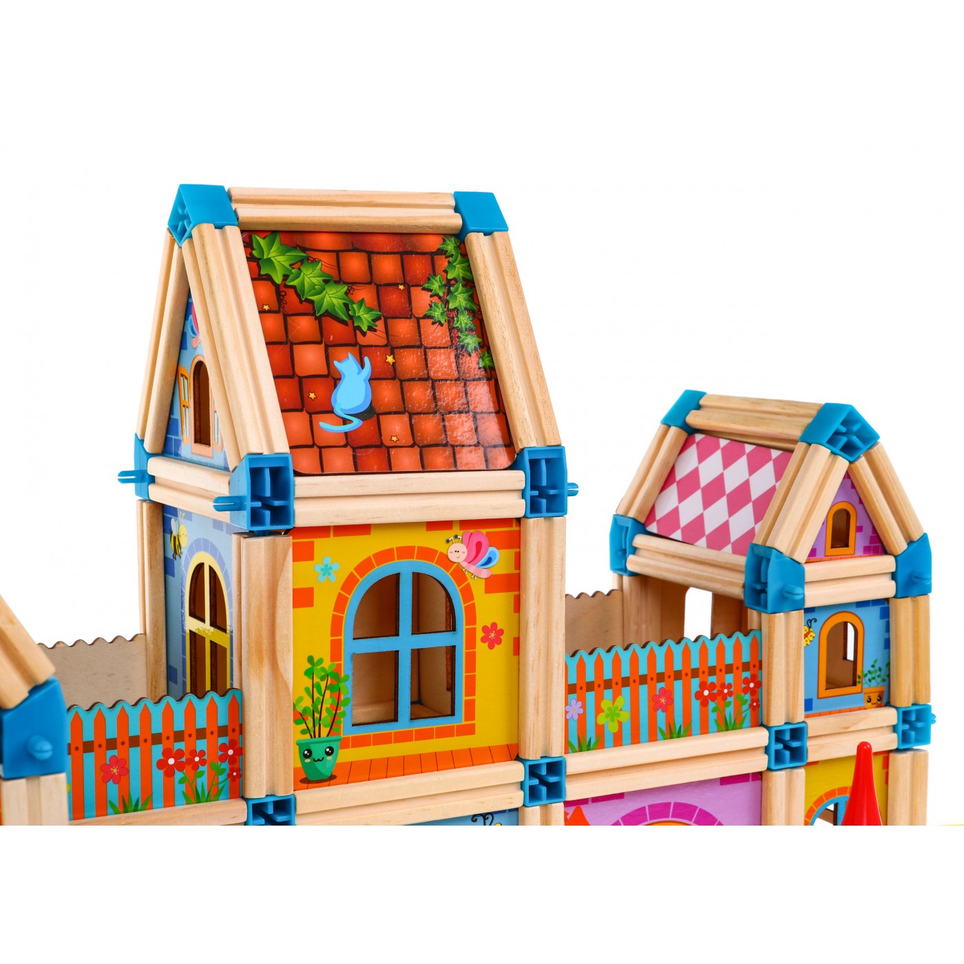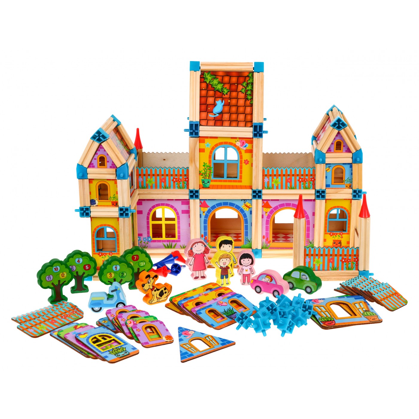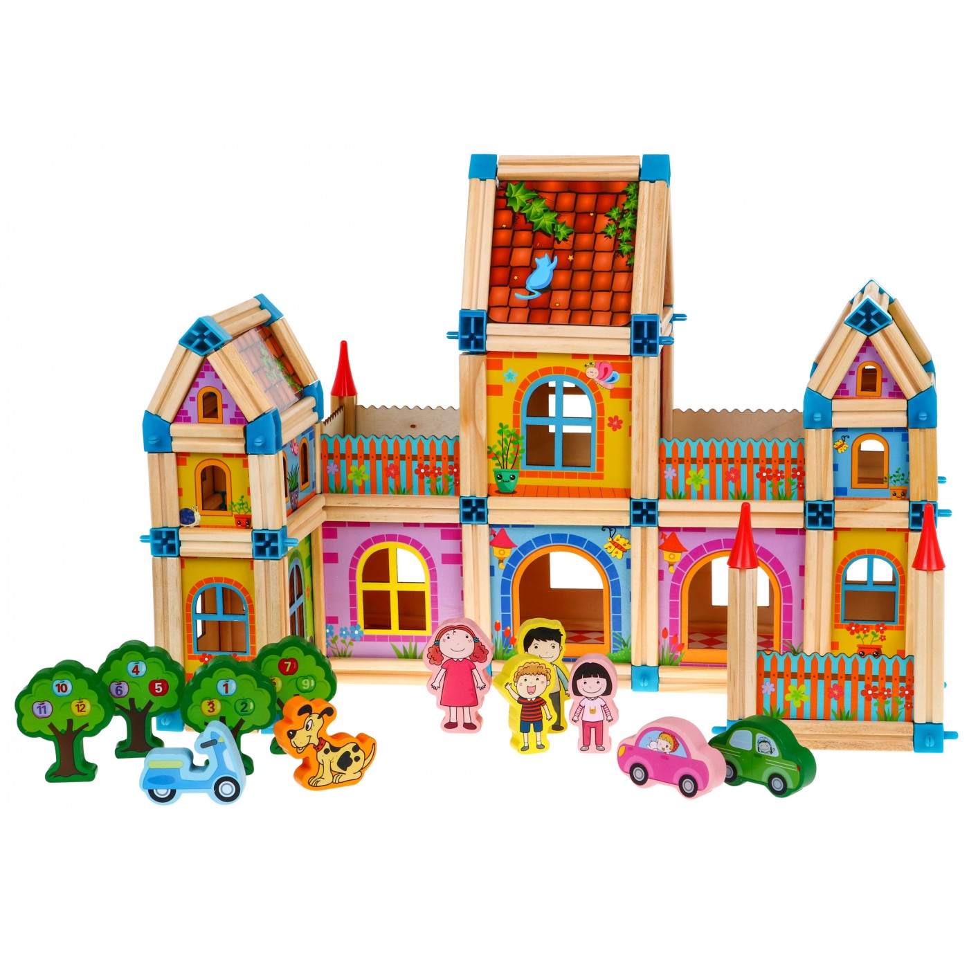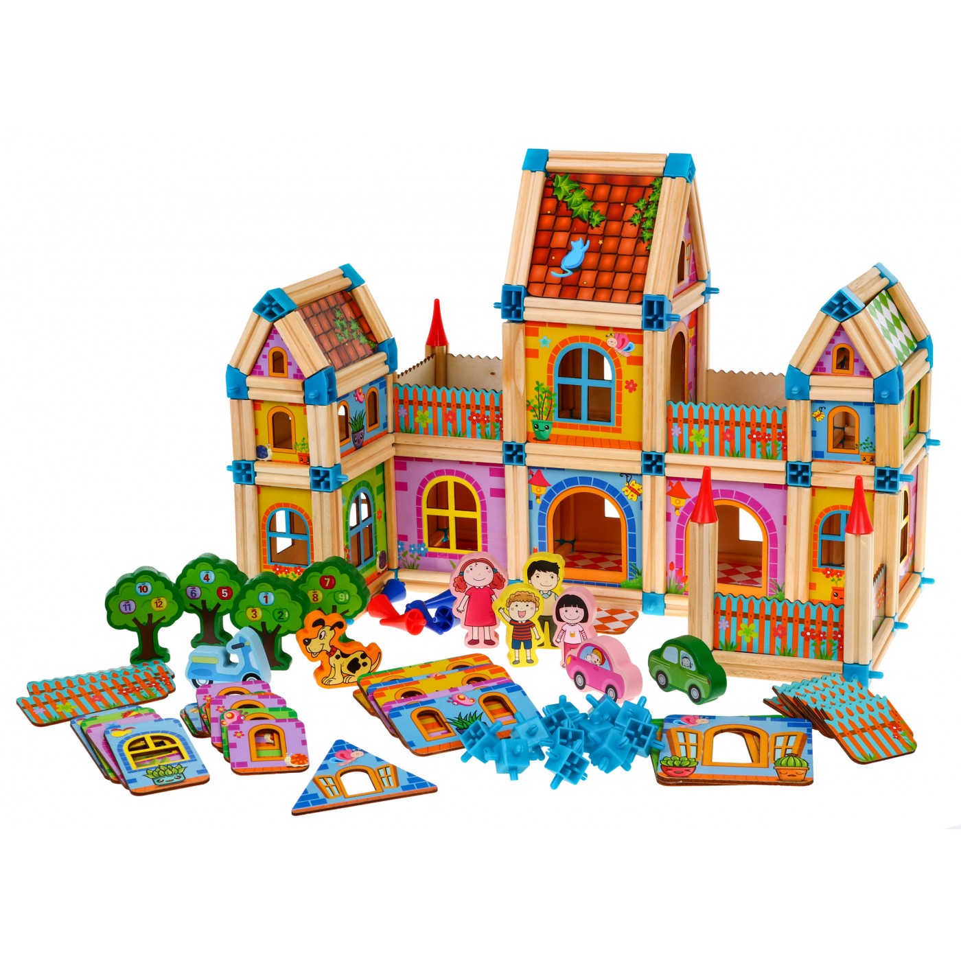 | | Zestaw drewnianych, kolorowych i bezpiecznych klocków dla dzieci od 3-go roku życia. Pakiet składa się z 268 elementów, które po ułożeniu tworzą kolorowe drewniane domki. Prócz elementów konstrukcyjnych w zestawie znaleźć możemy również klocki w kształcie drzewa, z postaciami czy autami, jest też obrazkowa instrukcja. |