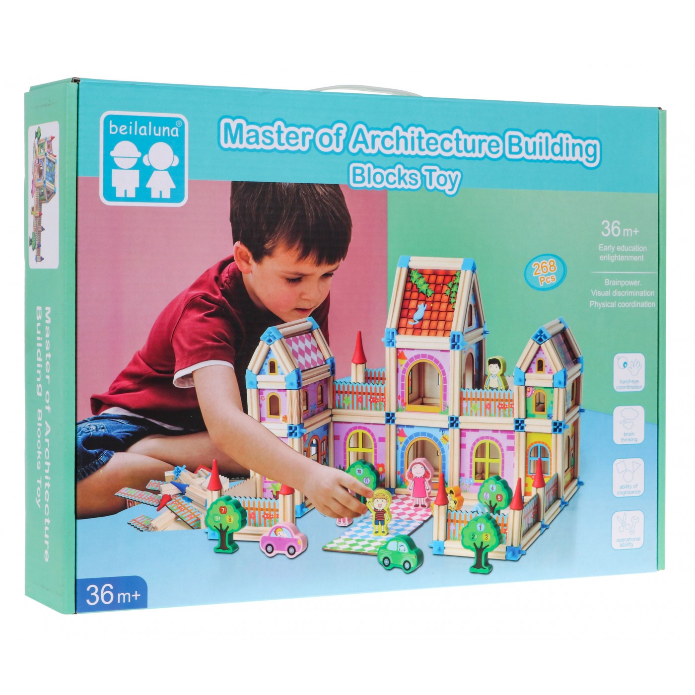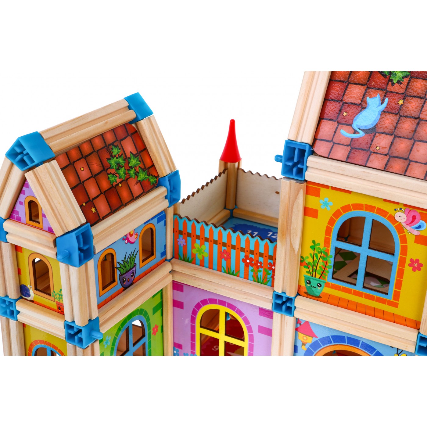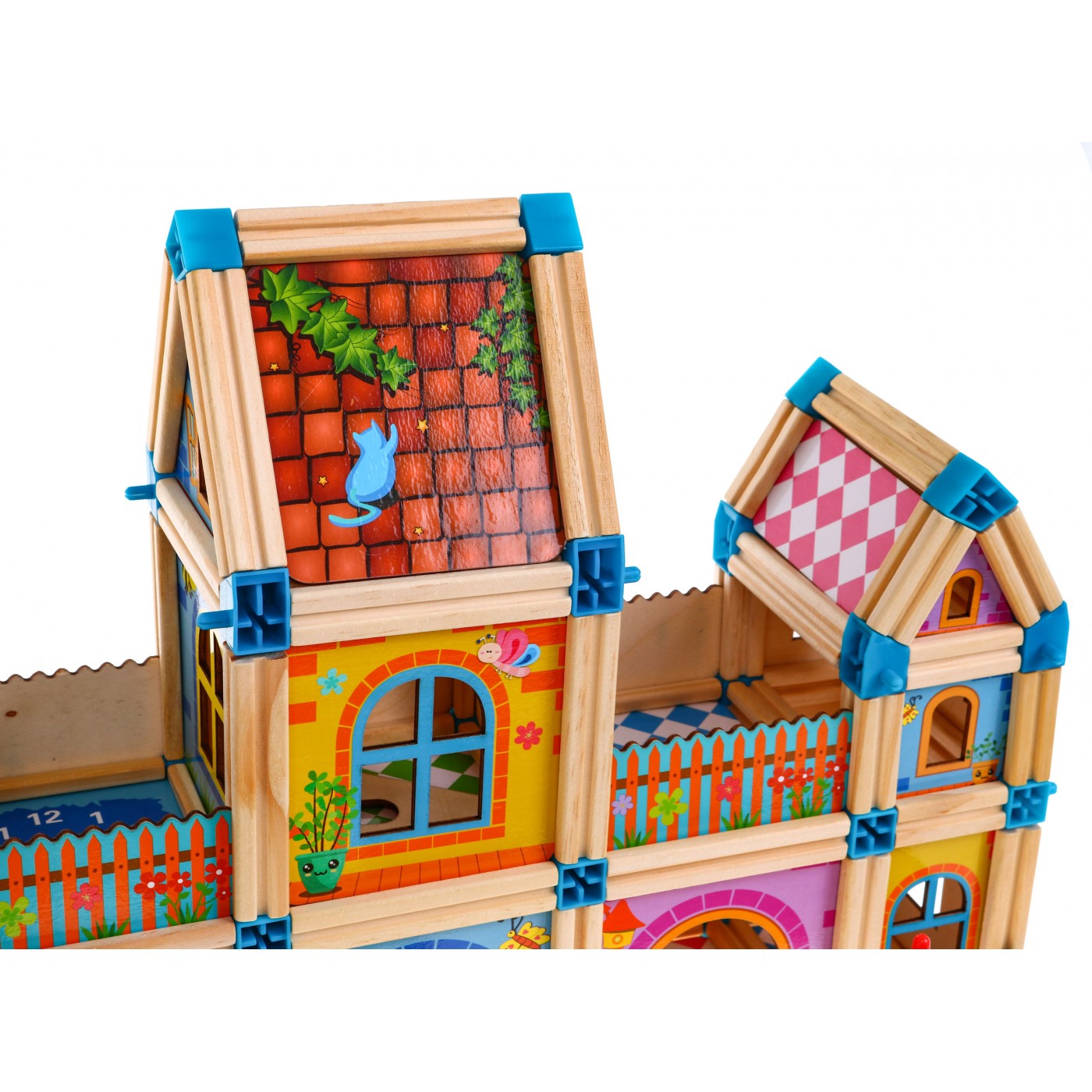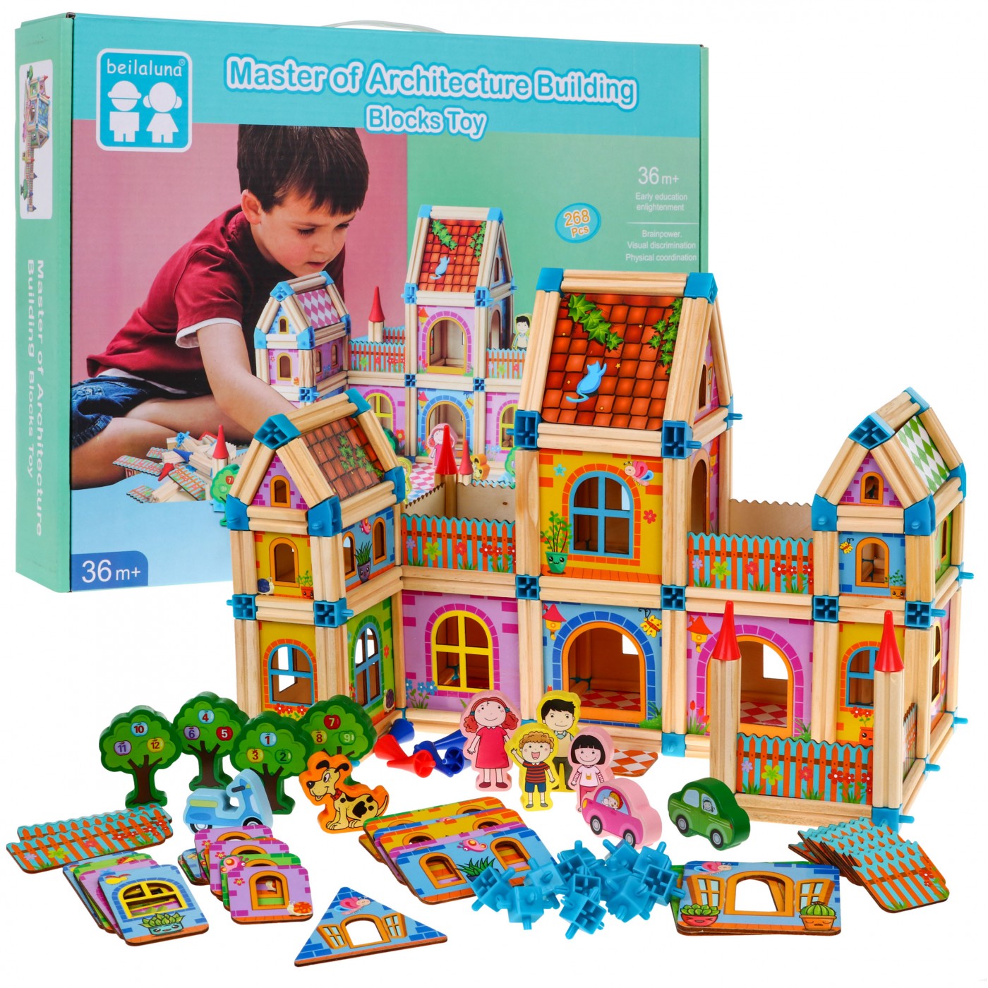 | | Zestaw drewnianych, kolorowych i bezpiecznych klocków dla dzieci od 3-go roku życia. Pakiet składa się z 268 elementów, które po ułożeniu tworzą kolorowe drewniane domki. Prócz elementów konstrukcyjnych w zestawie znaleźć możemy również klocki w kształcie drzewa, z postaciami czy autami, jest też obrazkowa instrukcja. |