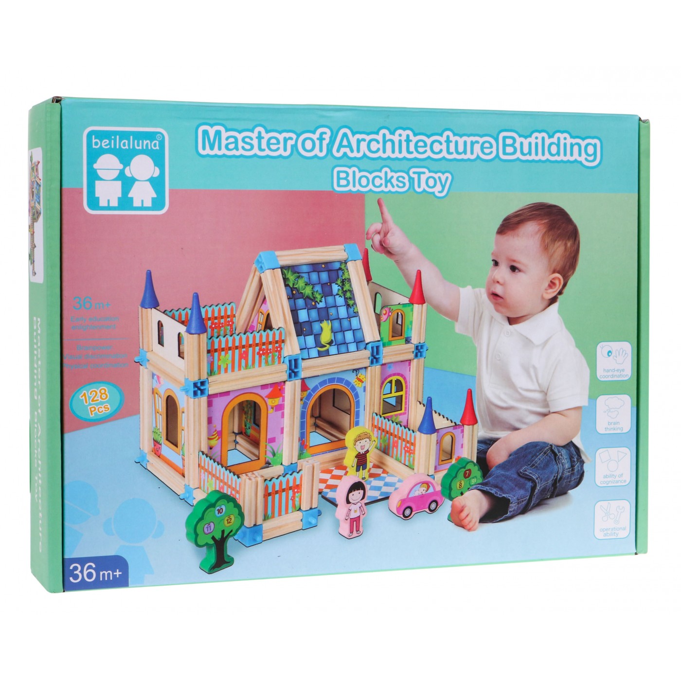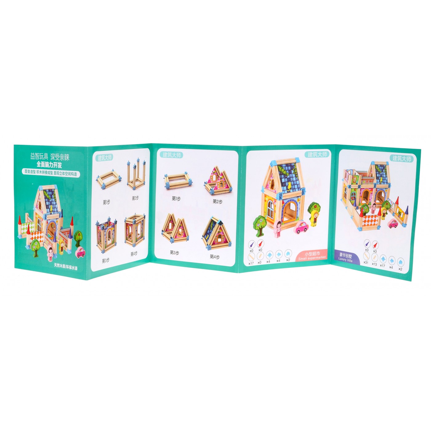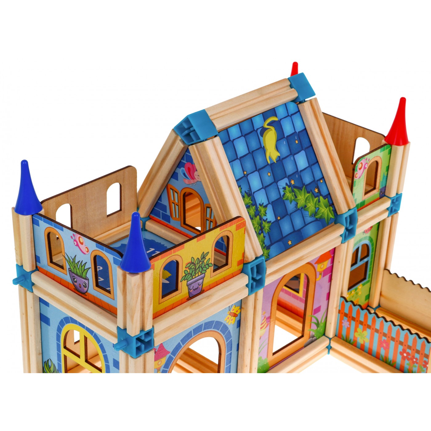 | Zestaw drewnianych, kolorowych i bezpiecznych klocków dla dzieci od 3-go roku życia. Pakiet składa się z 128 elementów, które po ułożeniu tworzą kolorowe drewniane domki. Prócz elementów konstrukcyjnych w zestawie znaleźć możemy również klocki w kształcie drzewa, z postaciami chłopca i dziewczynki oraz autami, jest też obrazkowa instrukcja. | |