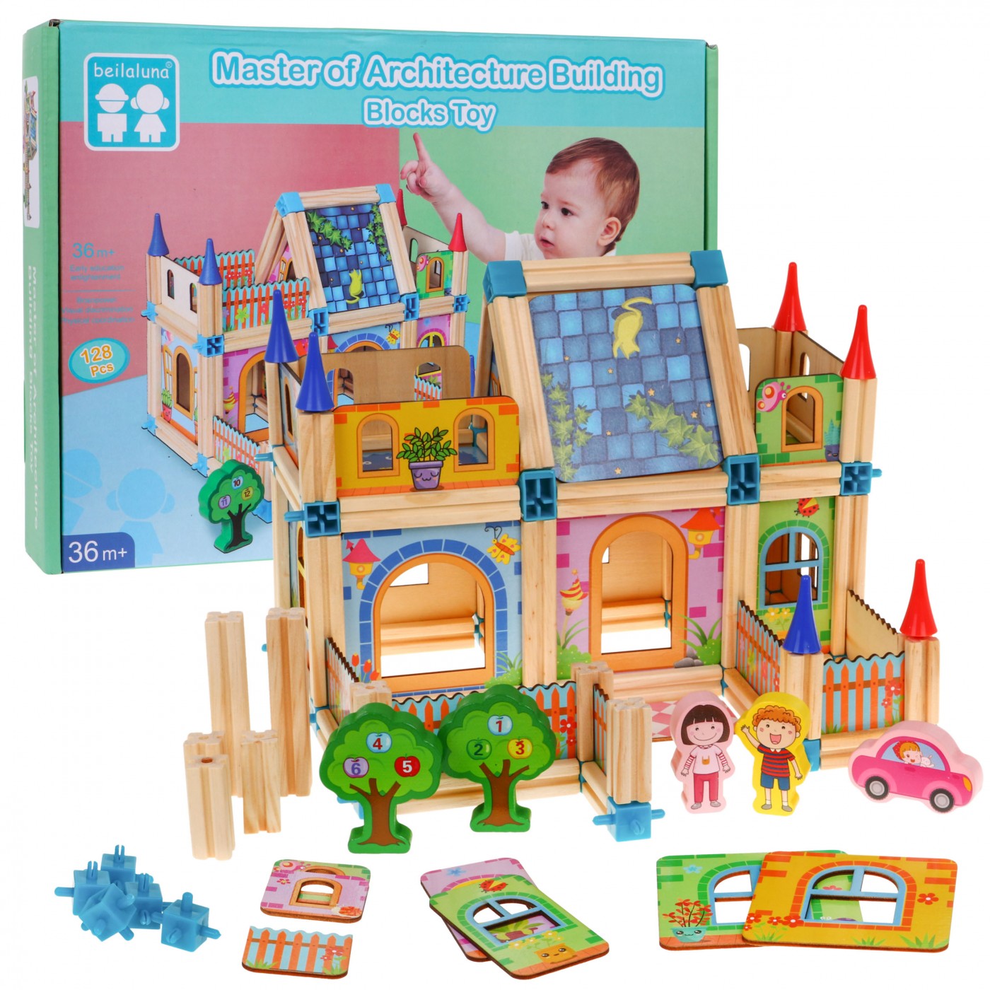 Drevené stavebnicové kocky pre deti 3+ Farebná sada 128 ks. na stavbu domčeka