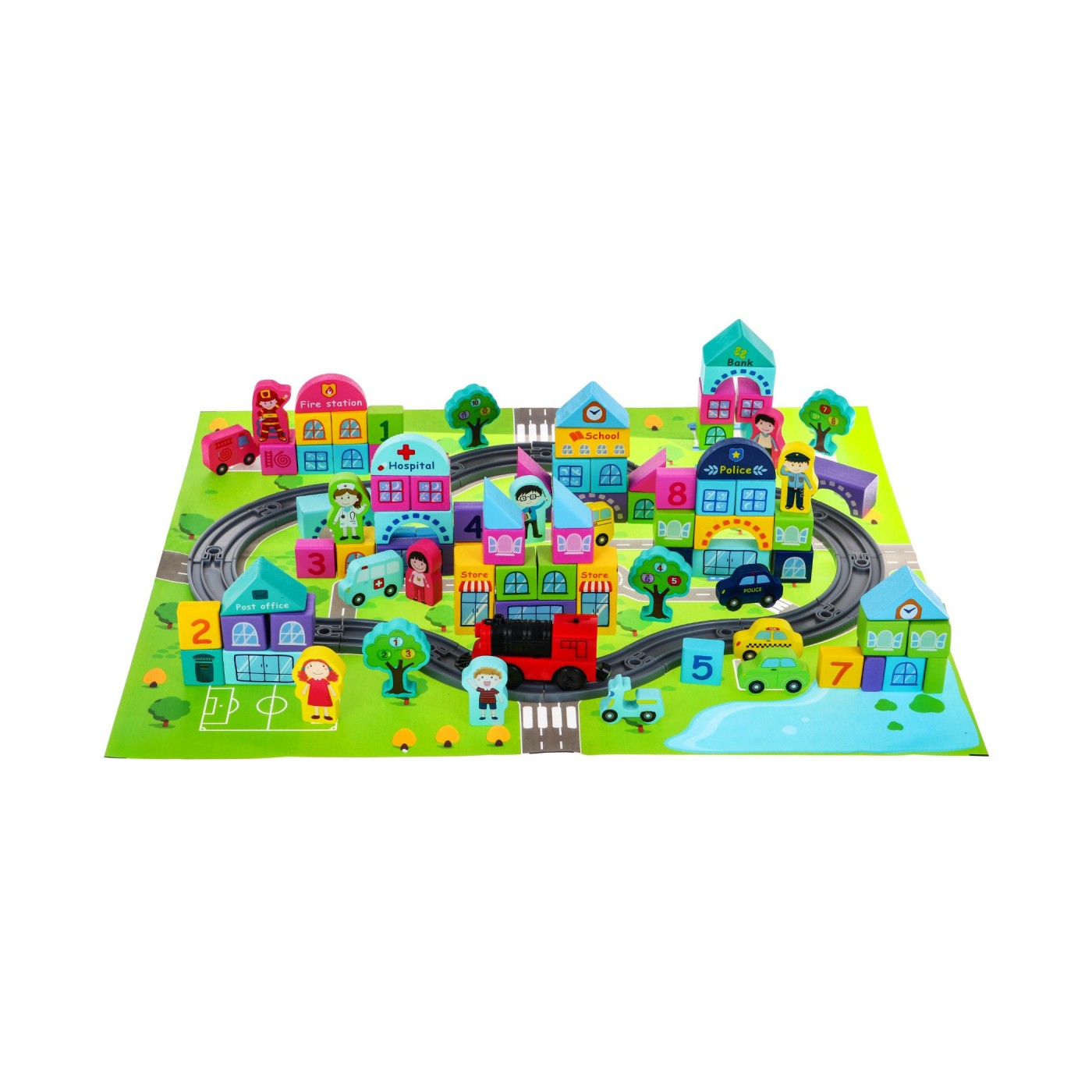 Drevené Kocky "Moje Mesto" pre deti 3+ Sada 107 ks. + Mesto mat + Vláčikové koľaje + Vláčik