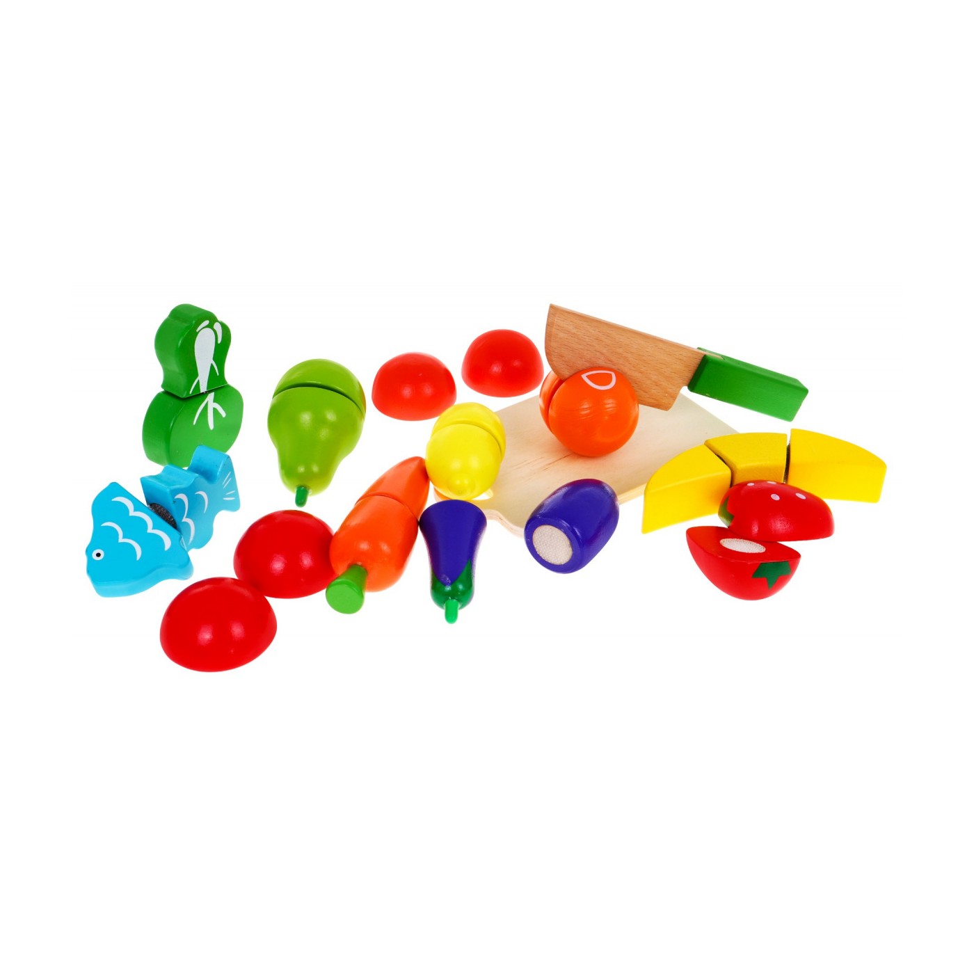 | | - pomidor, - marchewka, - bakłażan, - sałata, - truskawka, - 2 x pomarańcz, - cytryna, - gruszka, - banan, - rybka, - deska do krojenia, - nożyk drewniany, - pudełko z rączką do przenoszenia. |